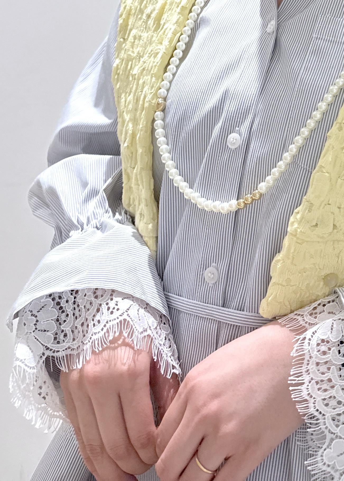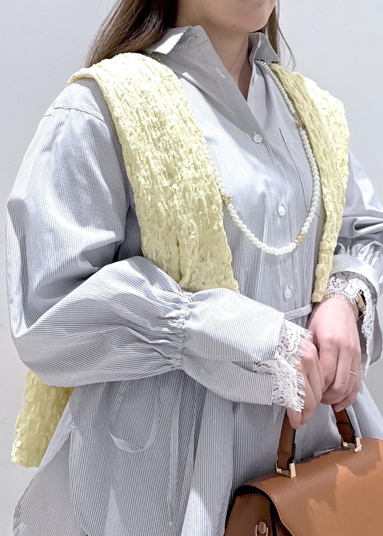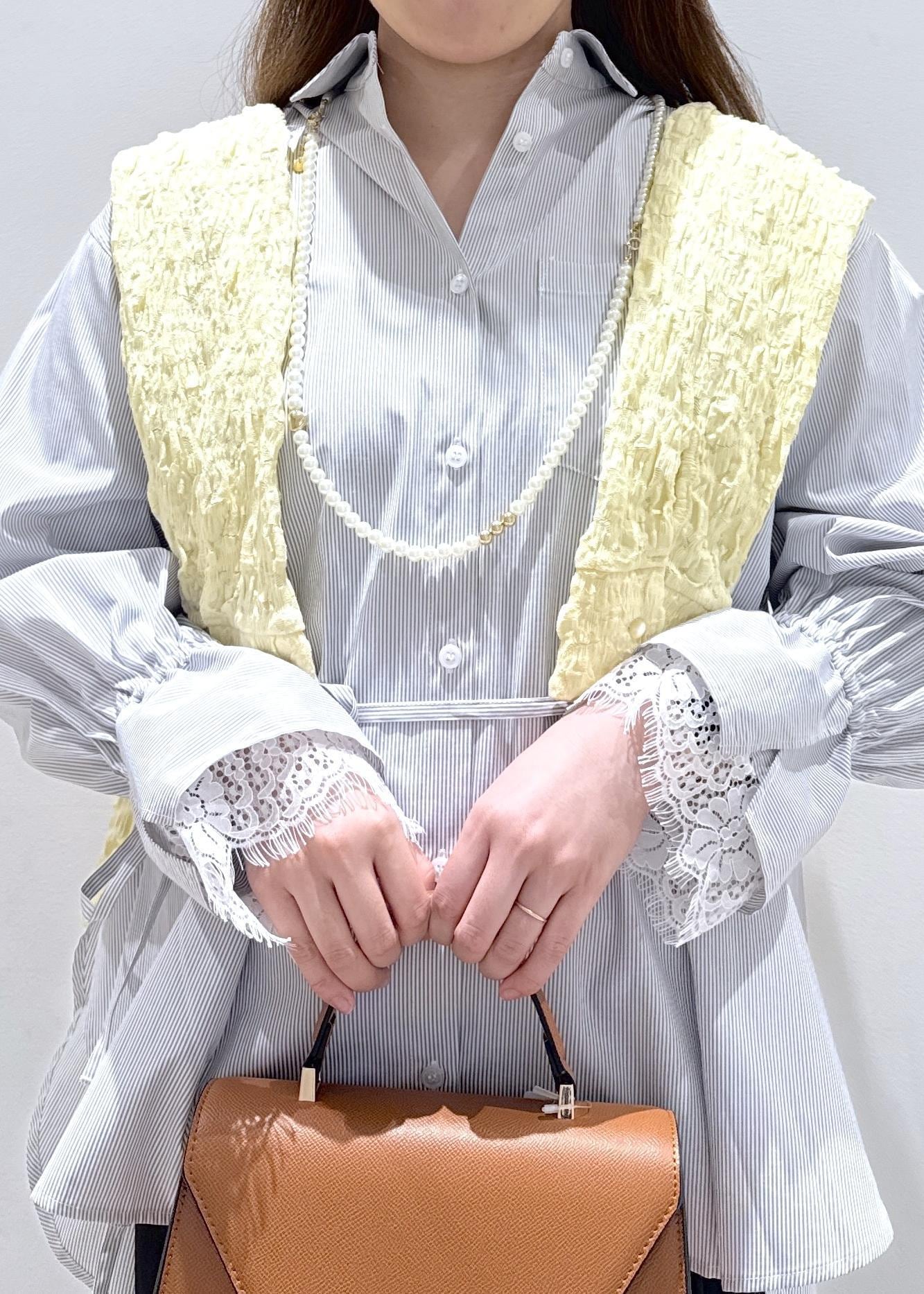 今回は新作で入荷しました、襟元がドッキングでレース素材でつくられているストライプ柄のシャツに、ワイドパンツと合わせてカジュアルなコーディネートにしてみました。これから春先に向けて黄色のカーディガンを差し色をポイントに◎