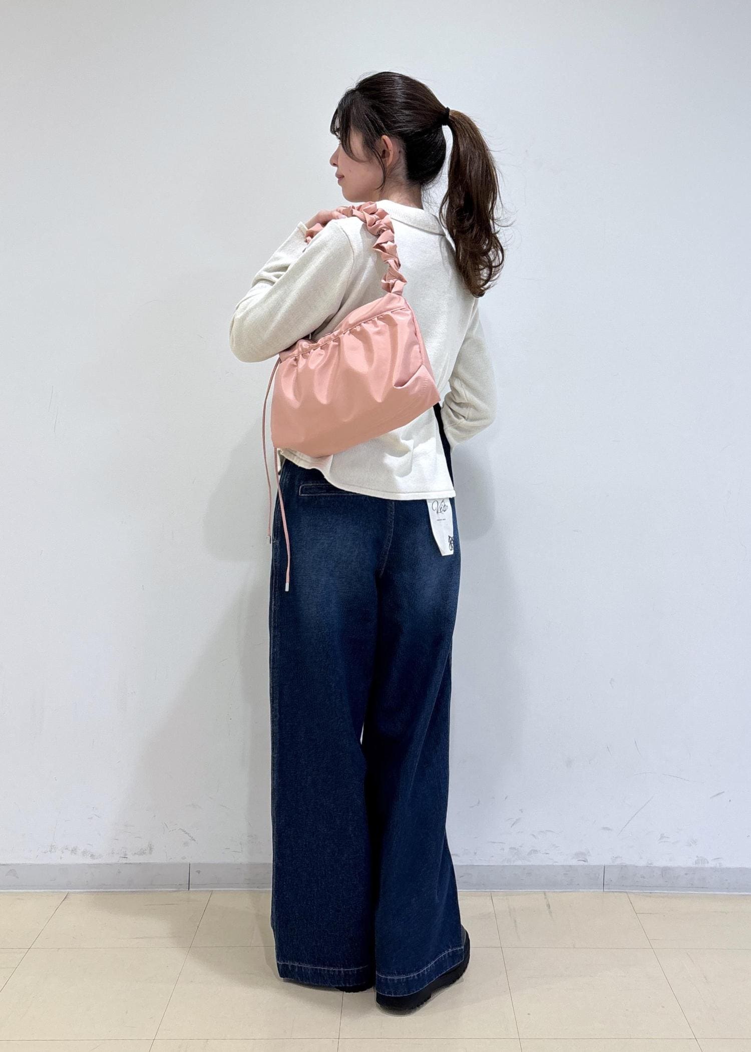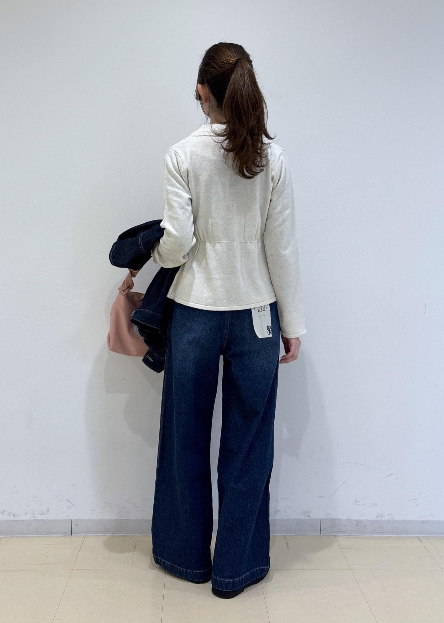 パンツのワイドシルエットでゆったり感があるので、トップスはスッキリに見えるギャザーカーディガンを選びました。ペプラムデザインで腰まわりのカバーも叶います!