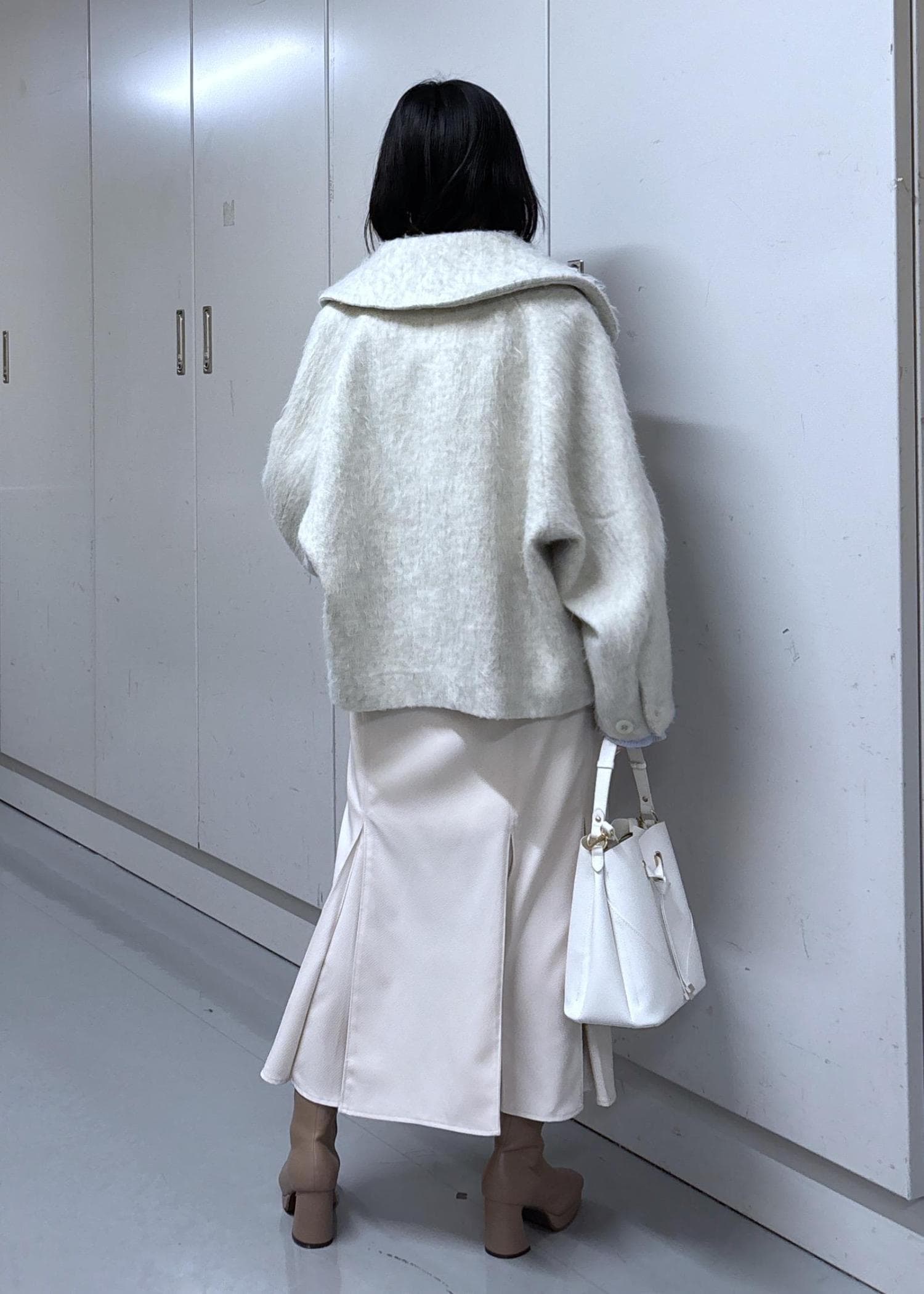 VIS【アウター総選挙1位】ビッグカラーモモンガシャギーショートコートオフホワイト / S¥6,593レビュー155cm、Sサイズ着用。おしりは隠れている気がします。
