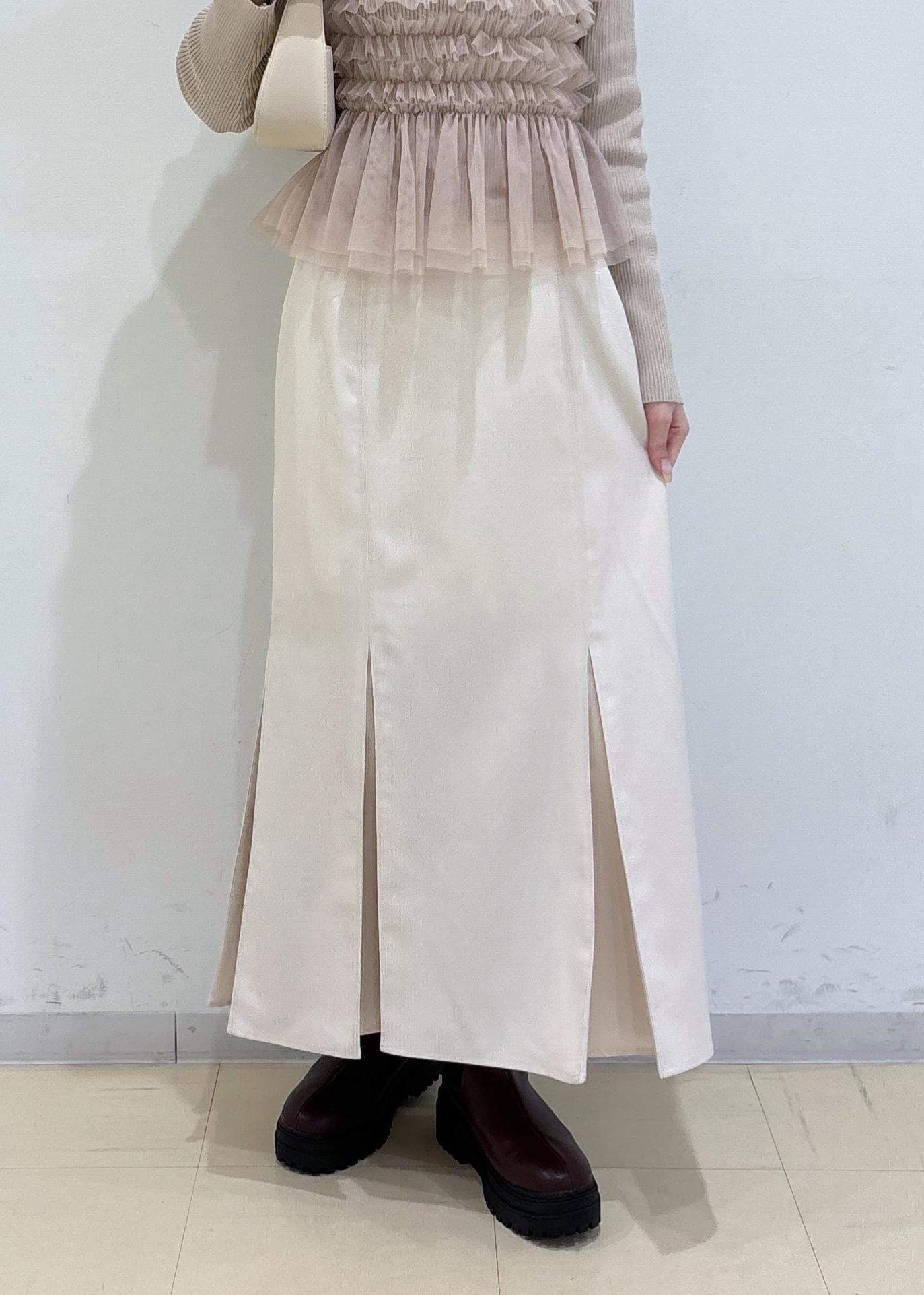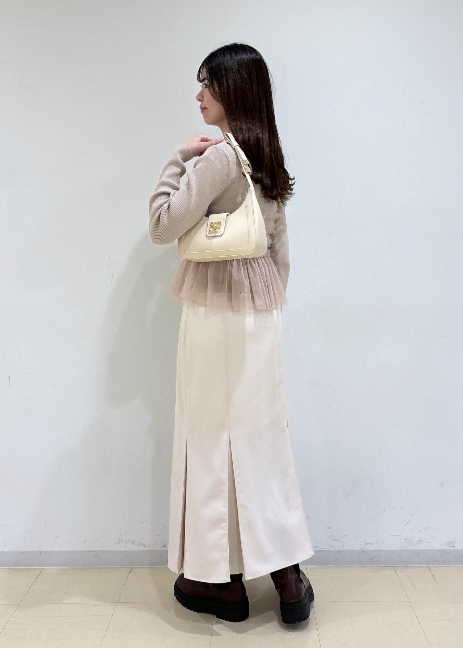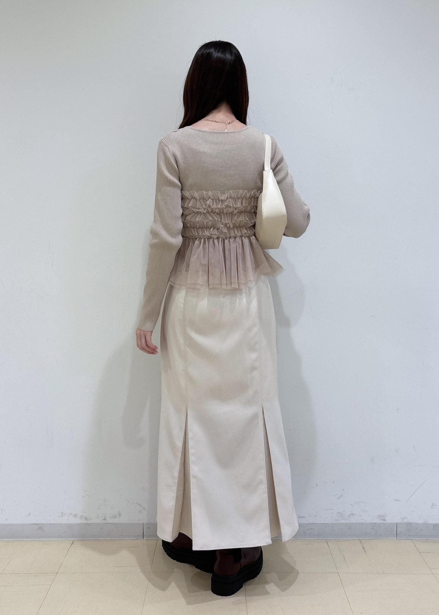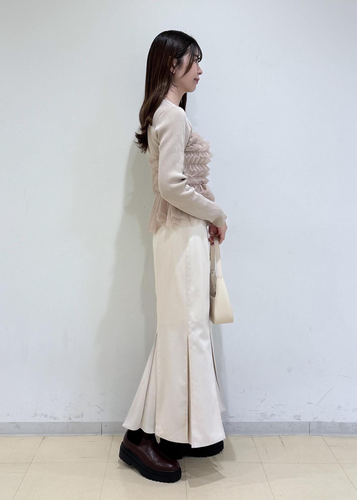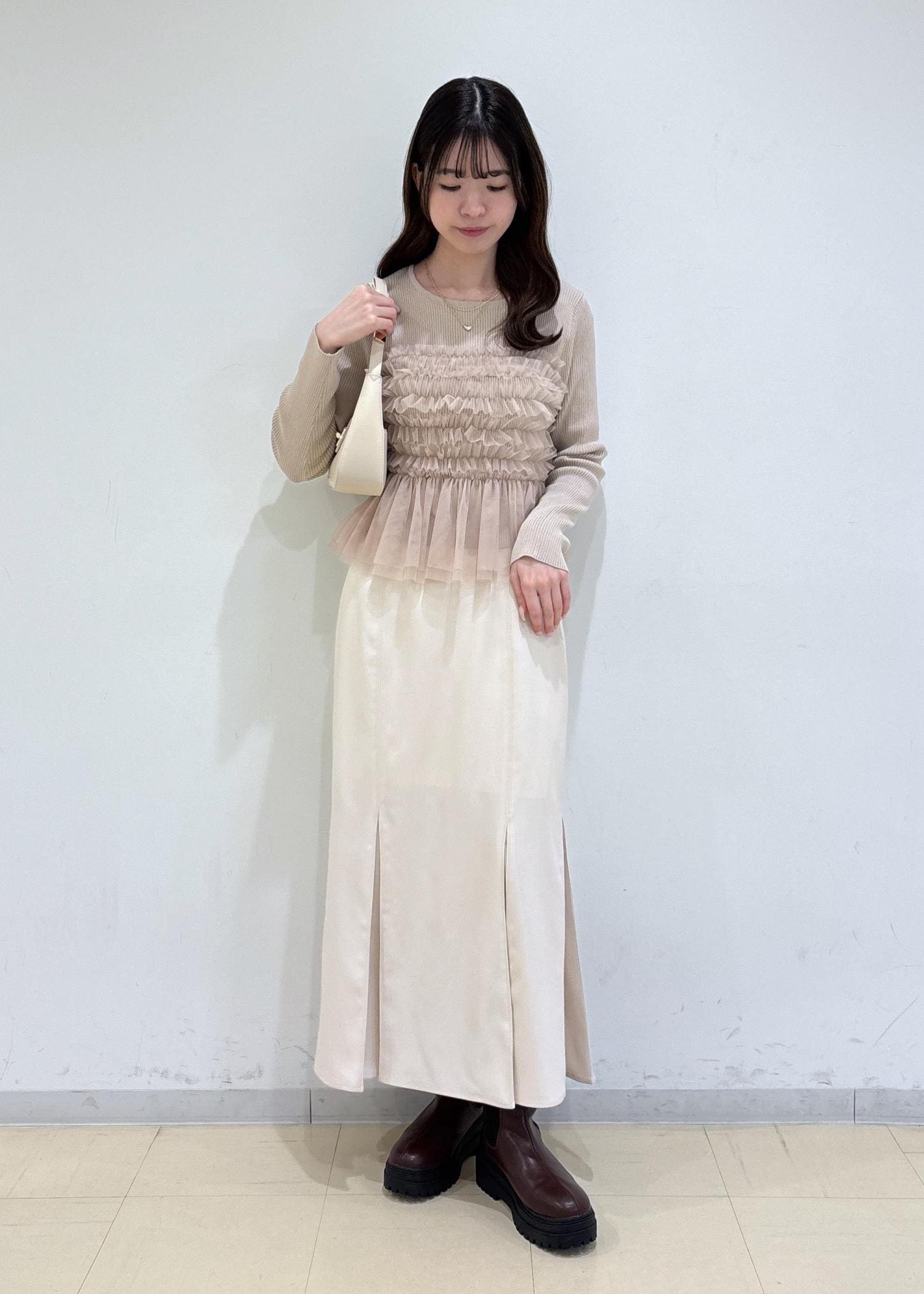 トップスのチュールが1枚で華やかにしてくれます。スカートで女性らしいフェミニンコーデにしました。