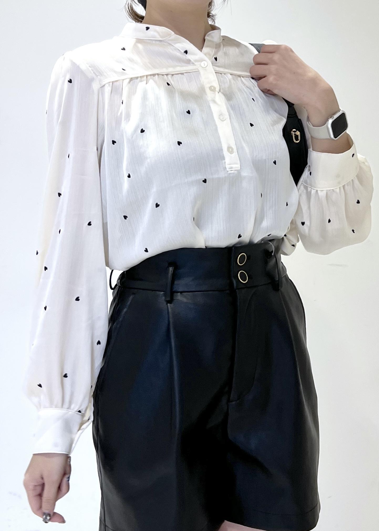 VISハートモチーフ刺繍ブラウス/イージーケアオフホワイト / F¥6,589レビュー透け感があるのでインナーはカップ付きキャミソールを着用しています。程よく余裕のあるサイズ感で、着丈は腰にかかるくらいでした!