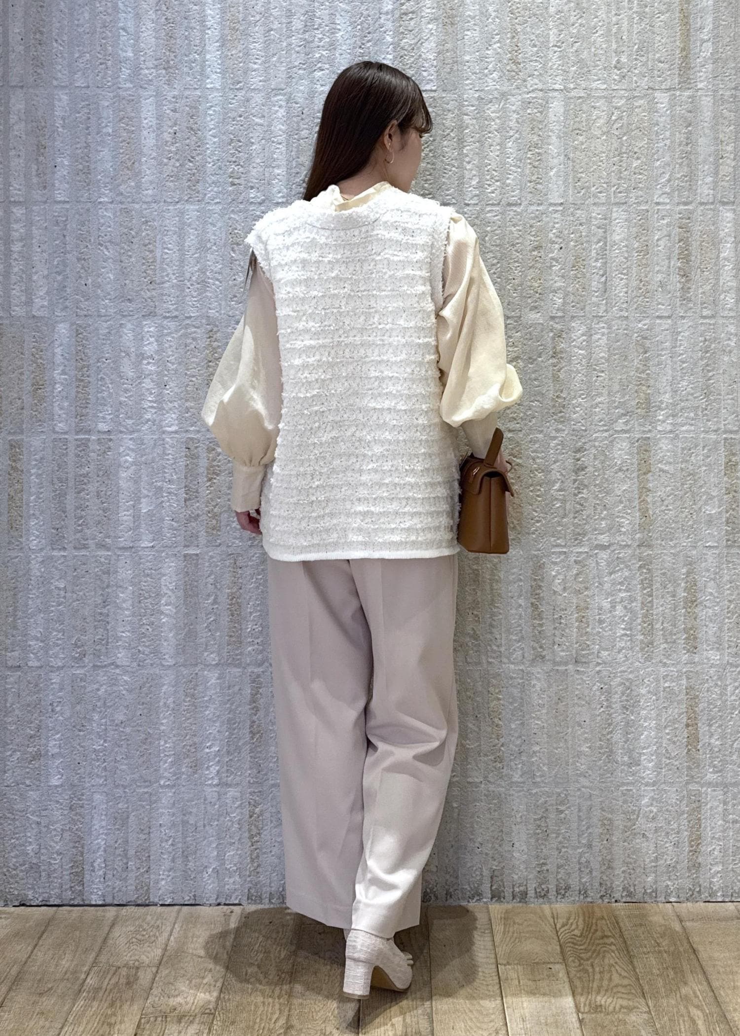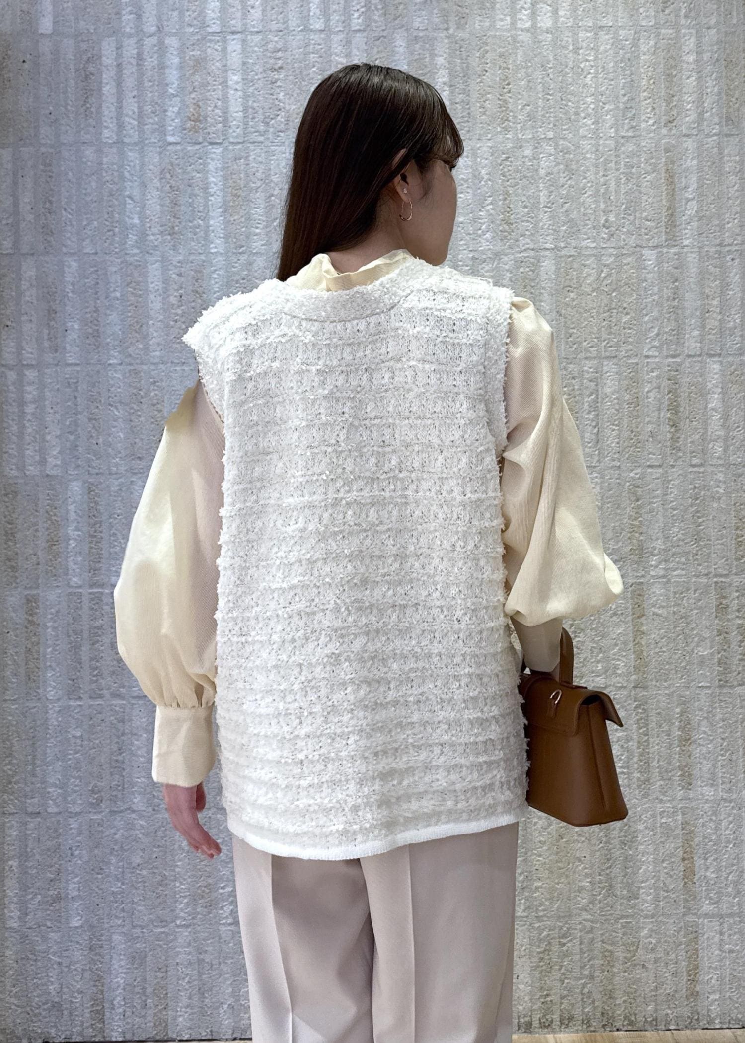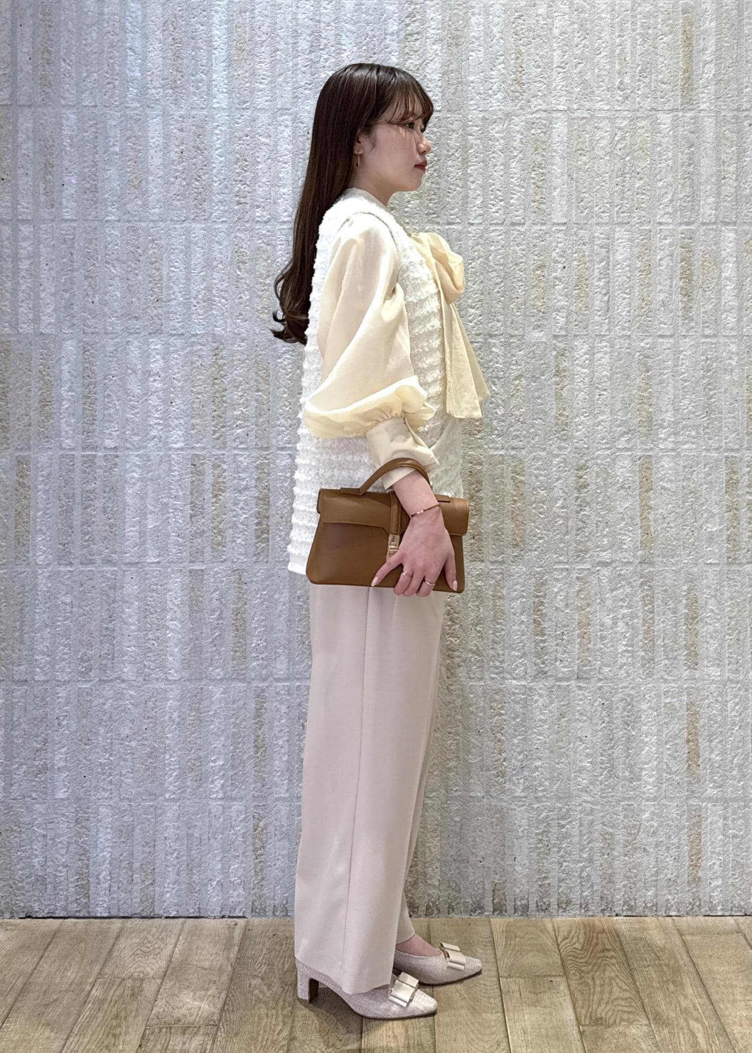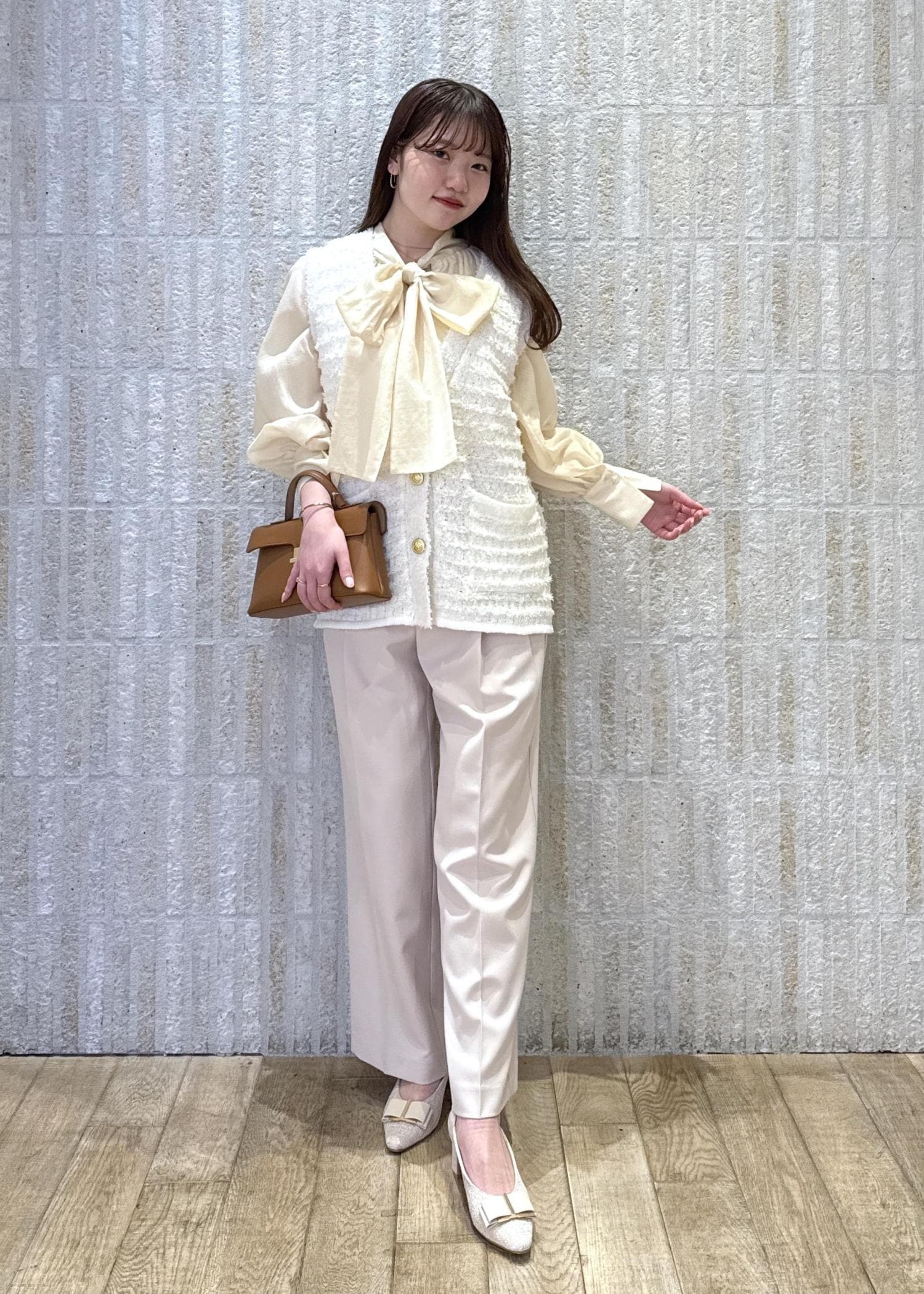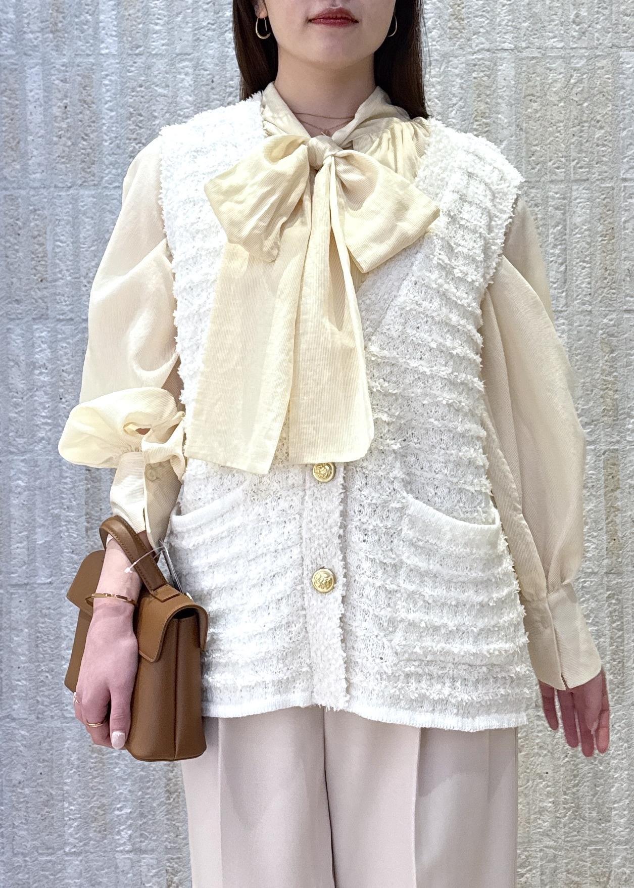 ボウタイリボンブラウスとツイード素材のベストを合わせて華やかレイヤードコーデに◎