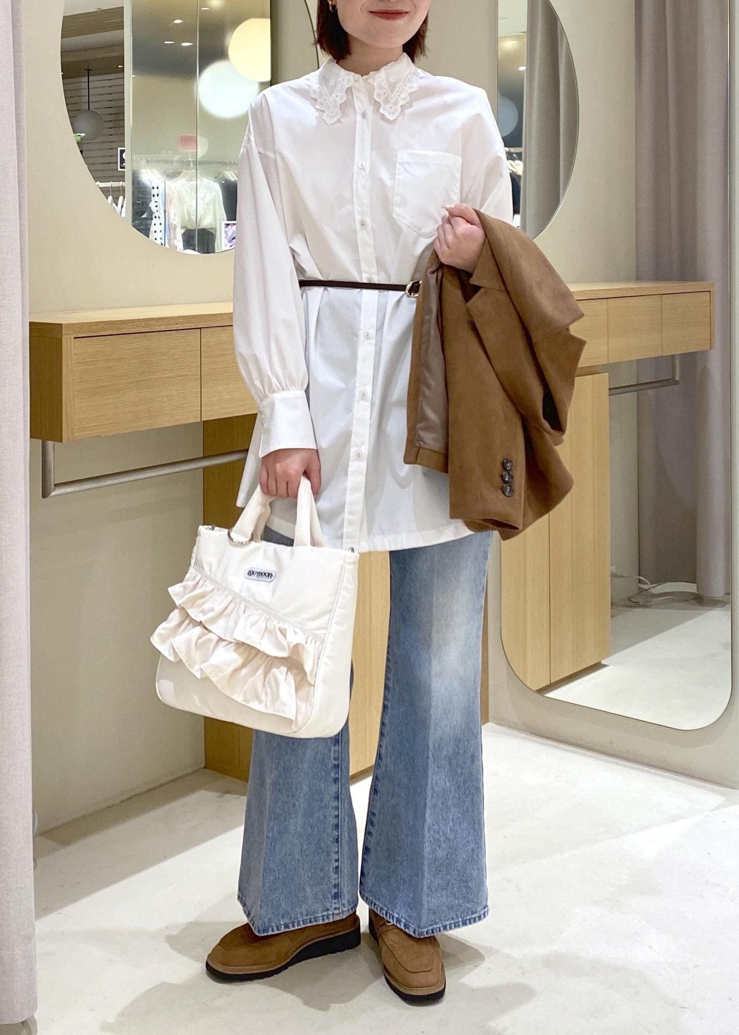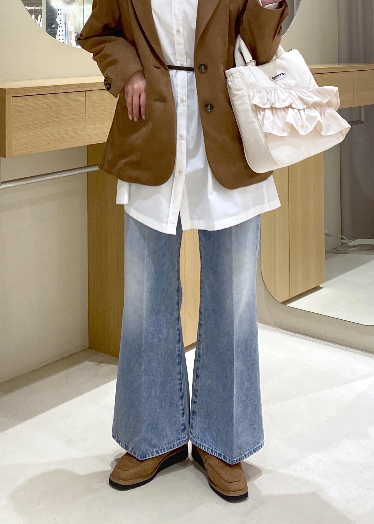 ミニ丈ワンピにフレアデニムパンツを合わせたお出かけ用コーデです!