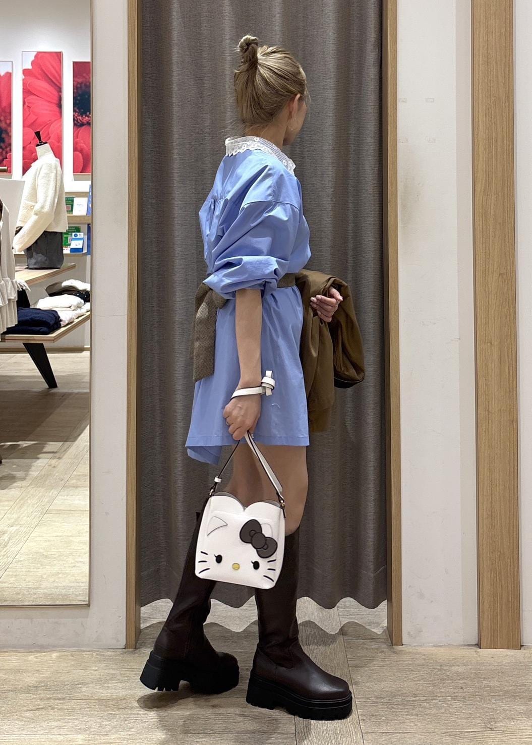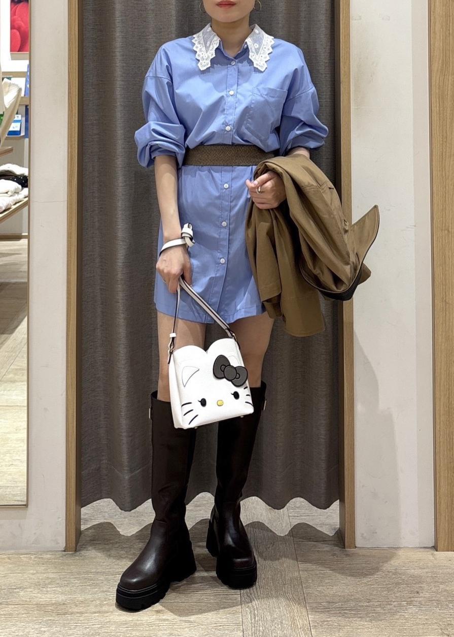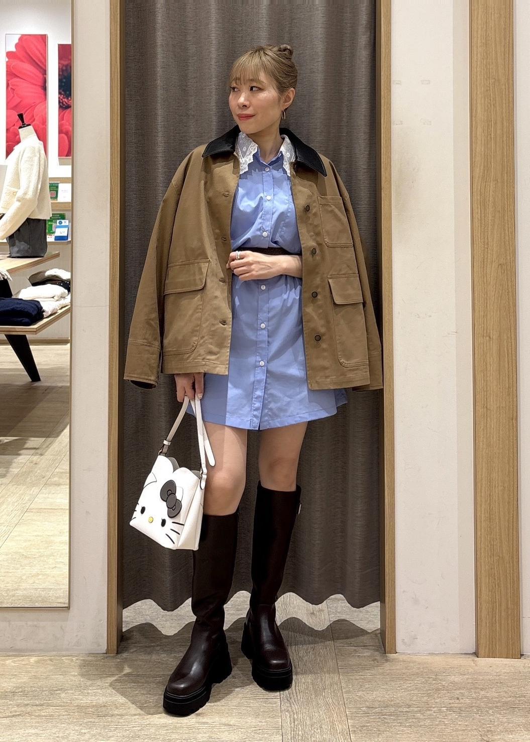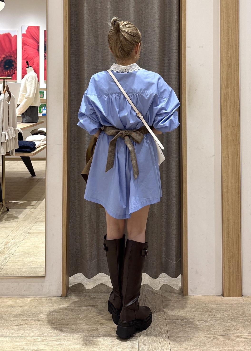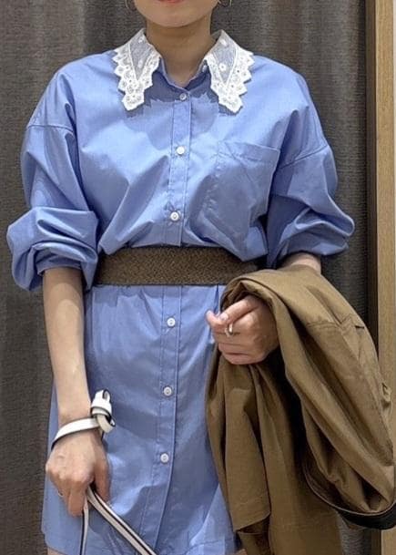 VIS襟レース付きミニ丈シャツワンピサックス / F¥7,689レビュー身長154㎝でFサイズ着用。