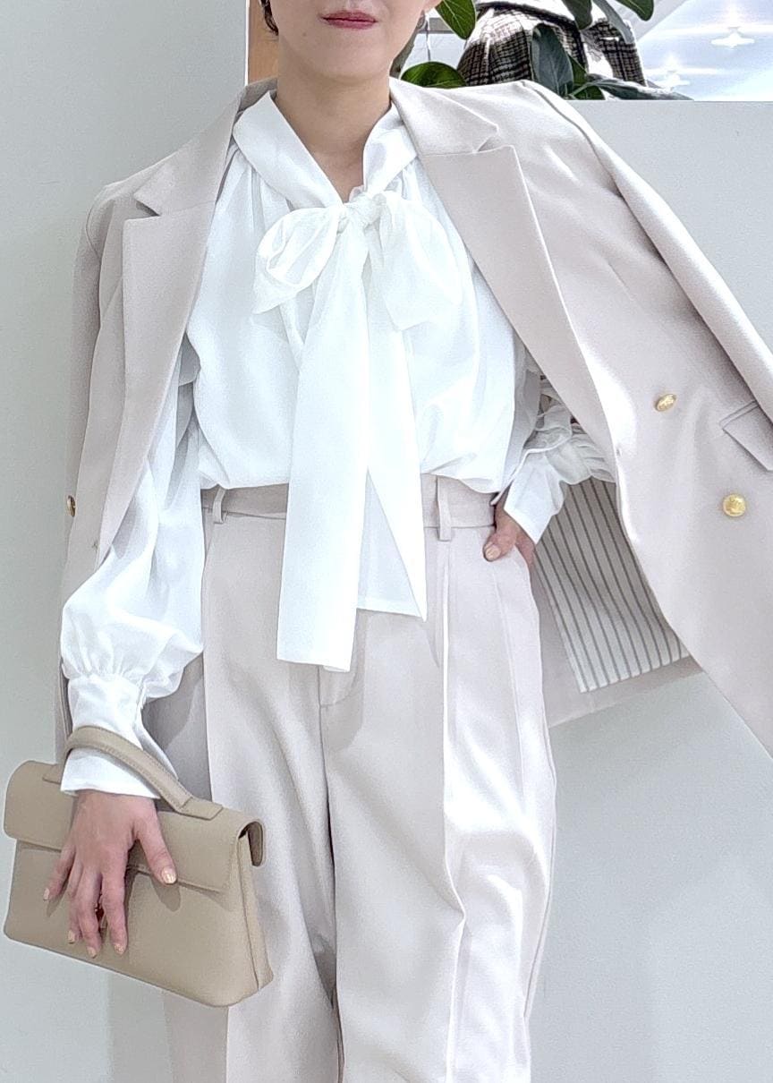 リボンのデザインが女性らしく、パンツスタイリングも華やかに見えます。