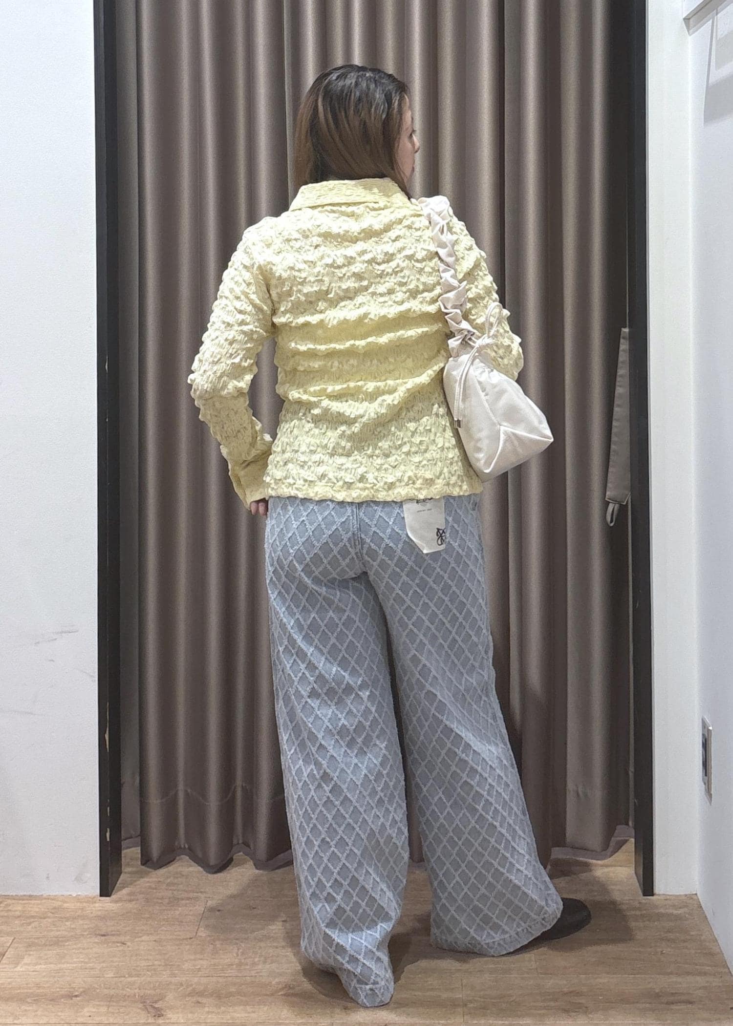 VISストレッチレースジャガード衿付きカーディガンイエロー / F¥5,489レビュー総レースですが、透け感はそこまで気にならないので中に長袖のインナーを重ね着しても◎