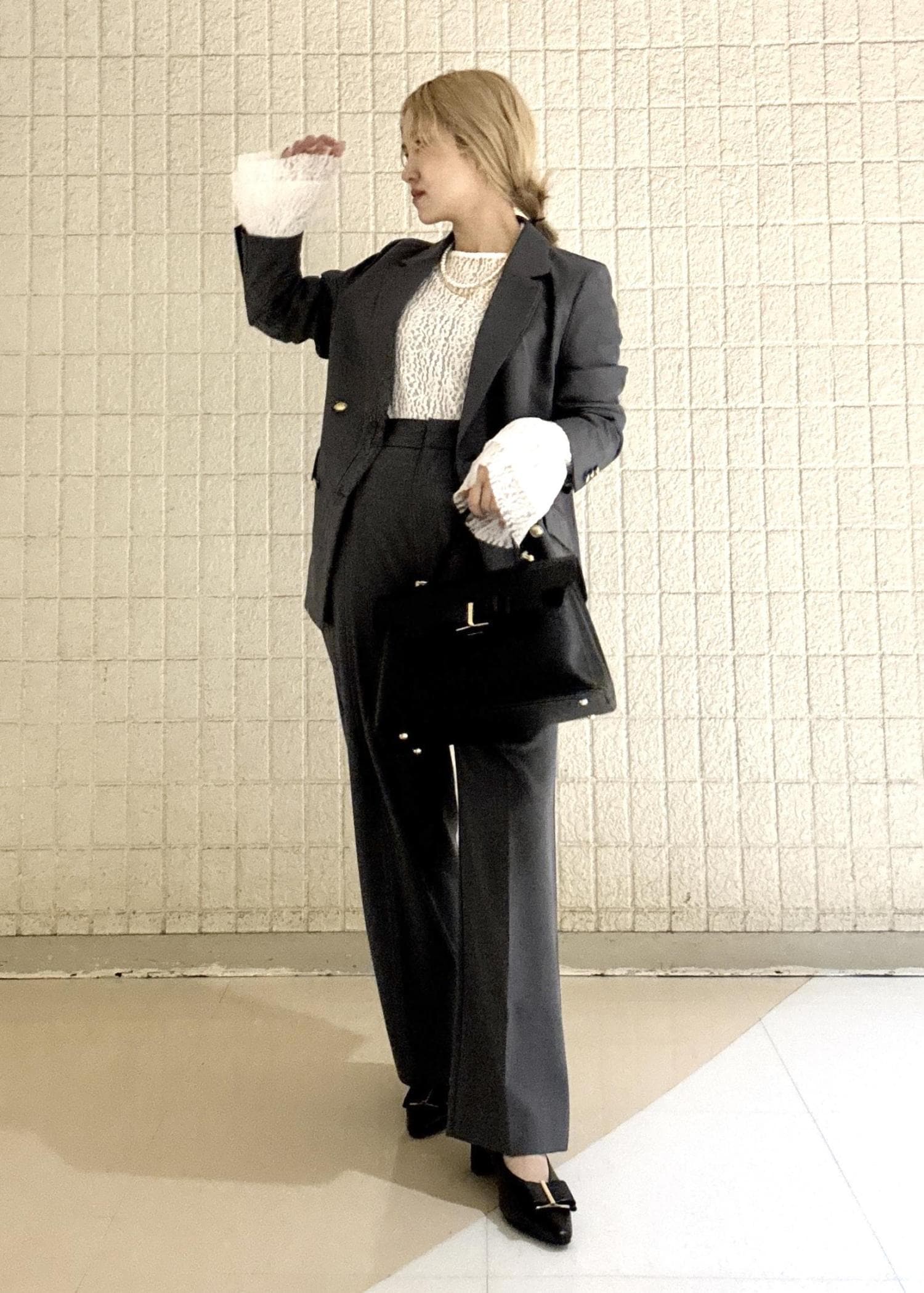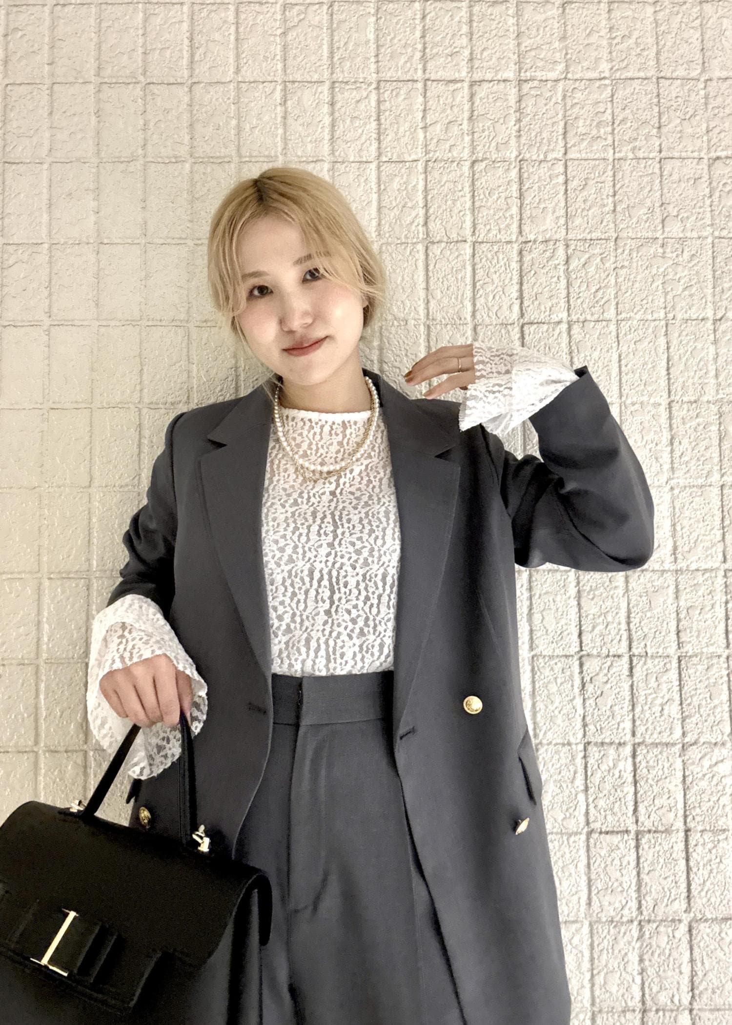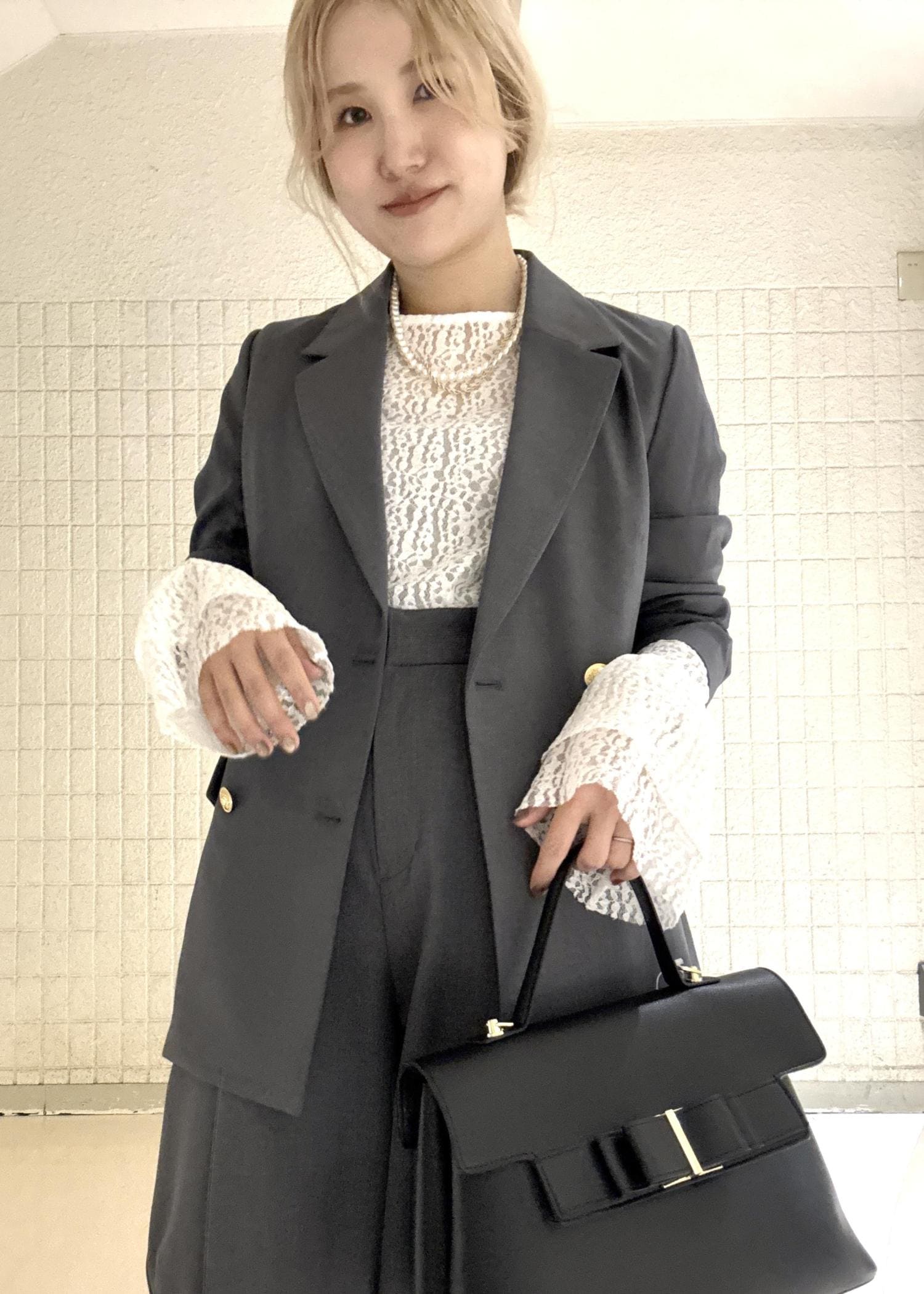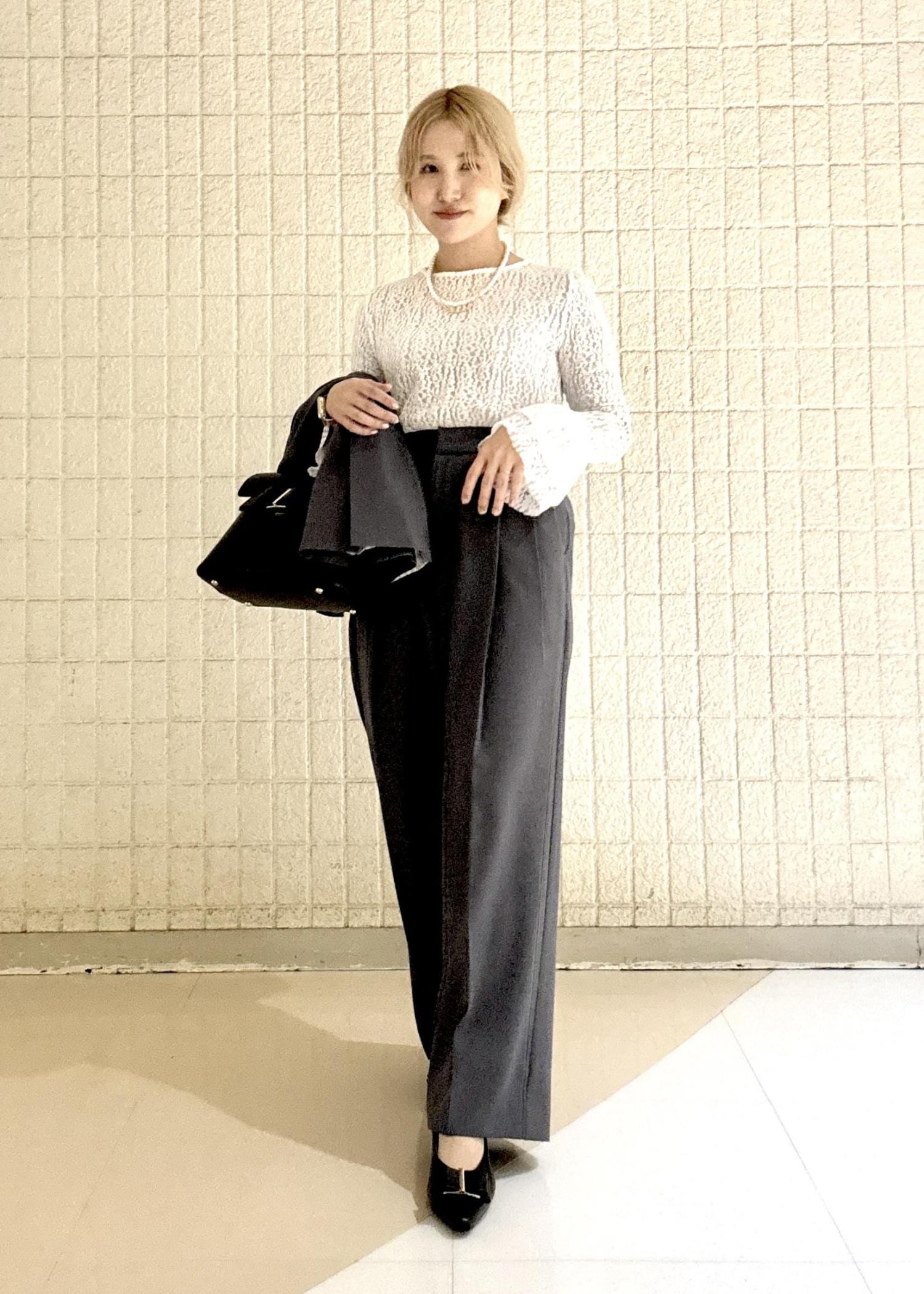 セットアップのパンツコーデはカッコよくきちんと感がありますが、インナーの総レースを袖から見せる事でこなれ感を出してオシャレさをプラス。