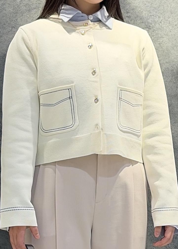 VISステッチワークニットジャケットオフホワイト / F¥5,929レビュー肌触りの良い生地で、とにかく着心地が良かったです。程よくゆとりがあるので、中に一枚ブラウスを着ても問題なく着用できました!金ボタンが高級感を演出してくれつつ、ステッチで程よくカジュアルさも取り入れられるので、とてもバランスの良いアイテムだと思います。