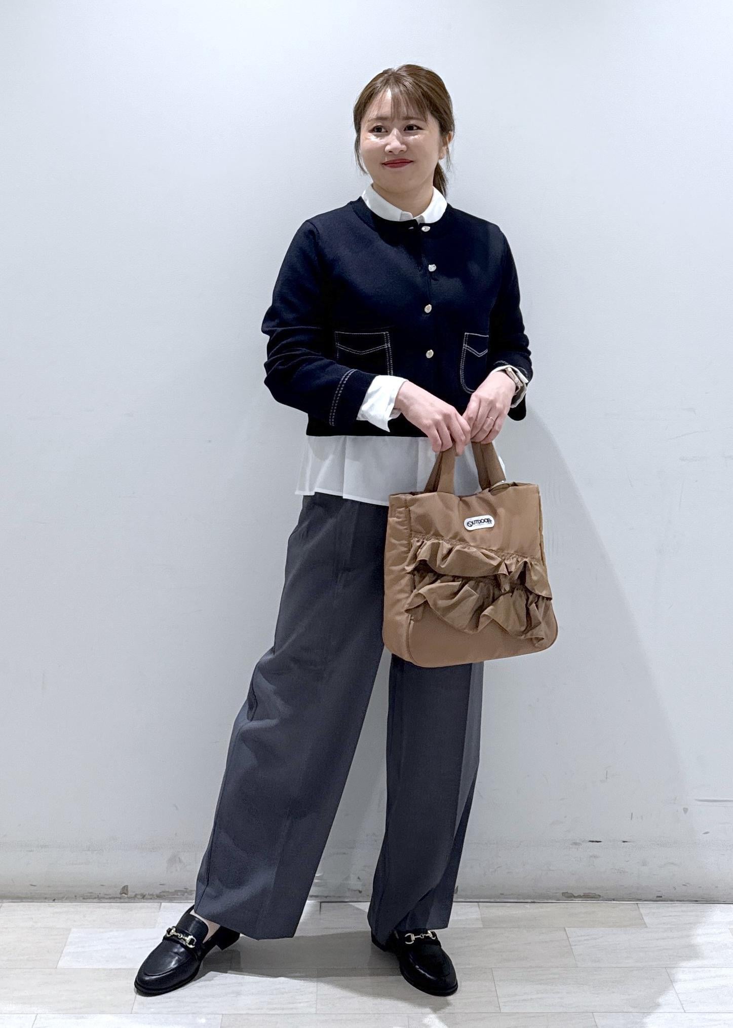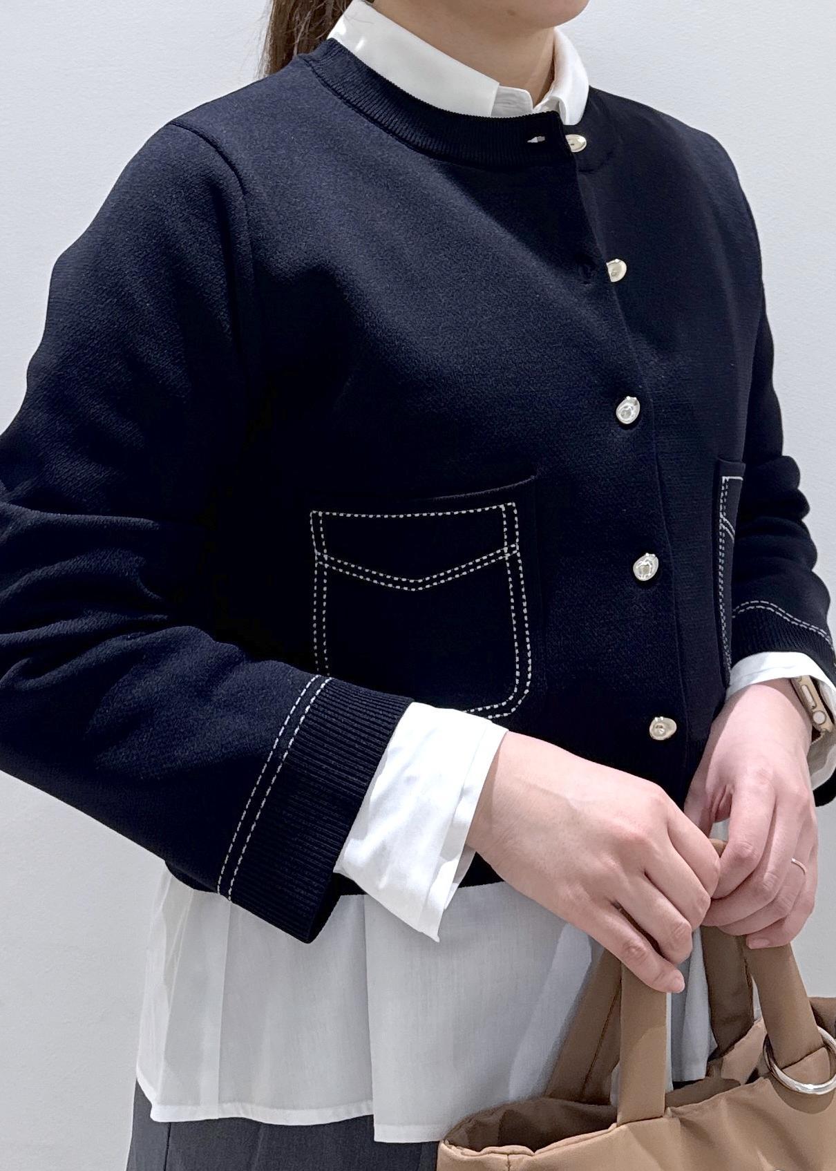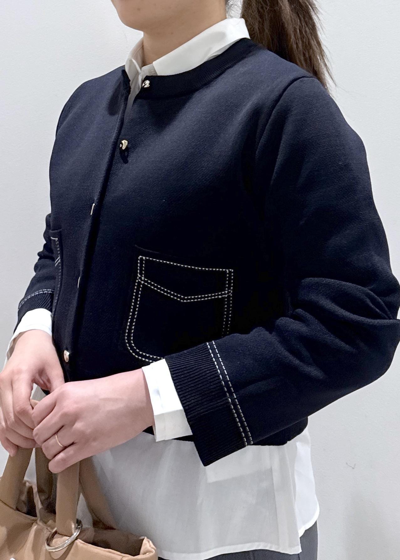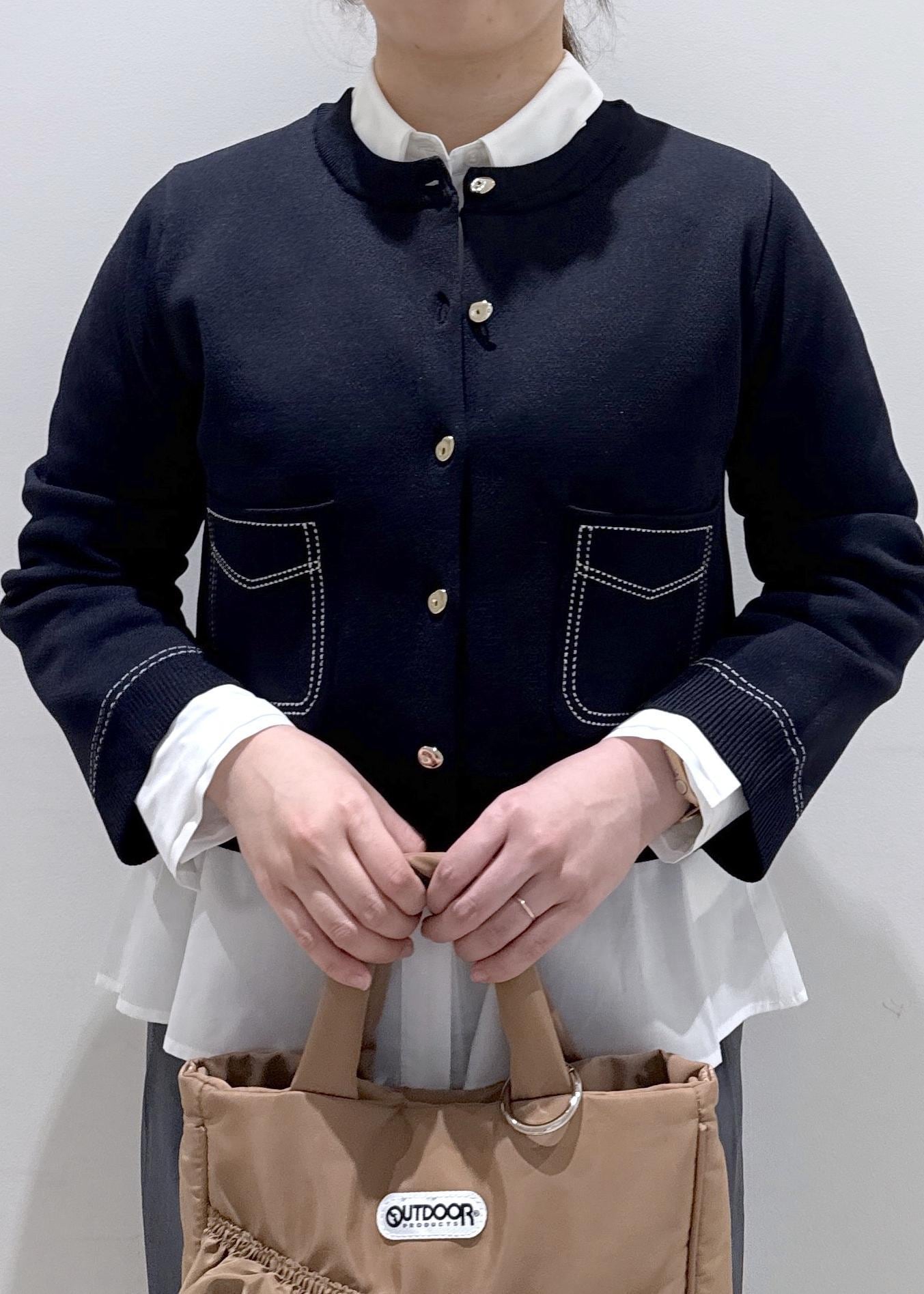 今回は新作で入荷しましたステッチデザインのオシャレなカーディガンに、シャツとレイヤードしたコーディネートにしてみました。落ち着いた色味も好きな方にオススメです。