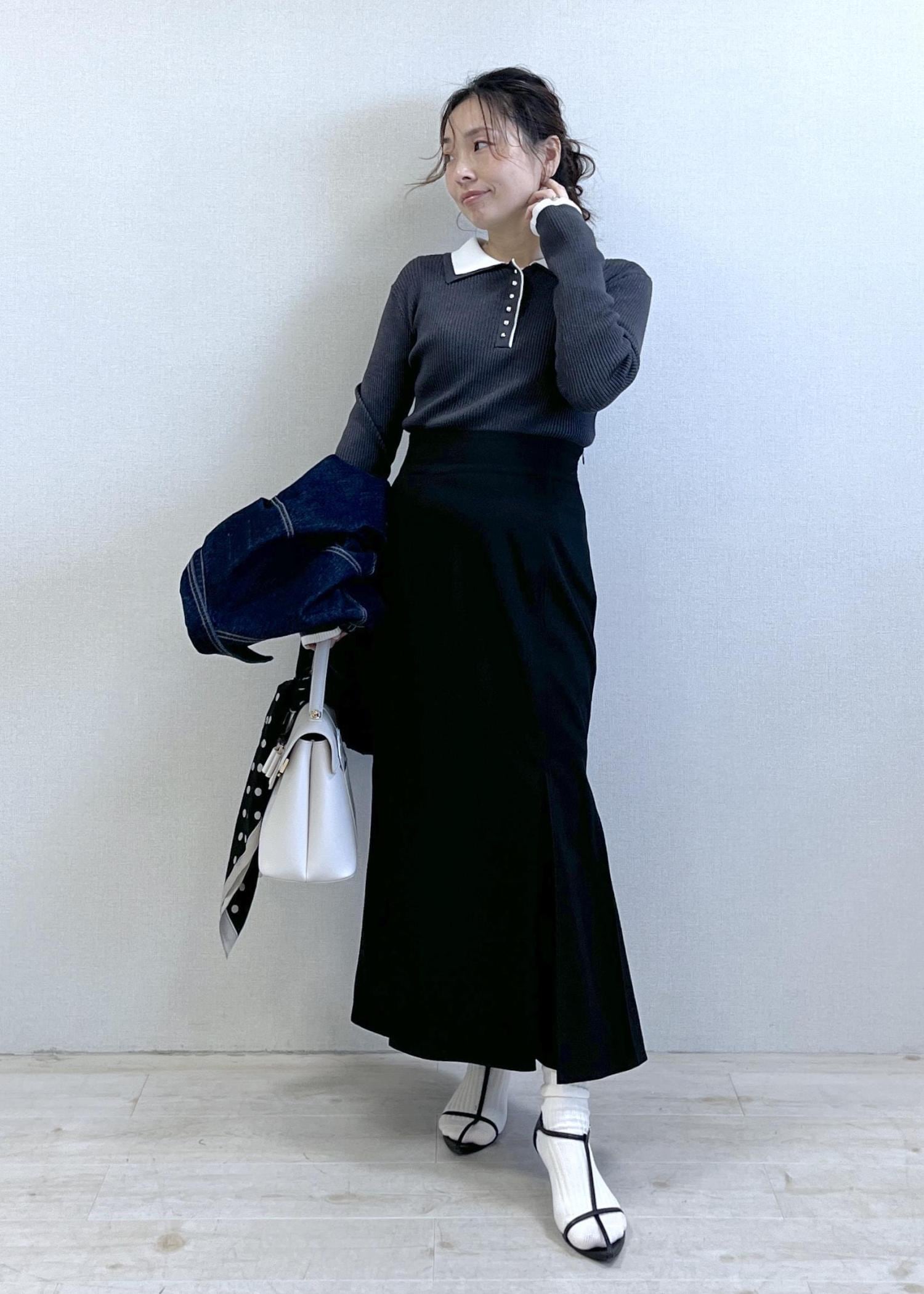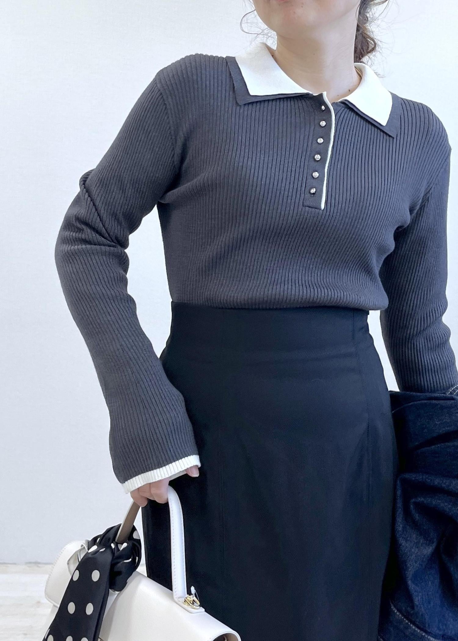 VISダブルカラーポロニットトップスチャコール / F¥5,489レビュー152cmでFサイズ着用し、着丈は腰にかかるくらいの丈。程よく身体にフィットしてくれるコンパクトなサイズ感。収縮性もありとっても柔らかいので肌あたり優しく着心地◎大人気トップスのアップデート版です。春まで着られるシャリ感のあるニットは上品見えも叶えてくれます。フレア袖なのも女性らしく着られるポイントです。