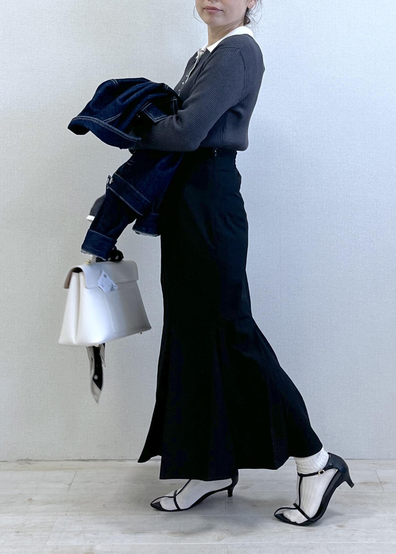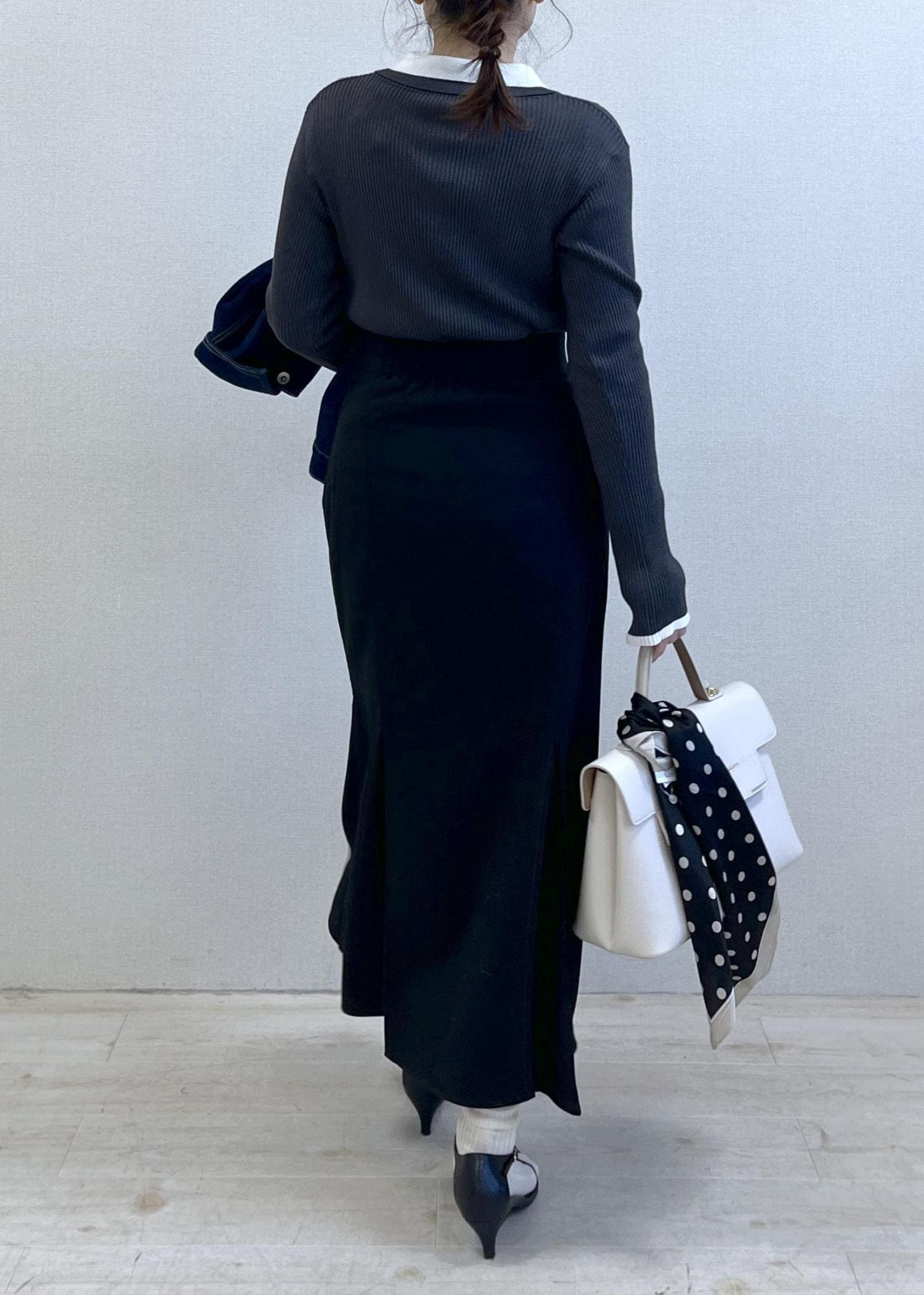 VISボックスプリーツマーメイドスカート/イージーケア・防シワブラック / S¥6,589レビュー152cmでSサイズ着用し、ウエストはジャスト。着丈は足首が出るくらいのミドル丈。程よく身体にフィットしてくれるマーメードスカートと、裾のプリーツで立体的な動きがでてとっても女性らしいスカートです。ヘリンボーンの柄入りで表面感があるのもポイントです。柔らかい素材なのでとても着用しやすく足捌きもしやすかったです。