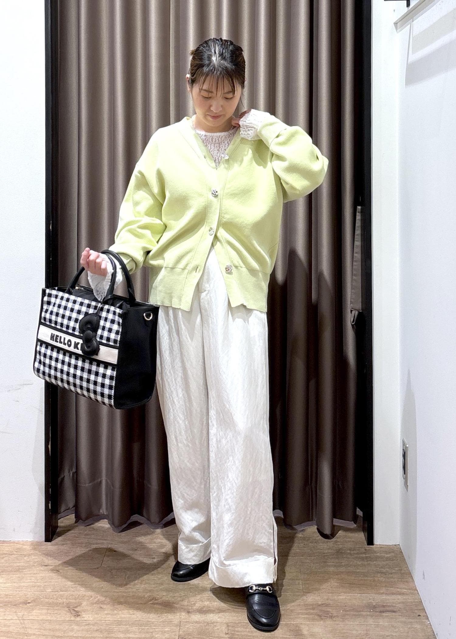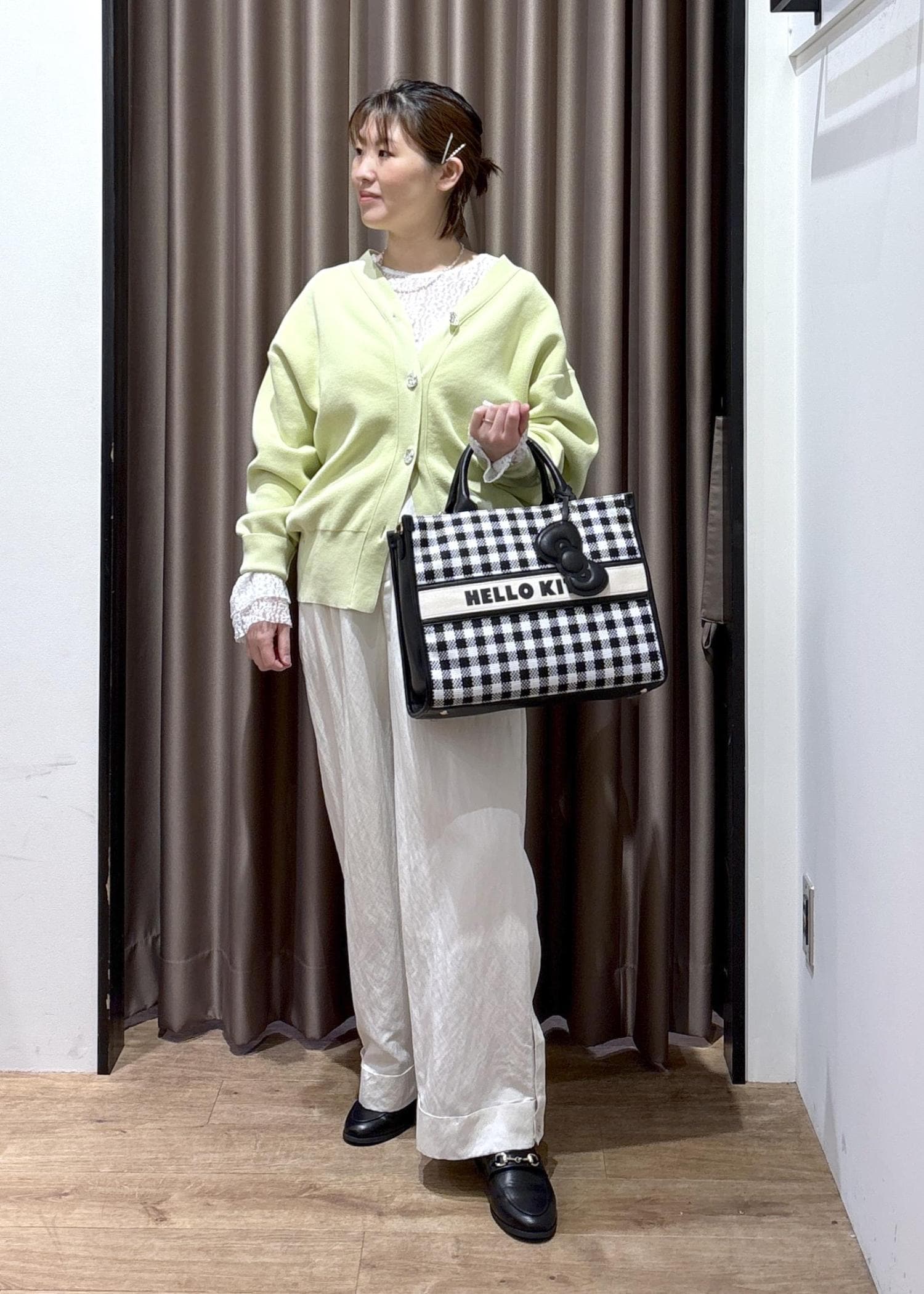 これから暖かくなる時期にも大活躍するハローキティコラボバッグはカラー物との相性も良いです!チェックが淡いコーディネートに映えます!コーディネートの主役をハローキティにしました!グリーンも久しぶりに着てみました!