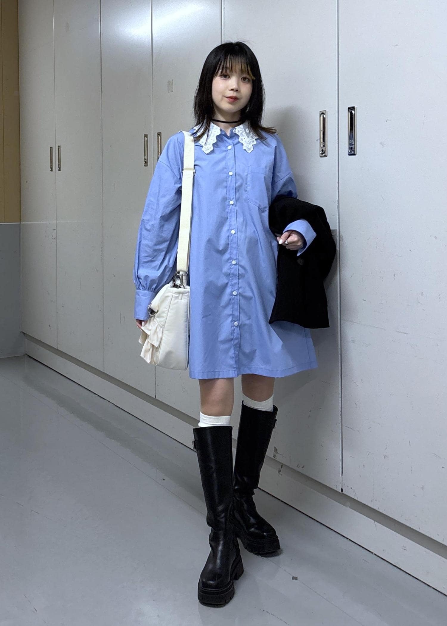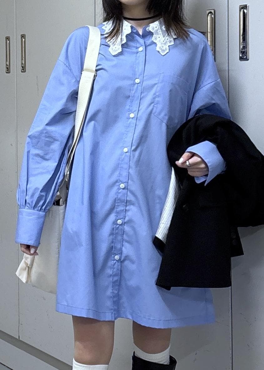 VIS襟レース付きミニ丈シャツワンピサックス / F¥7,689レビュー155cmが着ると膝上丈です、手を挙げると危険なので見えてもいいパンツを履かないとダメです◎
