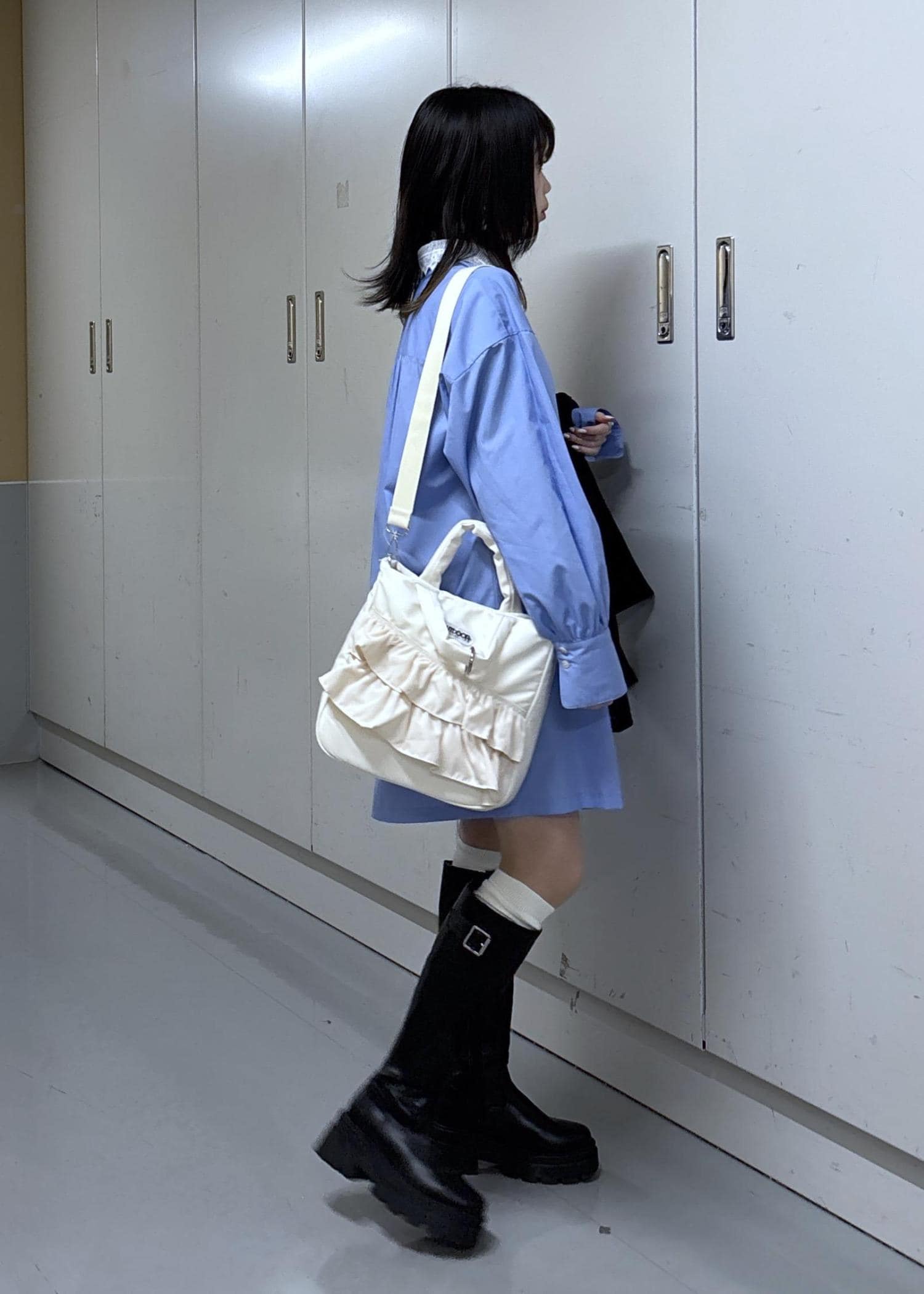 シャカっとした素材感ですが、控えめなフリルが程よい甘さをプラスしてくれてカジュアル過ぎない印象!