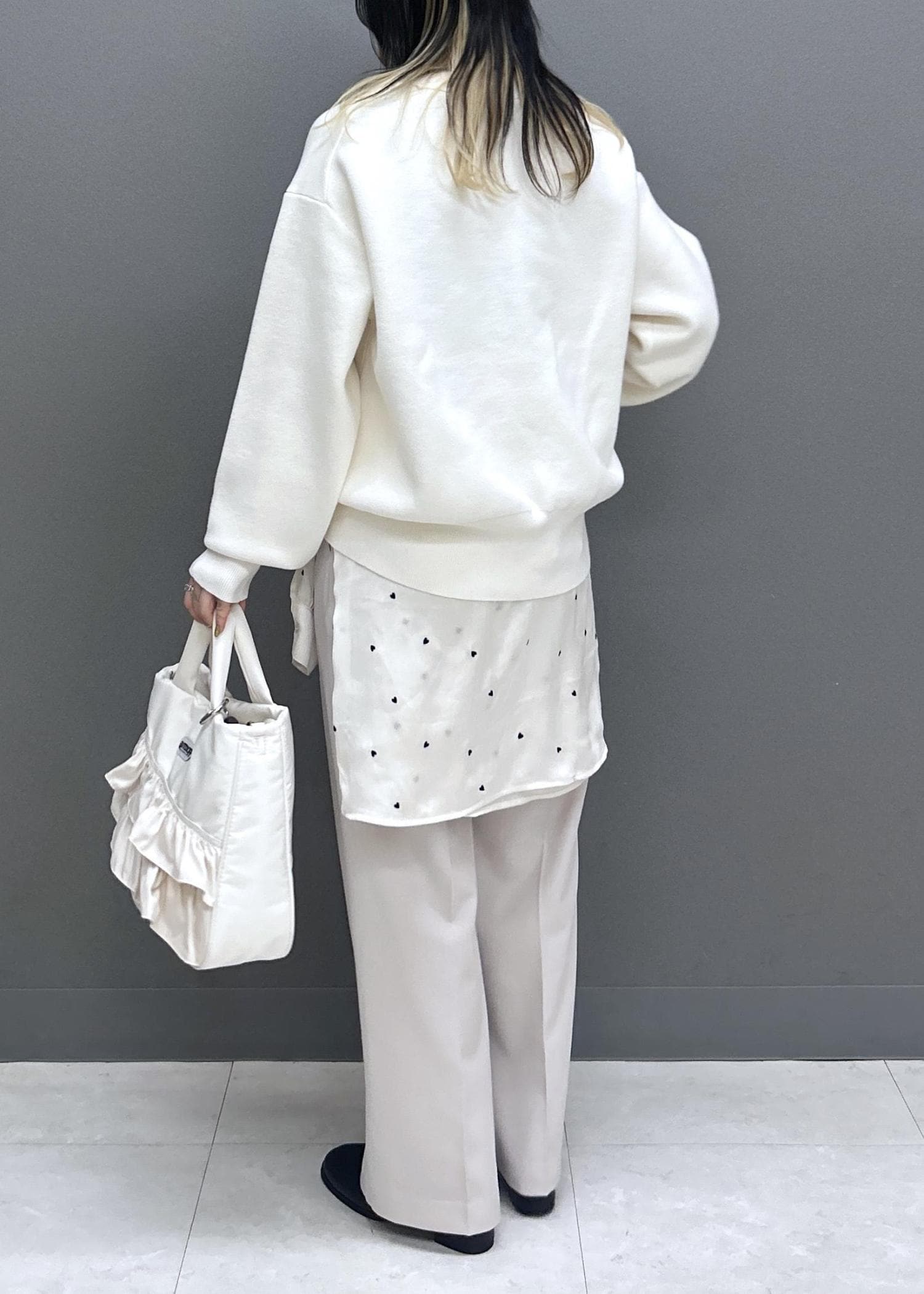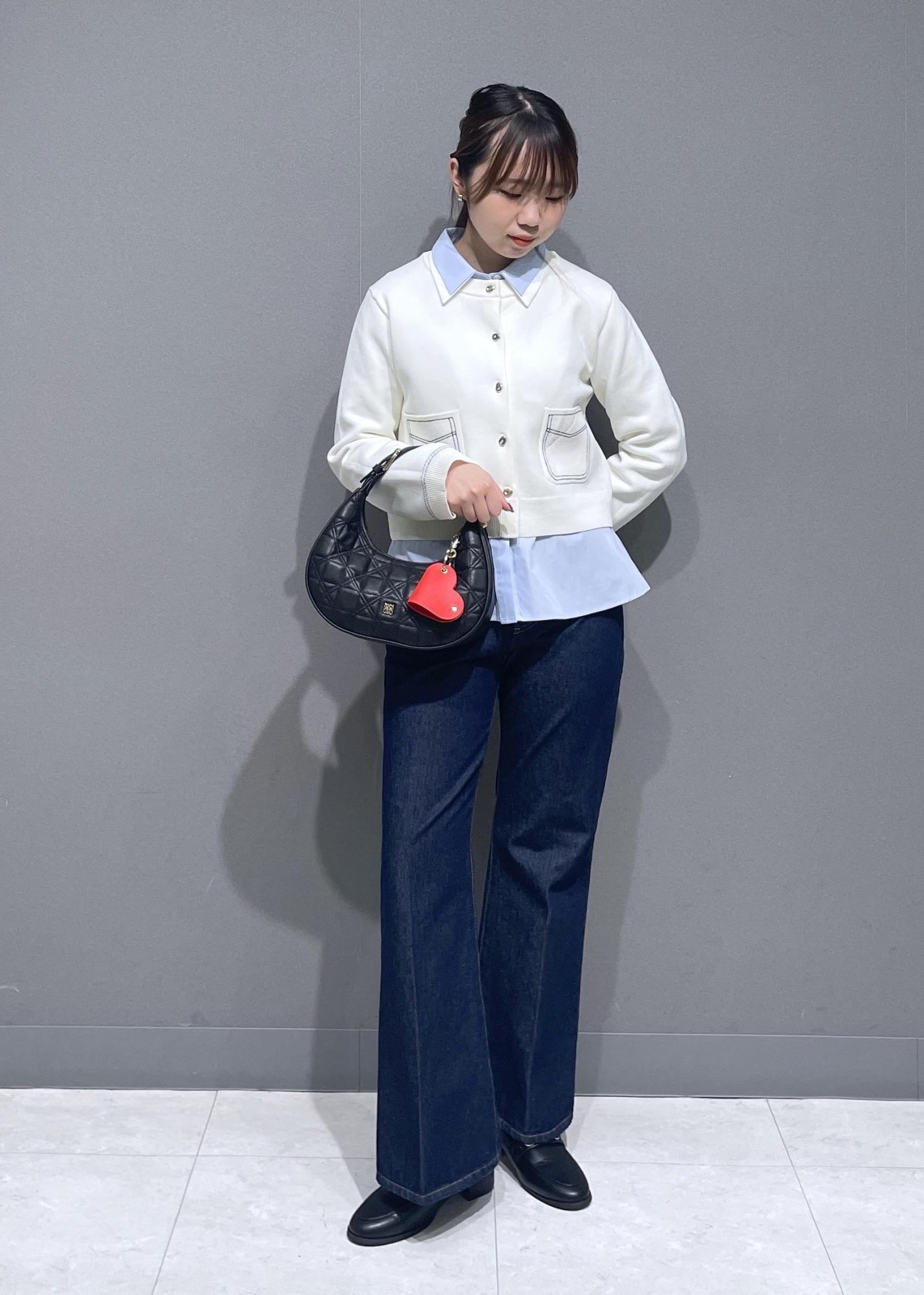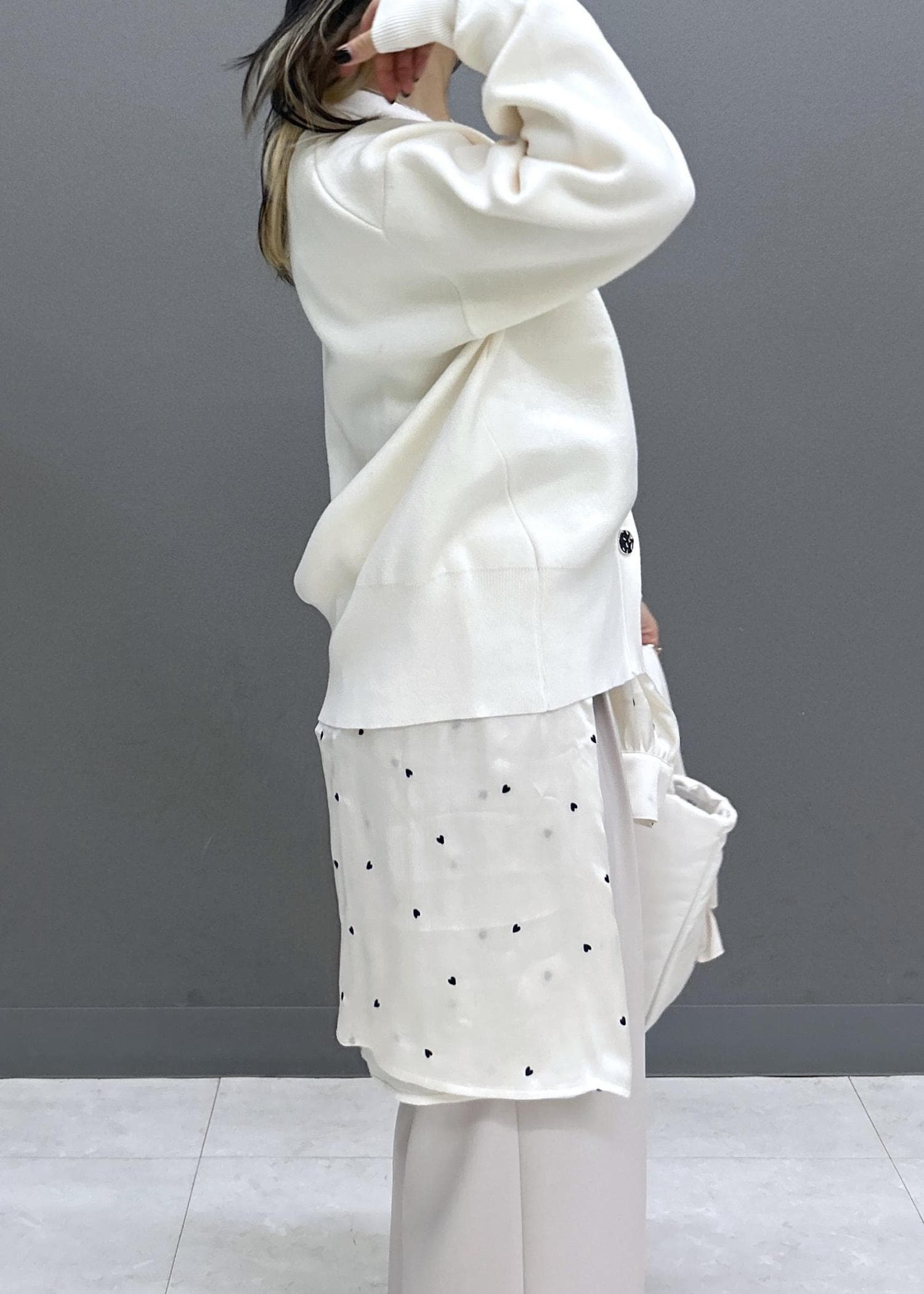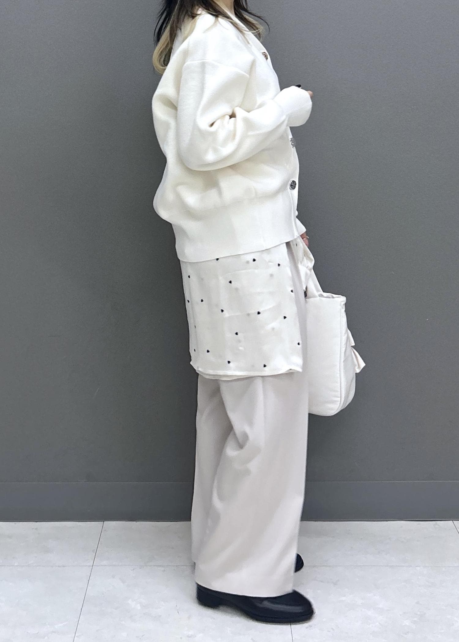 オフホワイトは透け感があるので、キャミソール合わせ必須です! -