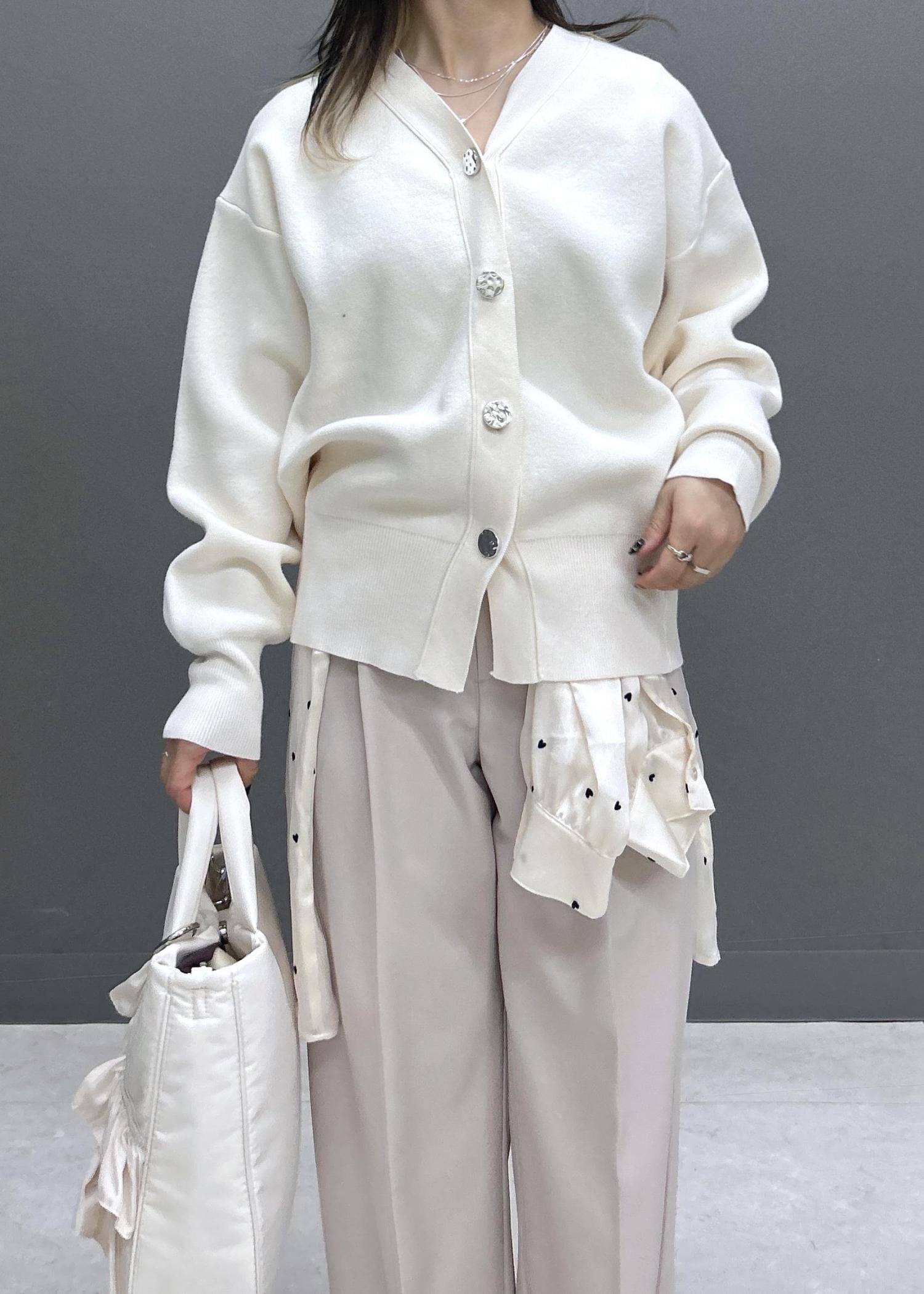 VIS釦アクセントコクーンカーディガンオフホワイト / F¥6,589レビューもちっとした滑らかなニット素材のカーディガンです。