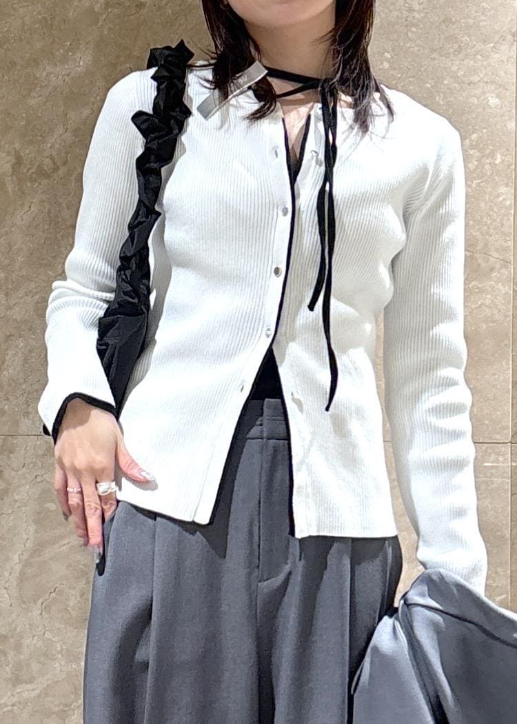 VISバイカラークルーネックカーディガンホワイト系 / F¥5,489レビュー細身のシルエットですが、着丈が少し長めなのと少し裾が開くデザインなので腰回りをカバーしてくれて着痩せして見えます!