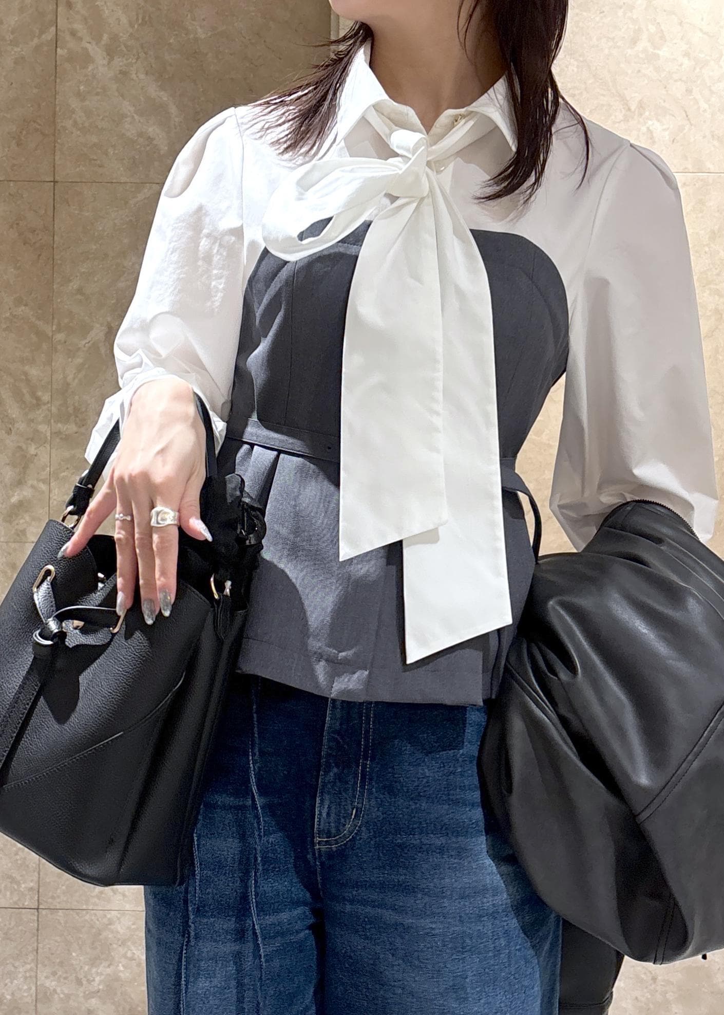 VIS【美easy】コンフォートボウタイドッキングシャツ/イージーケア・2WAYグレー / F¥6,589レビュー袖にボリュームのあるシャツですが、胴周りはスッキリしていて着膨れはしないデザインです。