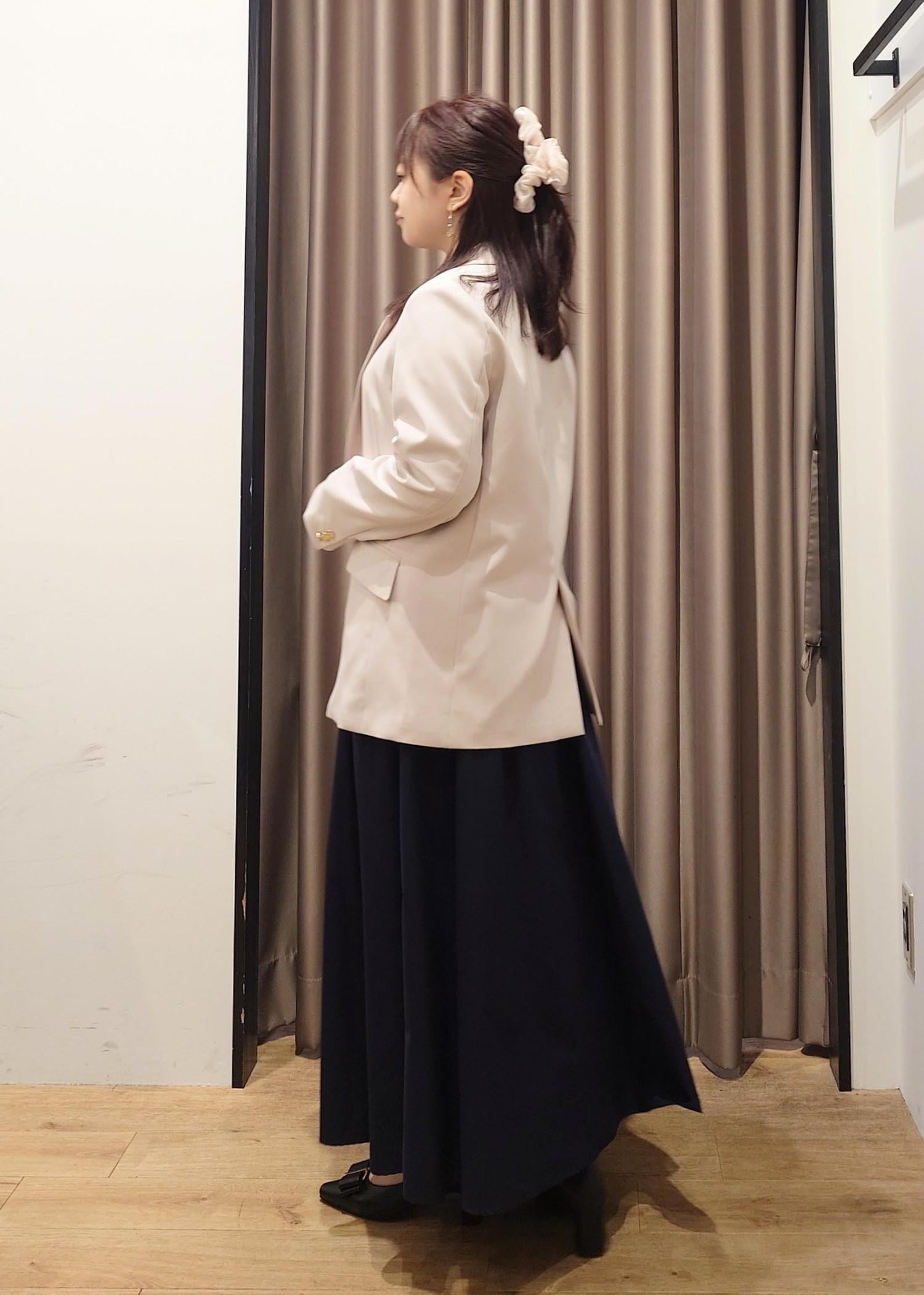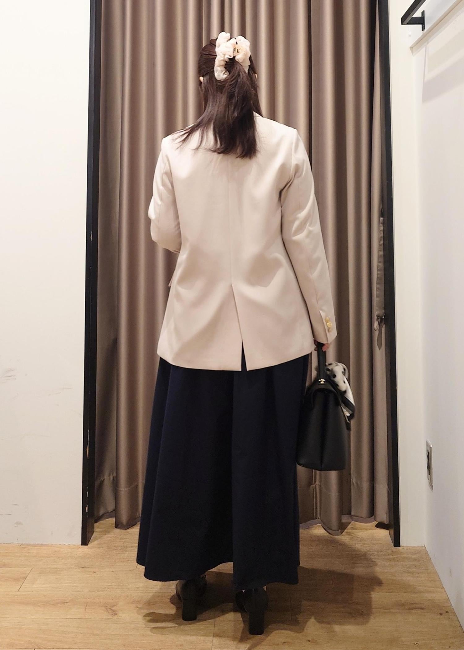 スカート部分がカジュアルなお素材ですが、ジャケットやヒールパンプス合わせで綺麗めコーデに。