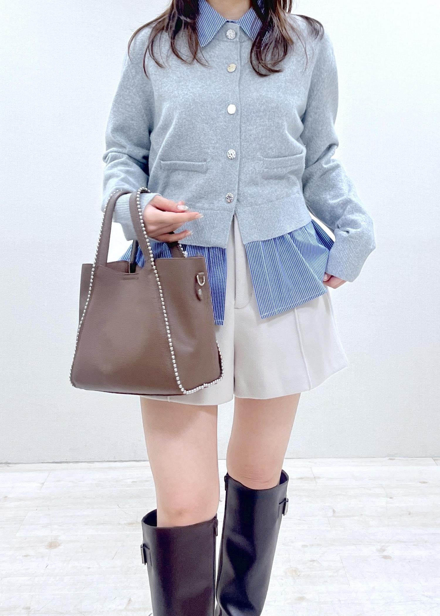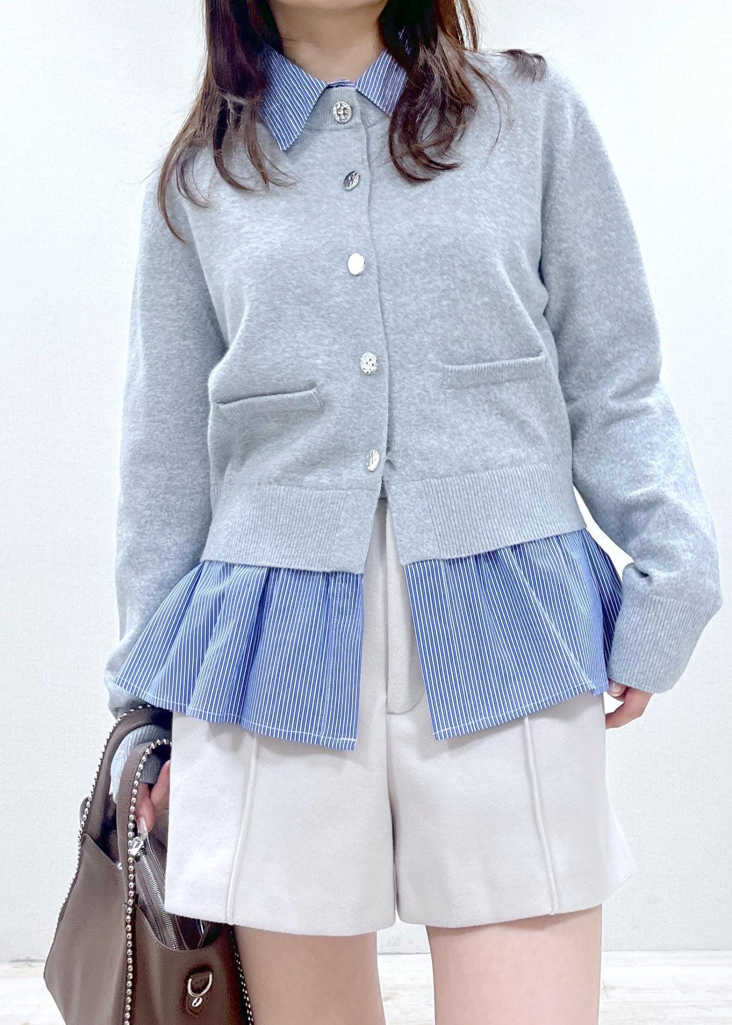 VISシャツレイヤード風メタルボタンカーディガングレー系 / F¥6,589レビューシャツがドッキングされているので重ね着で着膨れることがありません。着丈はヒップにかかるくらいなので、ワイドパンツやIラインスカートなどの組み合わせもおすすめ。