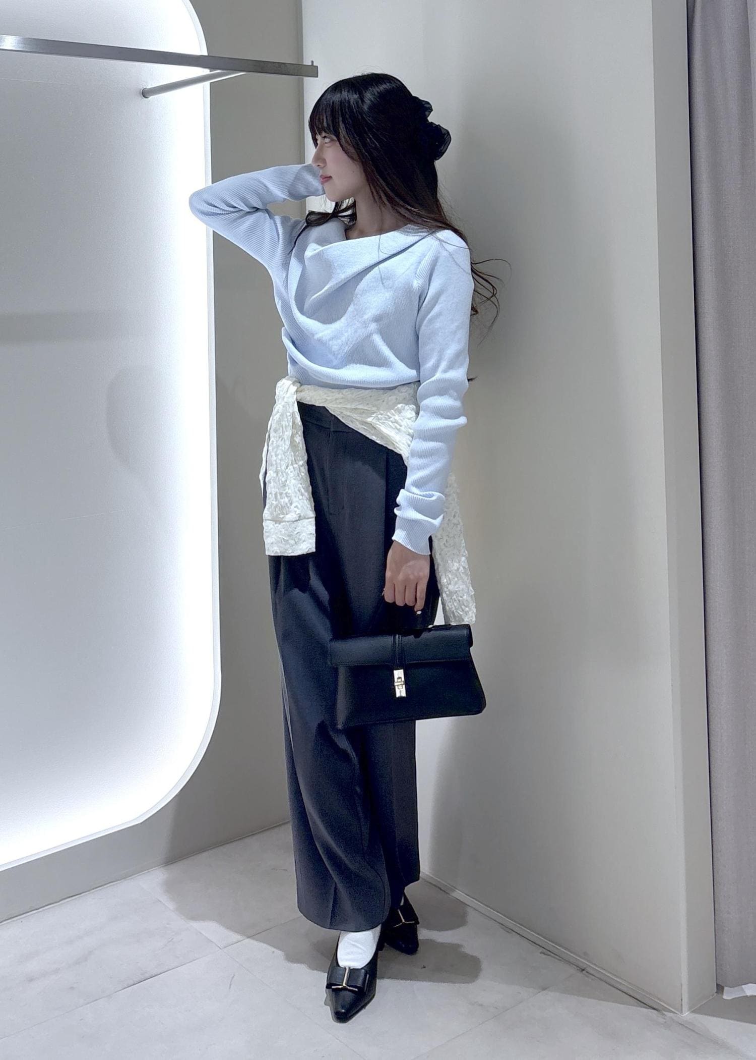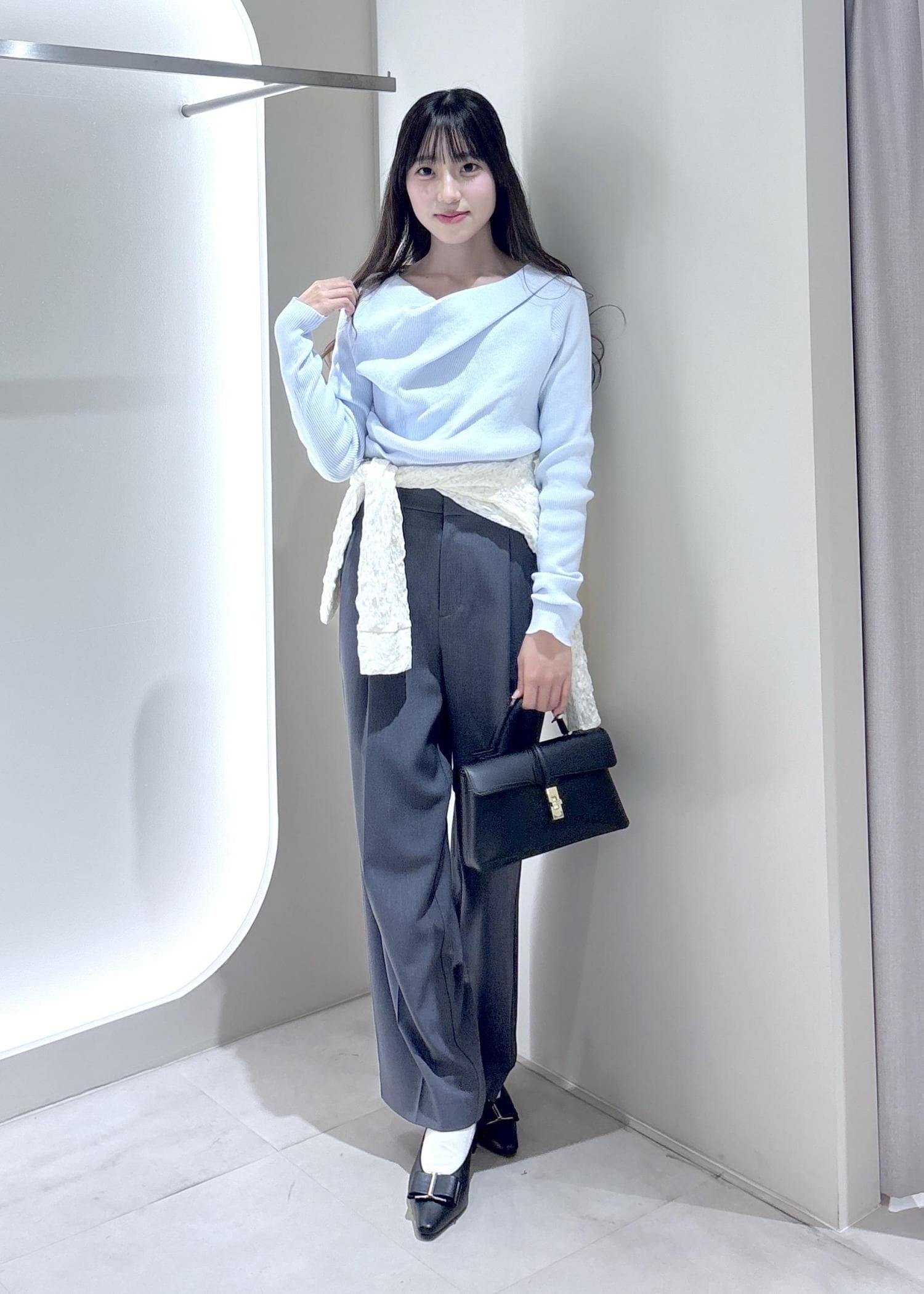 水色のニットとグレーのパンツを合わせることで暗すぎず明るかなるので春にぴったりです。