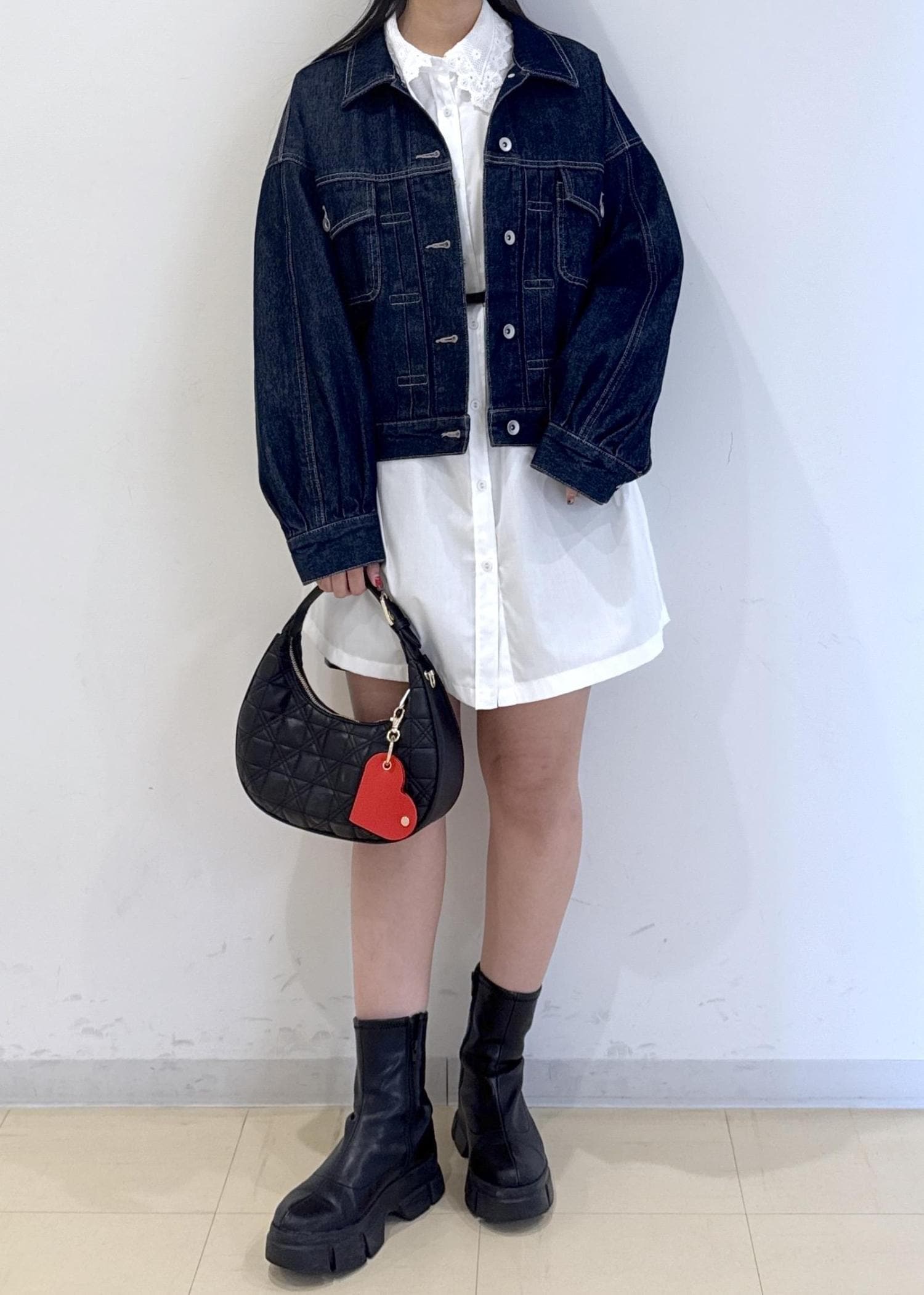 春らしいシャツワンピとデニムの組み合わせです
