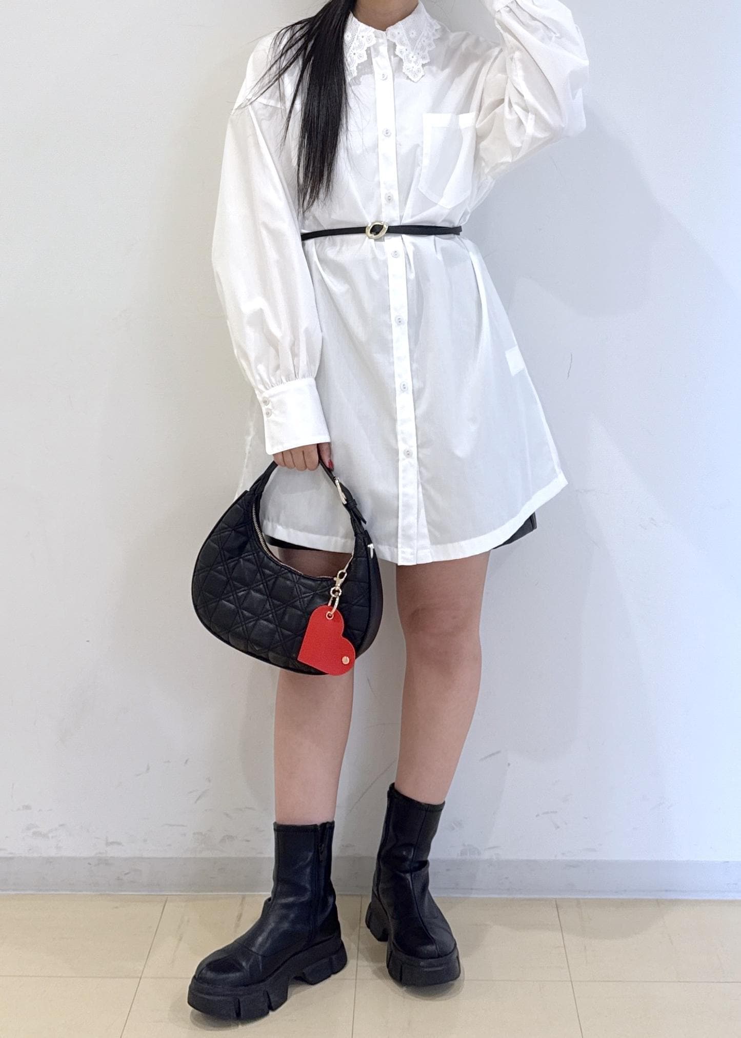 シャツワンピは裾が拡がっていたので、ウェーブの私はベルトでウエストマークしています♪