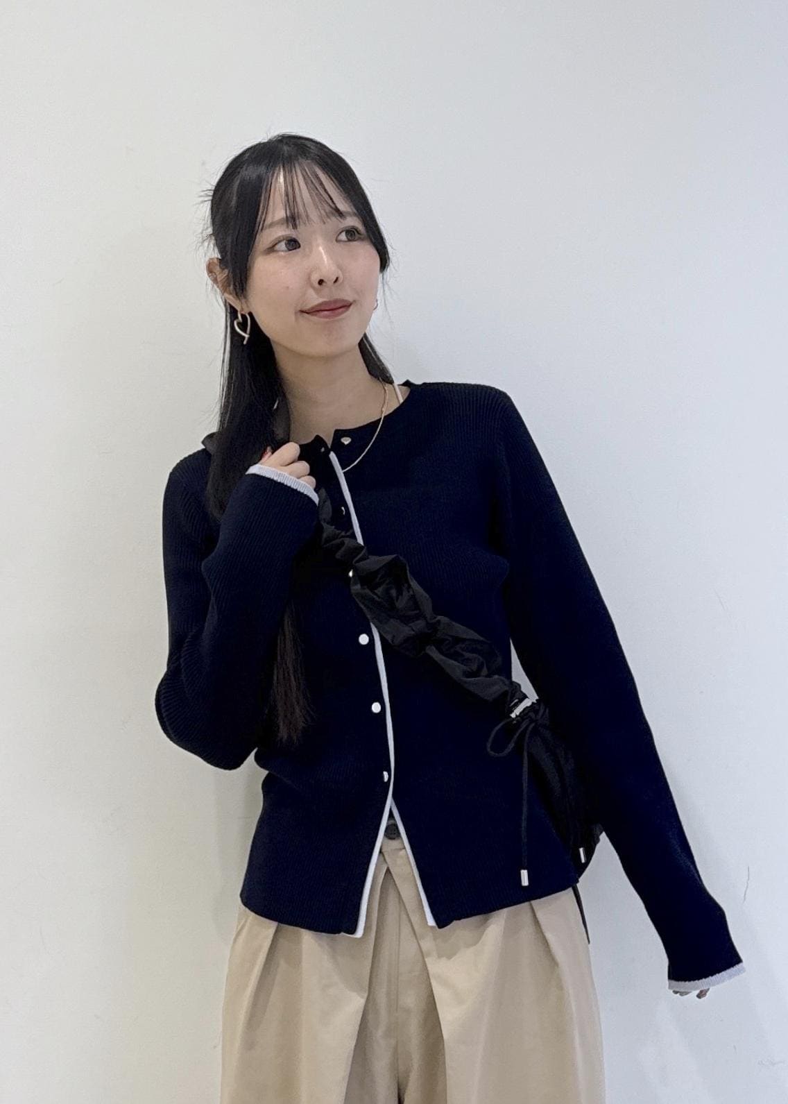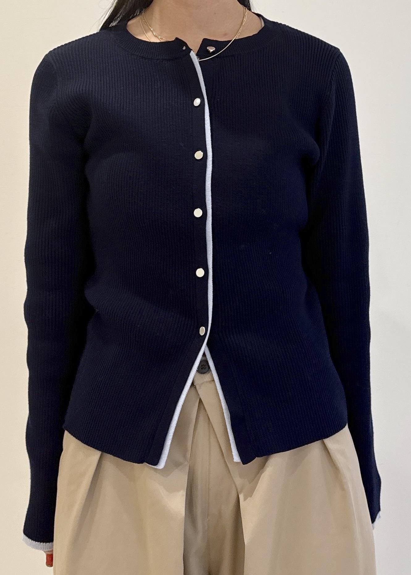 VISバイカラークルーネックカーディガンネイビー系 / F¥5,489レビュー体のラインを拾いすぎないタイトめなシルエットです。生地はもちもちしているので、着心地がいいです。少し袖は長めになっていて、トレンド感があって可愛いです