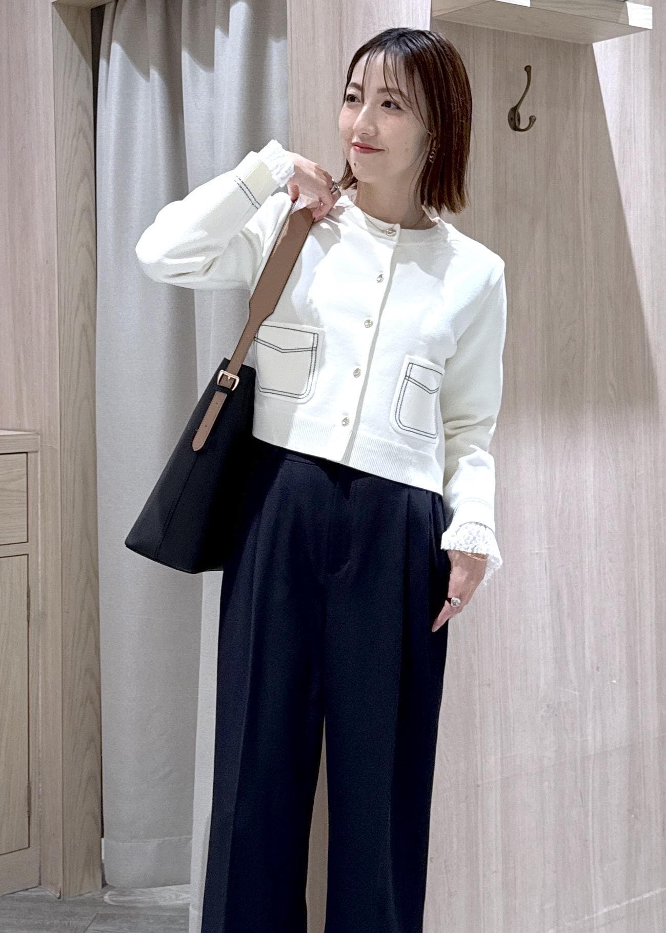 ポケットのステッチが可愛いカーディガンにスラックスを合わせた初春の通勤コーデです!