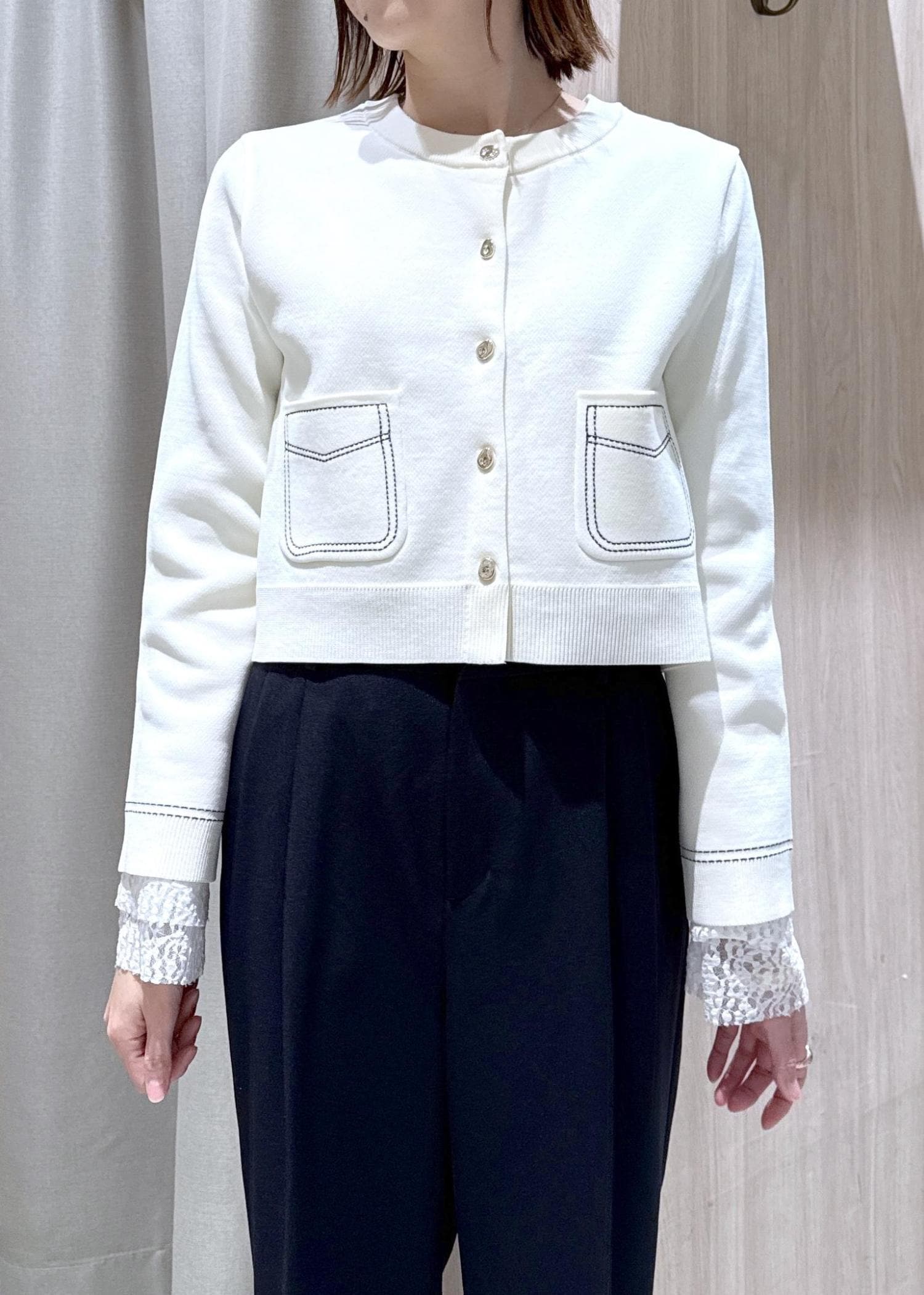 VISステッチワークニットジャケットオフホワイト / F¥5,929レビュー身長166センチで腰の長さでコンパクトな丈感でした。
