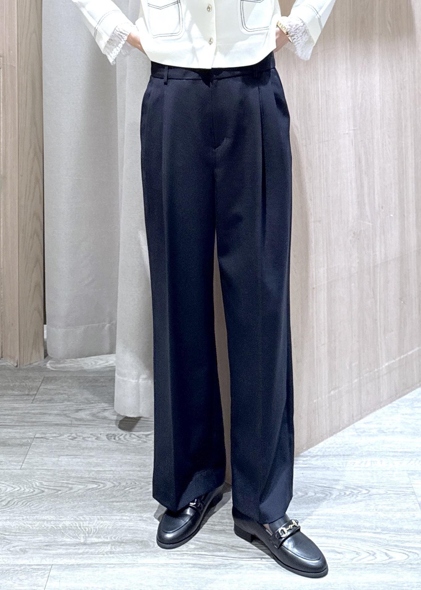今回はツータック仕様になったのでより腰回りの可動が楽ですが、そんなに広がり過ぎずスッキリしたシルエットなので、オフィスから普段使いまで着回せます◎