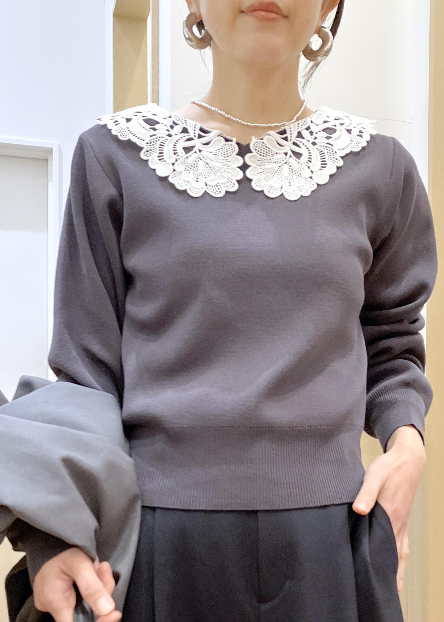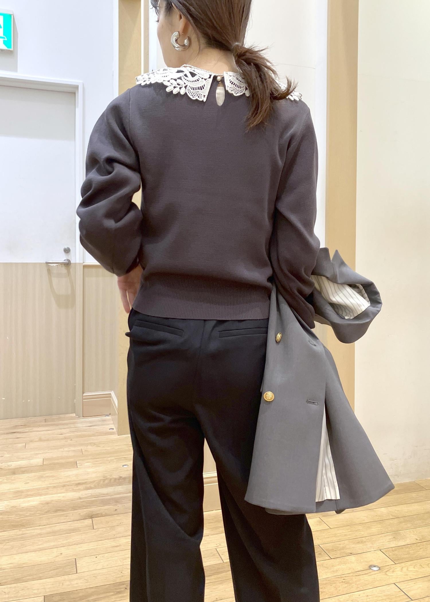 VISレースカラーニットプルオーバー/イージーケアチャコール / F¥6,589レビュー襟元のレースか華やかな春ニットです。