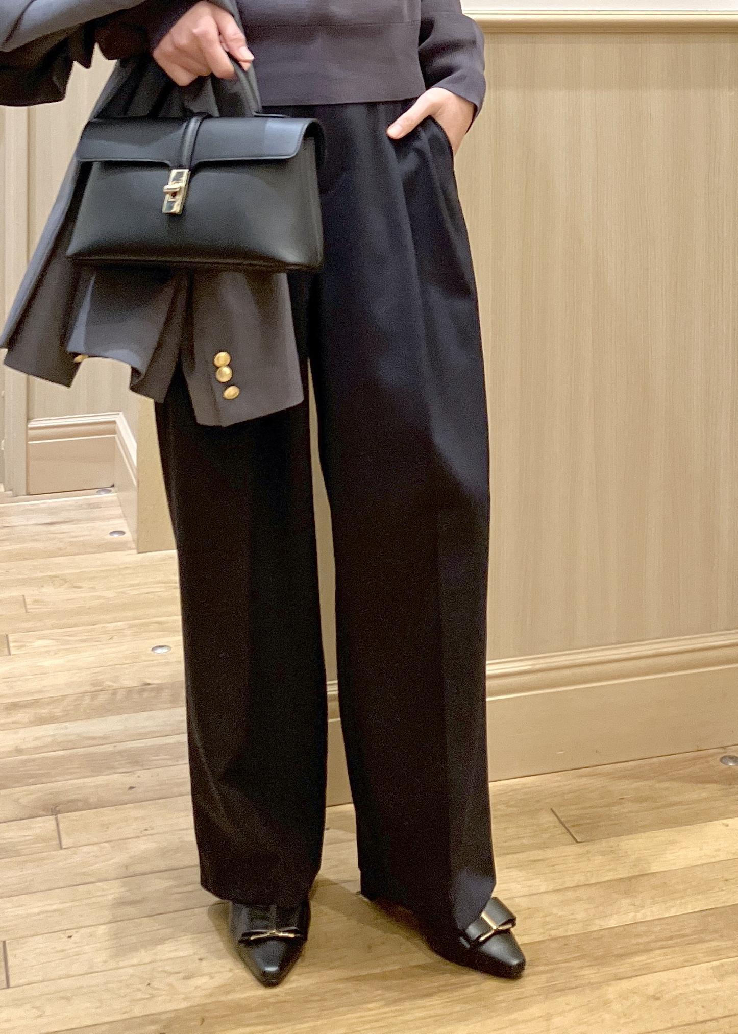 SSサイズ着用ですと、着丈がスッキリし過ぎてしまいSサイズに変更しました。ウエスト横のボタンを使って調整して着用して丁度良いシルエットでした。柔らかくて軽めの素材感は着心地◎ -
