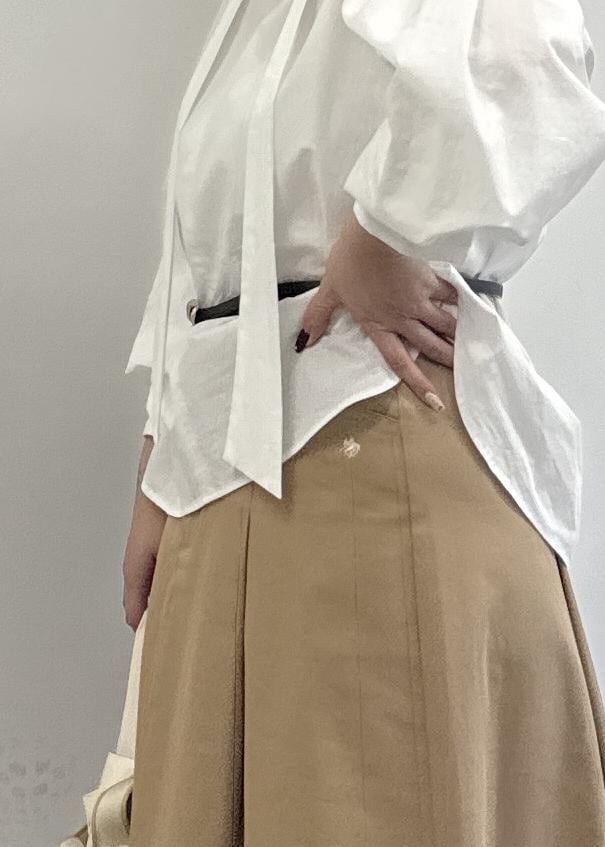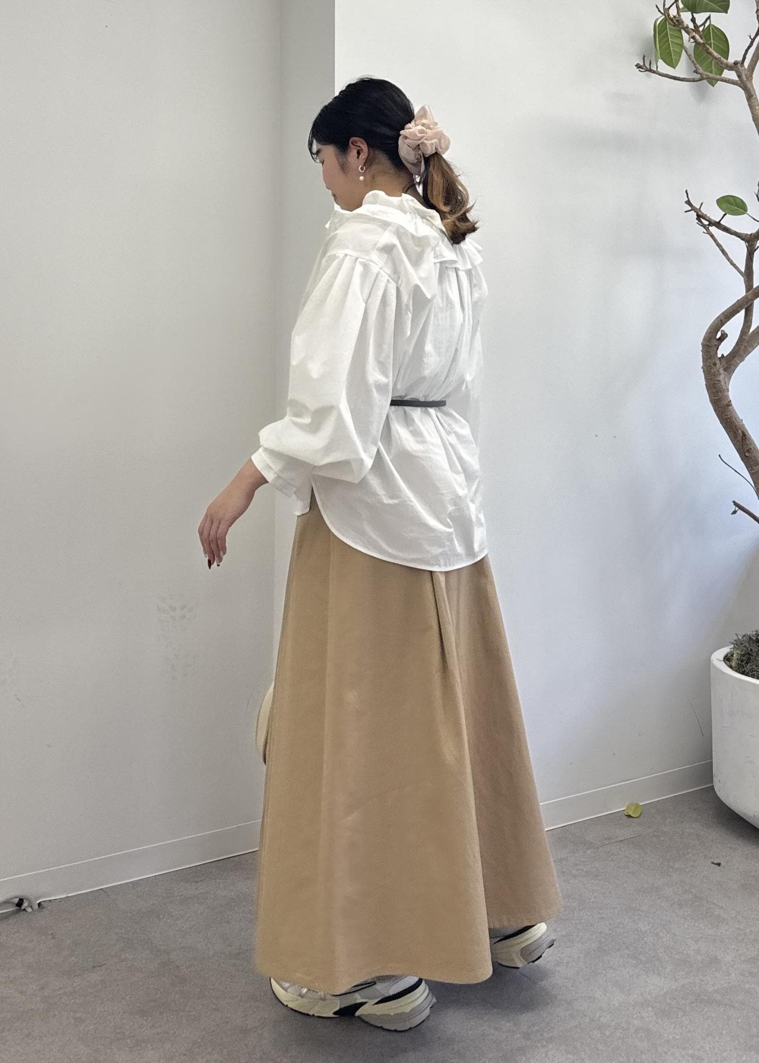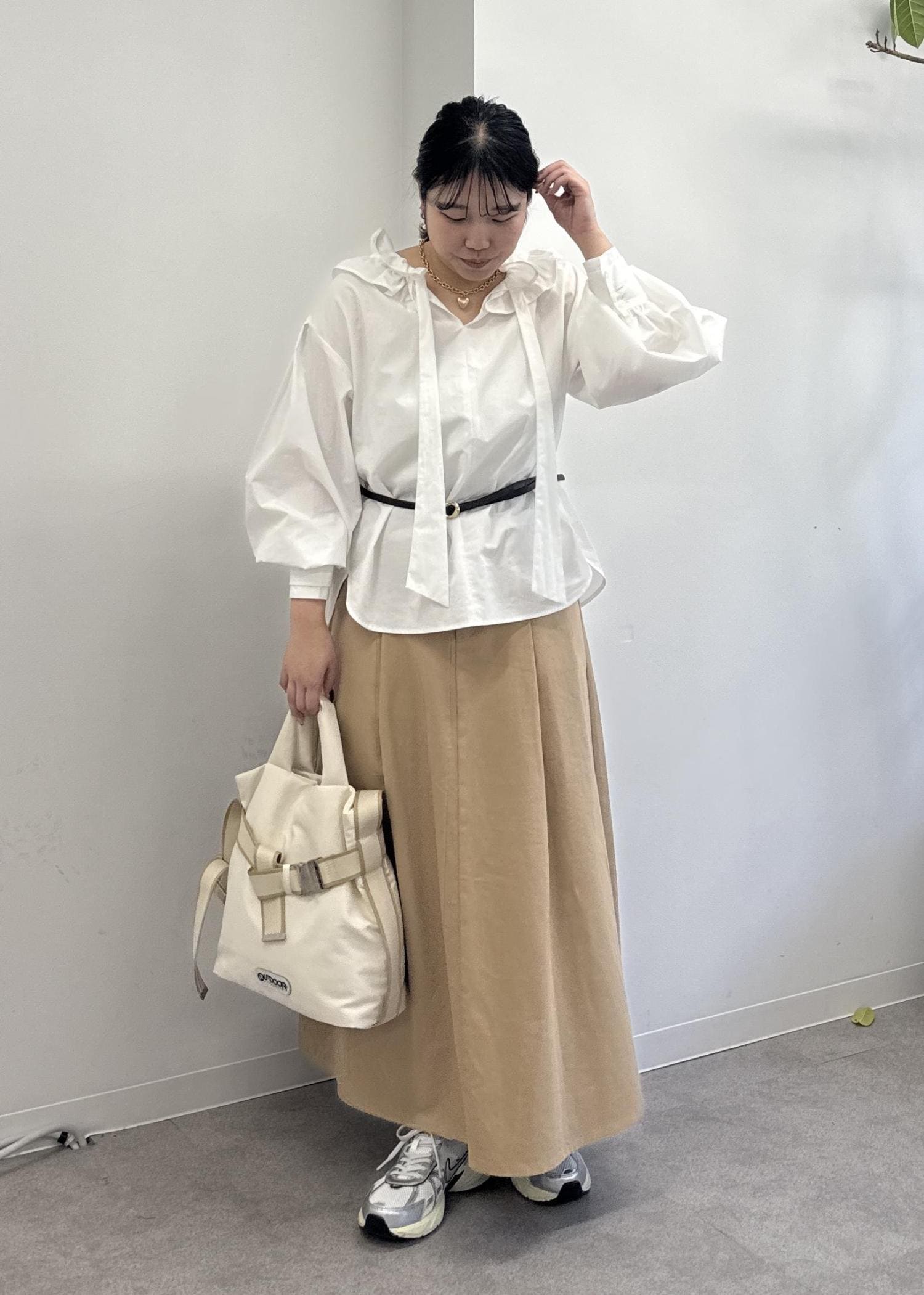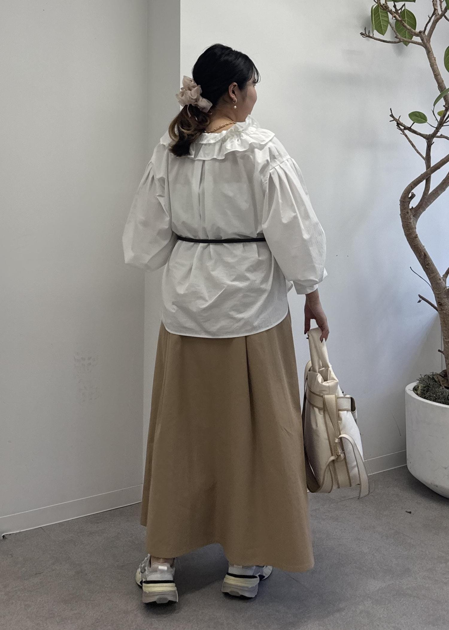 私は骨格ストレートなのでブラウスをインスタイルで合わせると、ブラウスの面積が少なくなってしまい詰まってる印象になってしまったので、アウトスタイルで合わせました◎