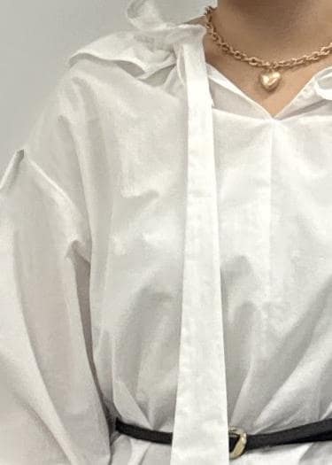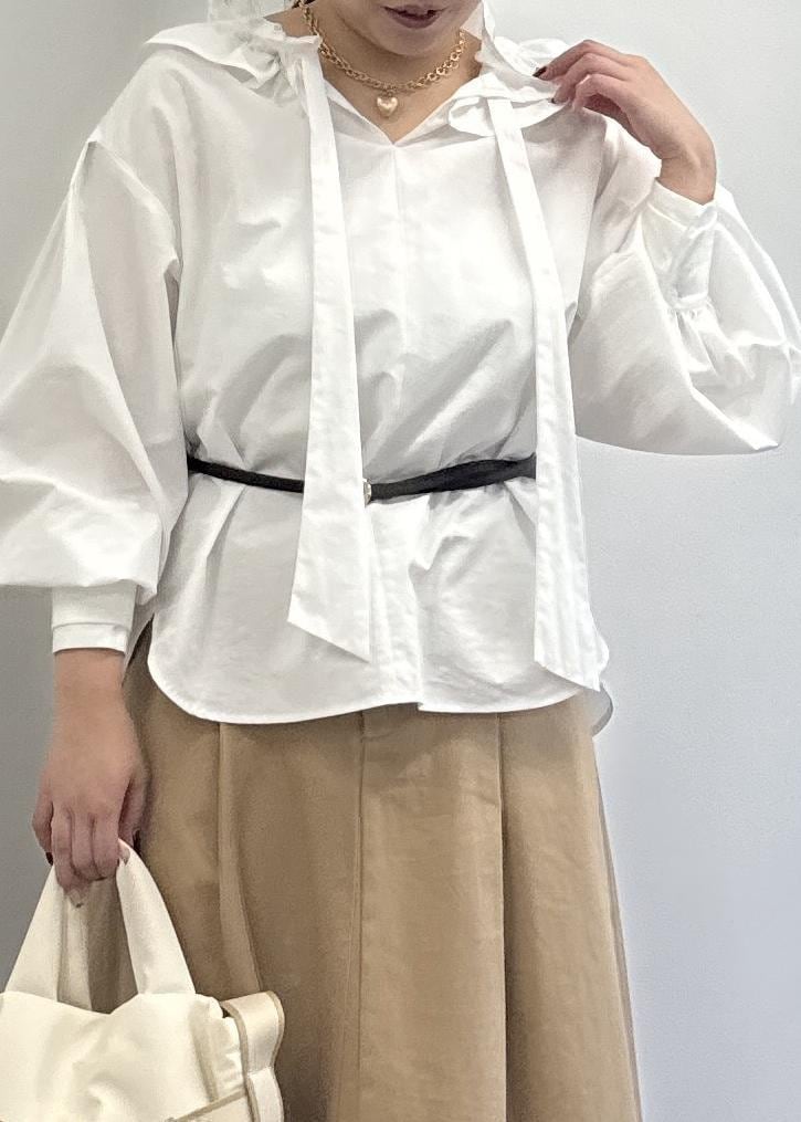 骨格ストレートで肩にボリュームが出てしまうのですが、リボンは結ばず垂らして抜け感を出すとスッキリ着れました◎ -