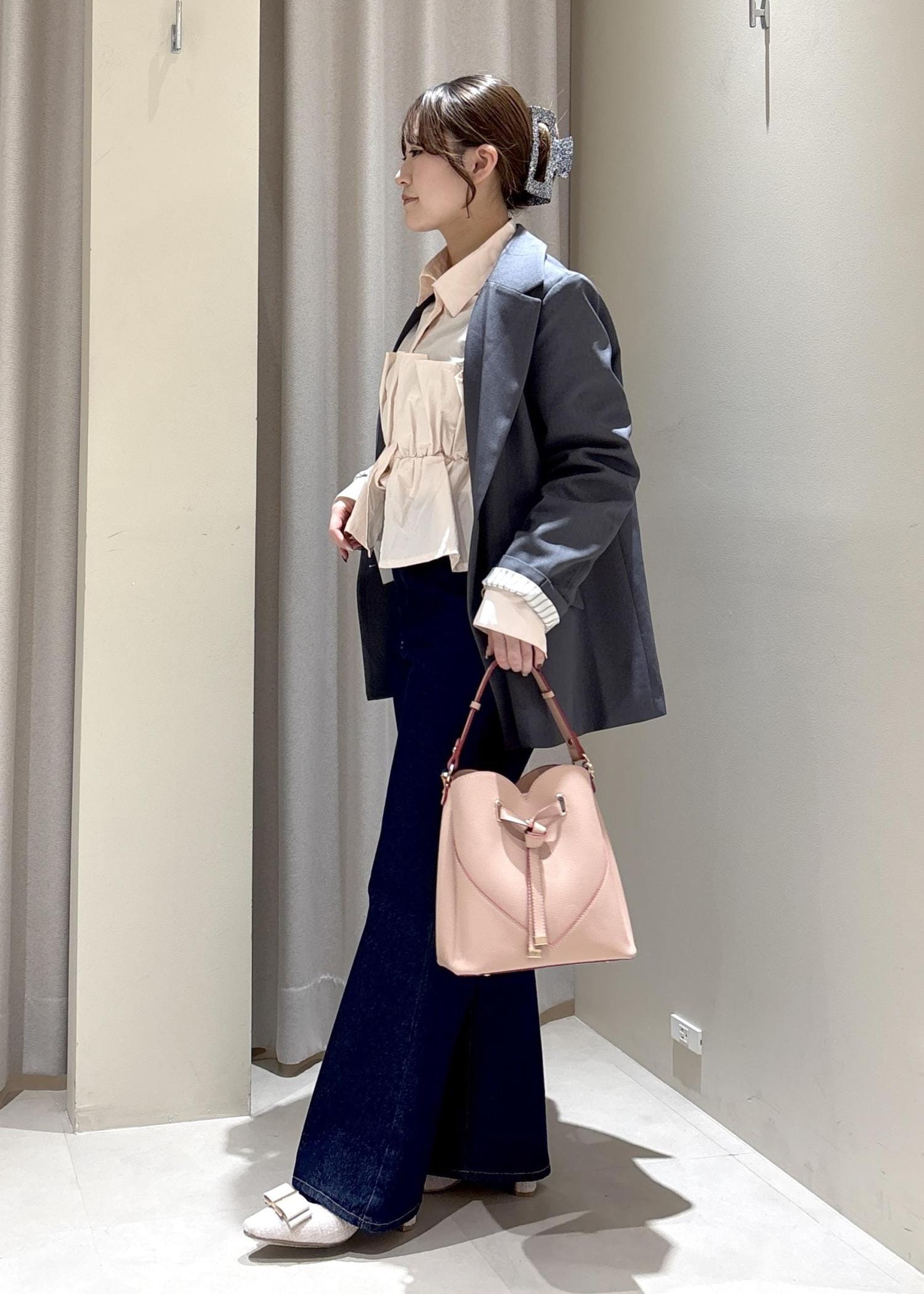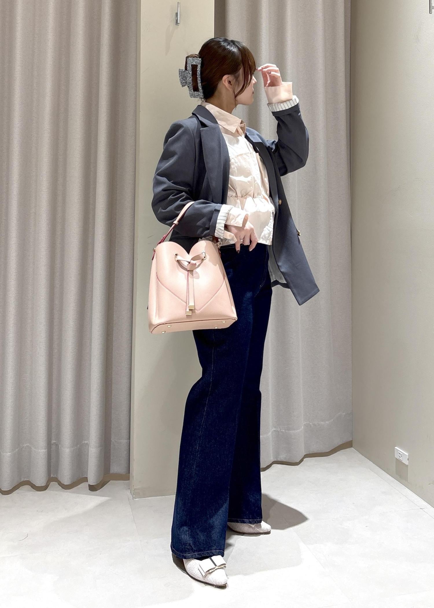 ピンクのシャツと合わせてバッグもピンクのハートバッグで、デートにもおすすめです!