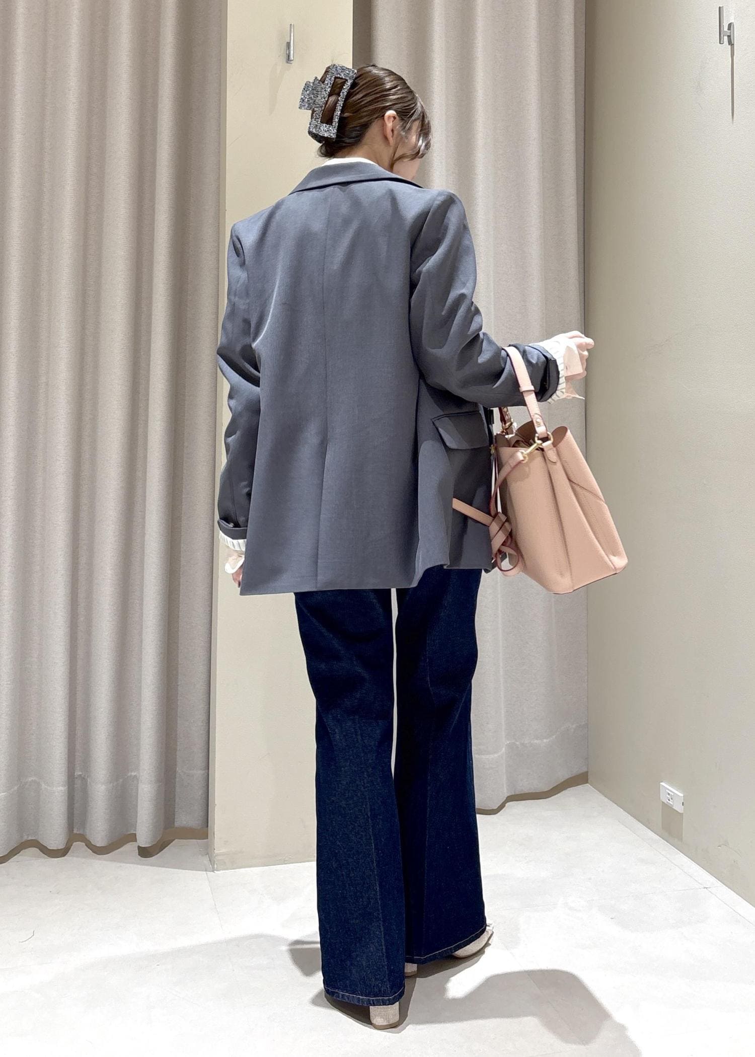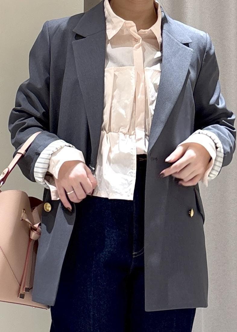 新色のピンクシャツとグレージャケット、デニム合わせの綺麗めカジュアルコーデです!