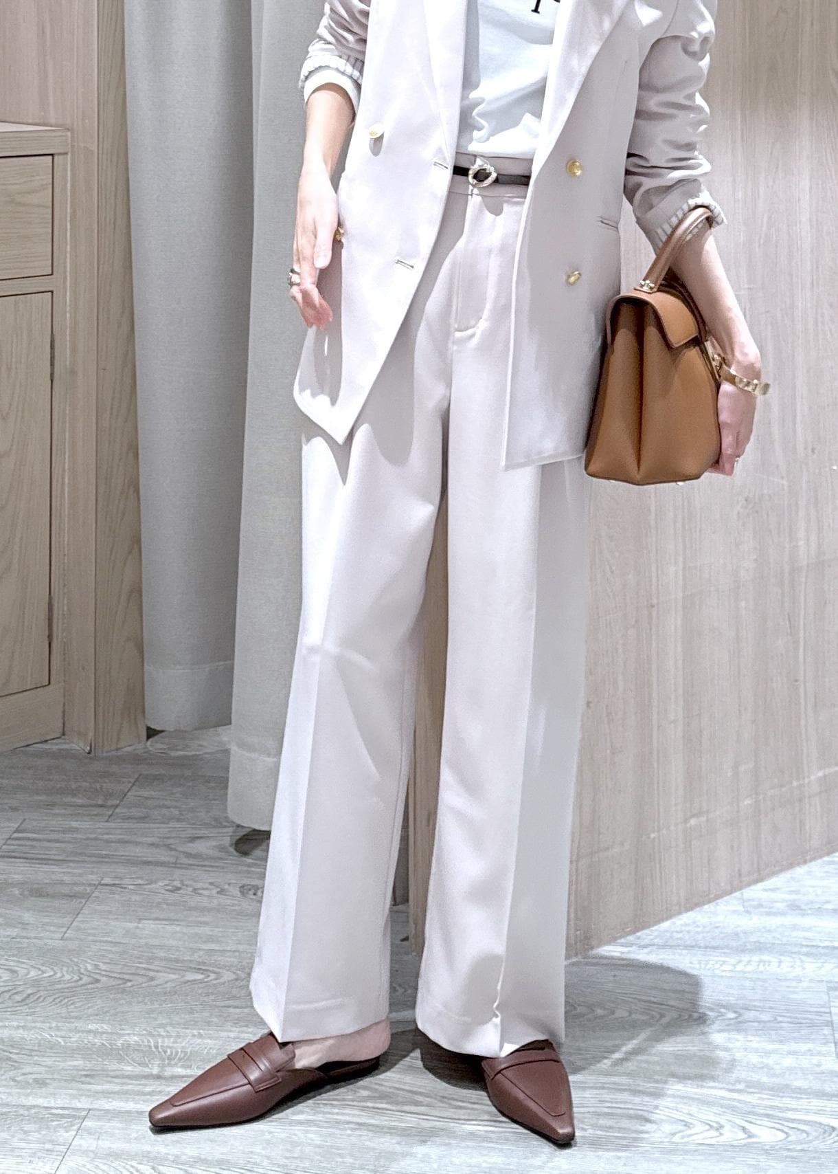 今回はツータック仕様になったのでより腰回りの可動が楽ですが、そんなに広がり過ぎずスッキリしたシルエットなので、オフィスから普段使いまで着回せます◎
