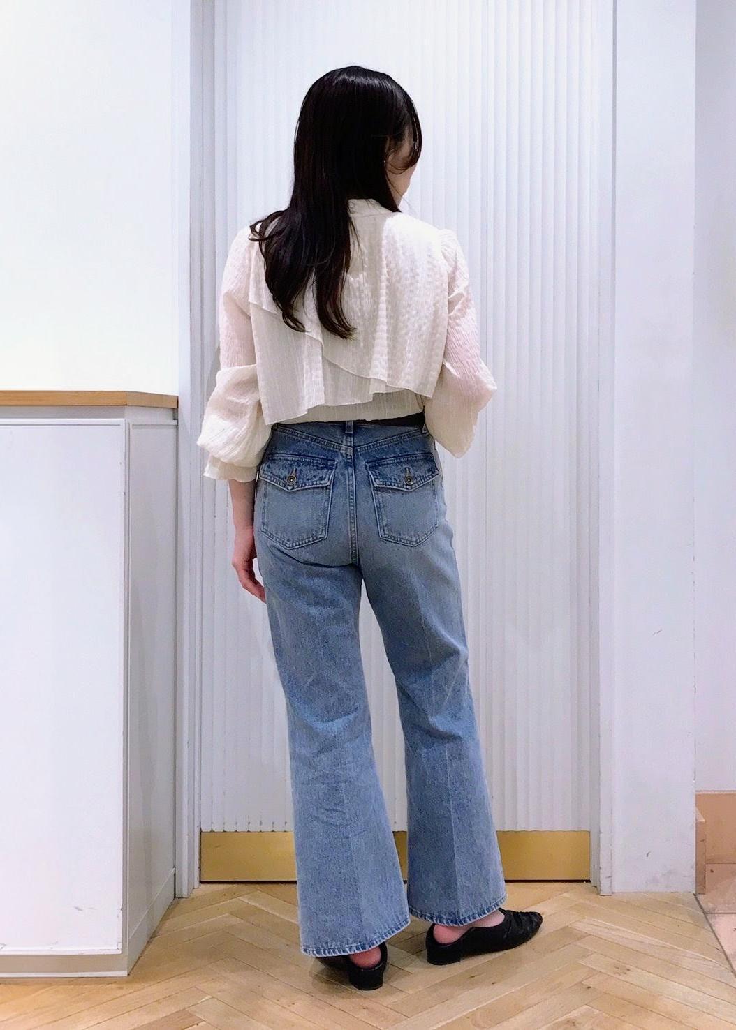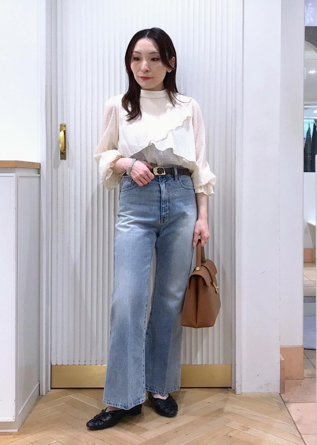 たっぷりのフリルが華やかなブラウスをデニム合わせでデイリーに。