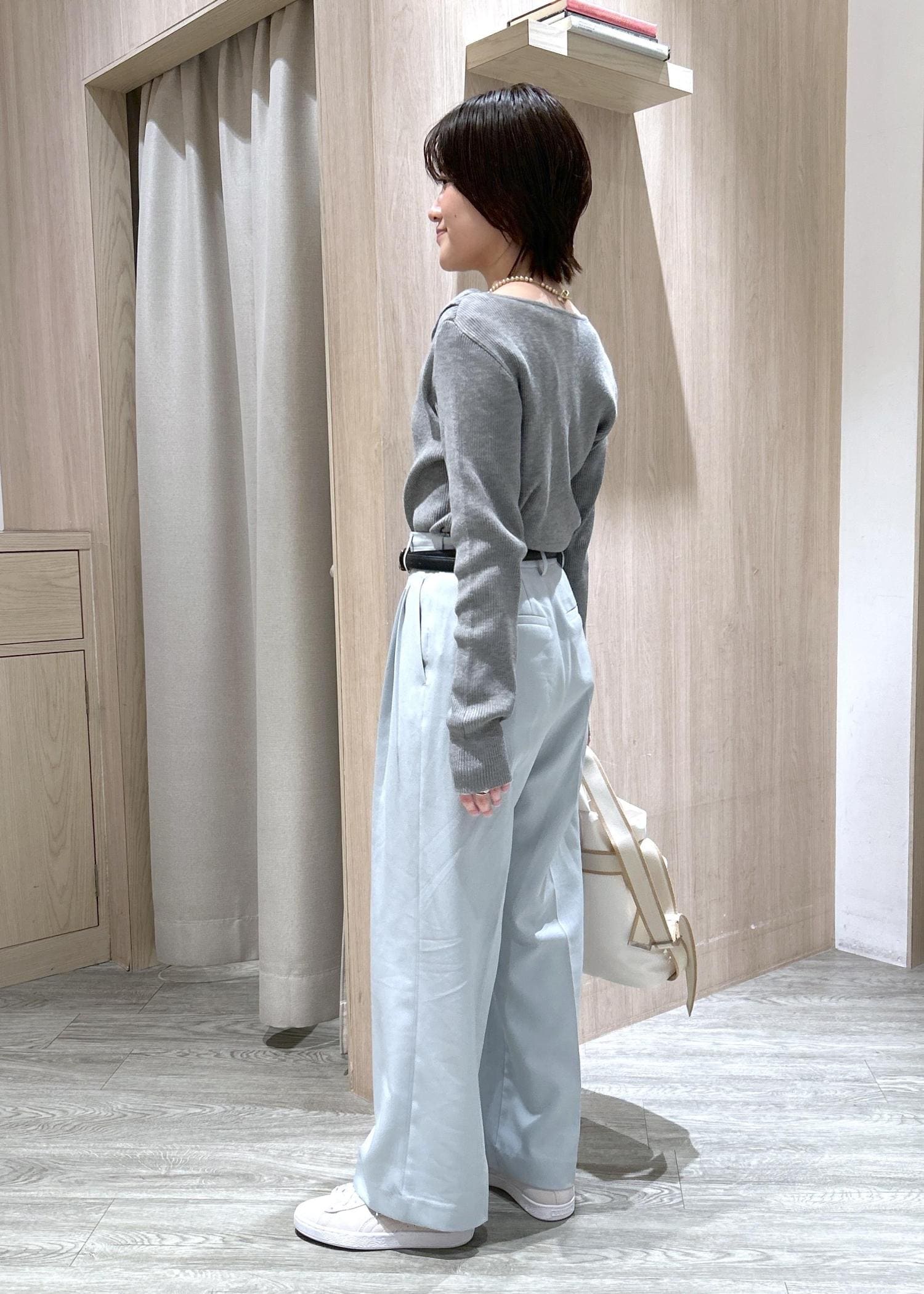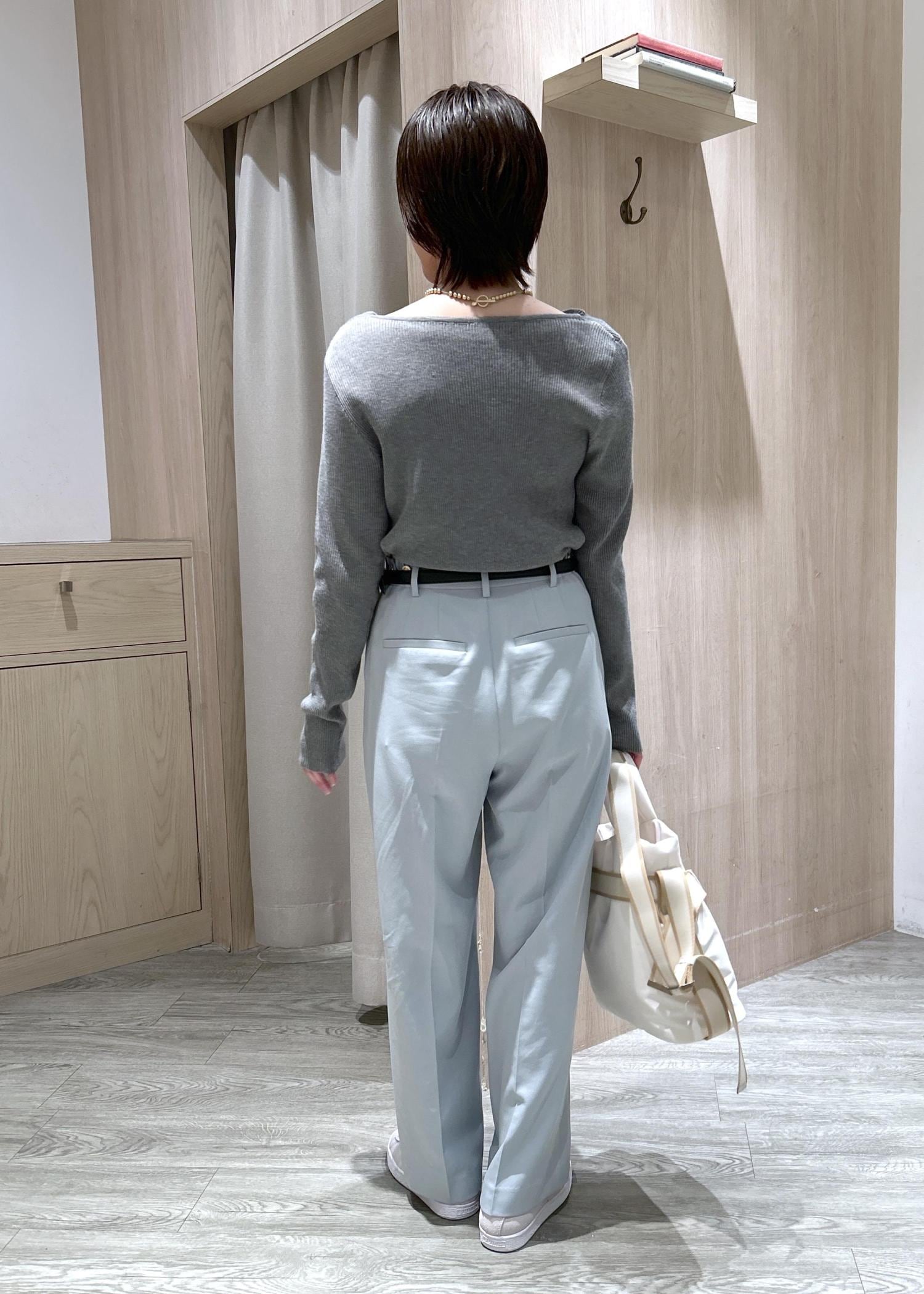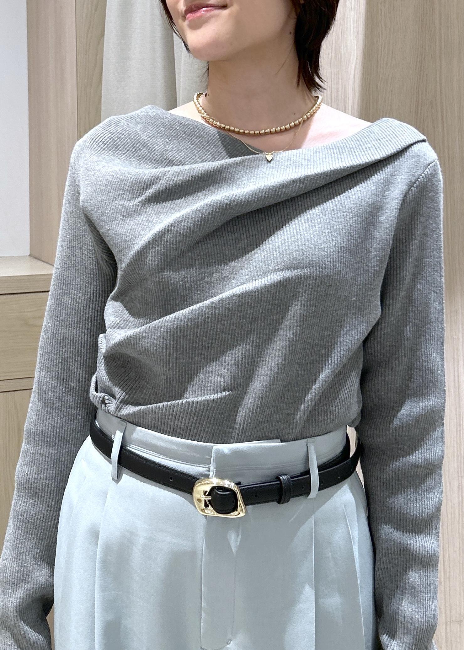 NEW!VISドレープオフショルダーリブニット/イージーケアグレー / F¥4,389レビューネックの空きも深くなく、デコルテがキレイに見えます。
