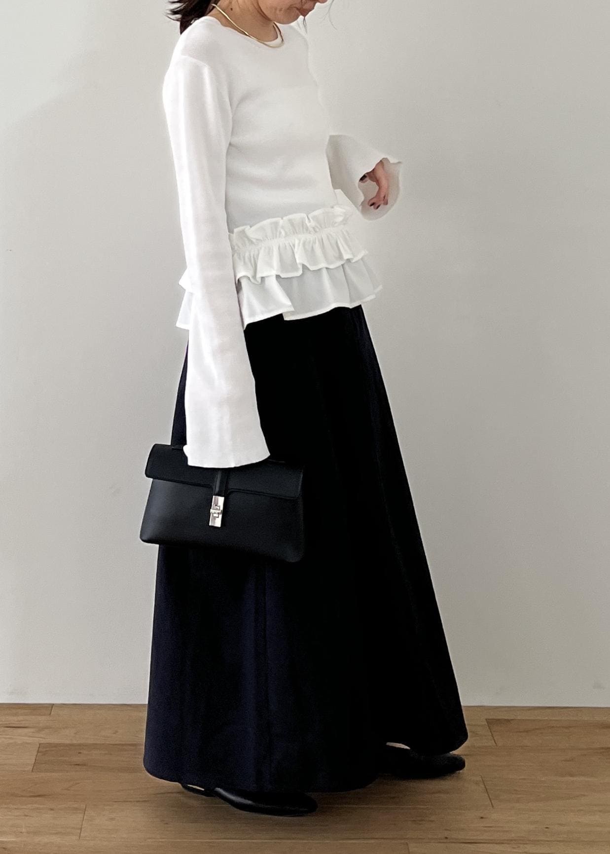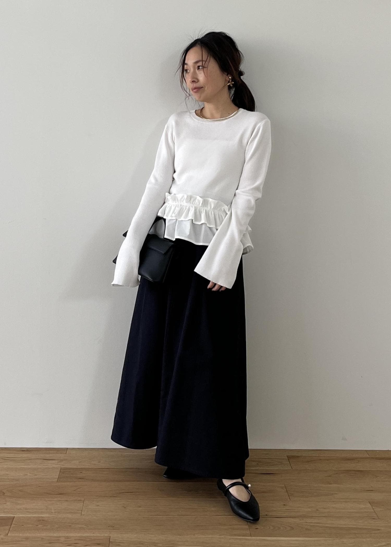 予約VIS裾フリルティアードドッキングニットオフホワイト / F¥5,929レビュー152cmでFサイズ着用し、着丈は腰にかかるくらいのコンパクト丈。身体のラインを拾いすぎない細見えシルエット。シャリ感のある素材のニット✖️シャツフリルの異素材のコンビが高見え◎袖フレアデザインで大人も着られるフリルアイテム。柔らかい素材感でとても着心地よく着膨れることなく細見えしてくれるデザイントップス。こちらはリアルバイ予定です♡