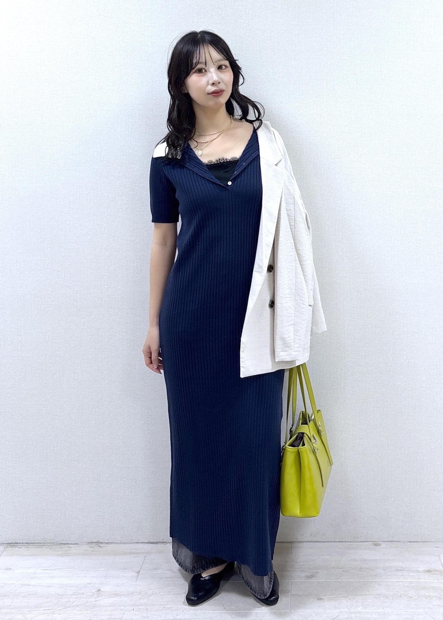 白トップス×ネイビースカートでまとめた