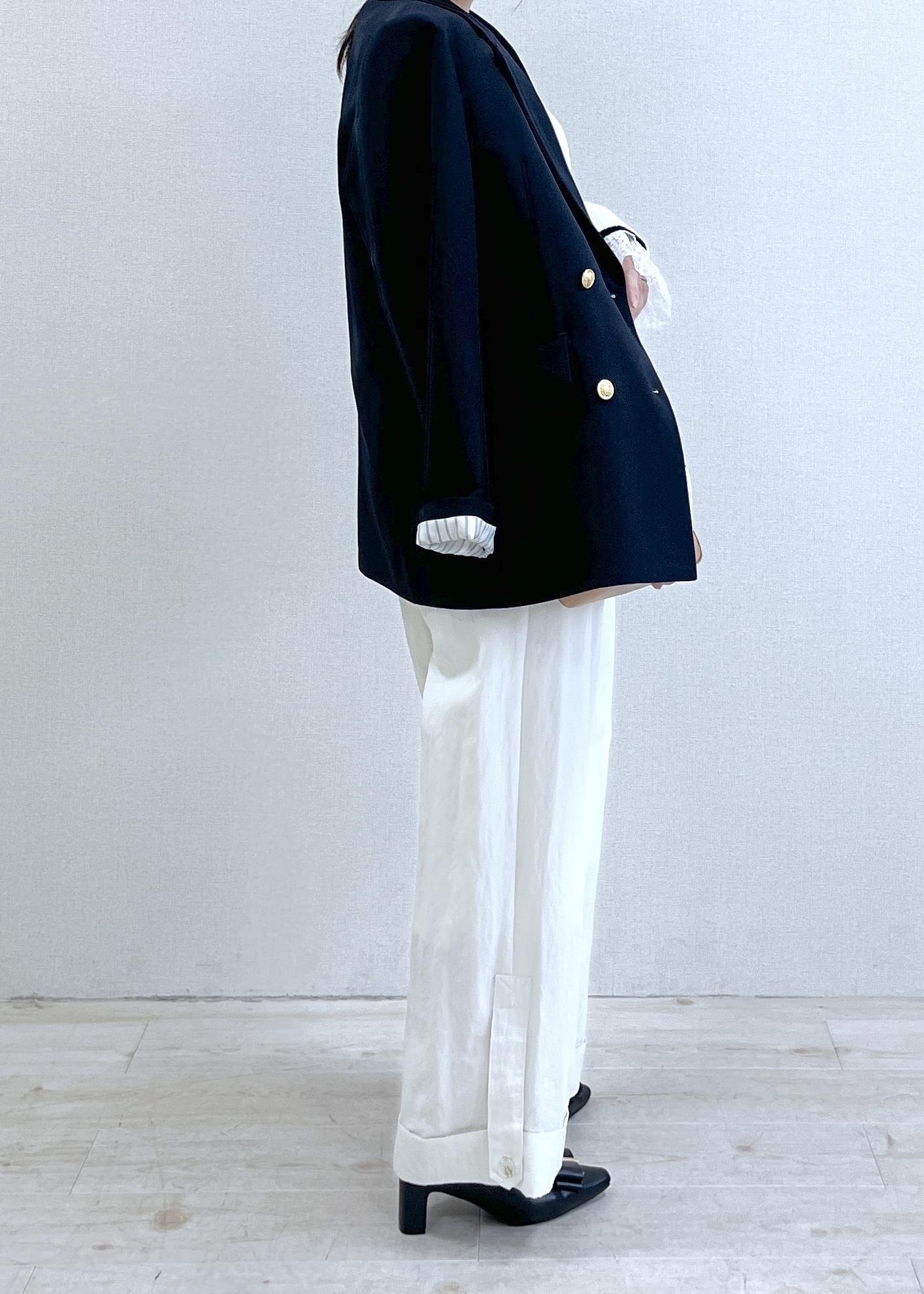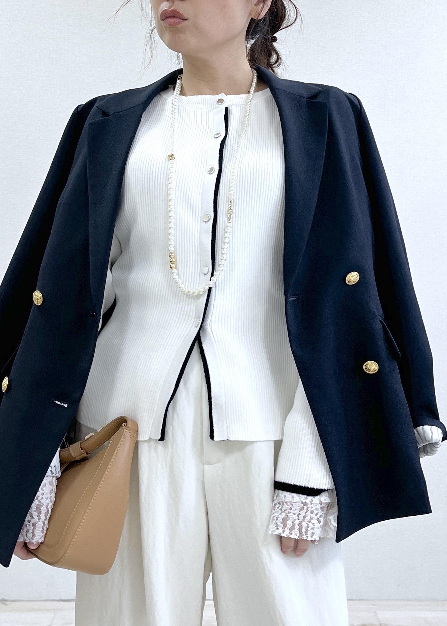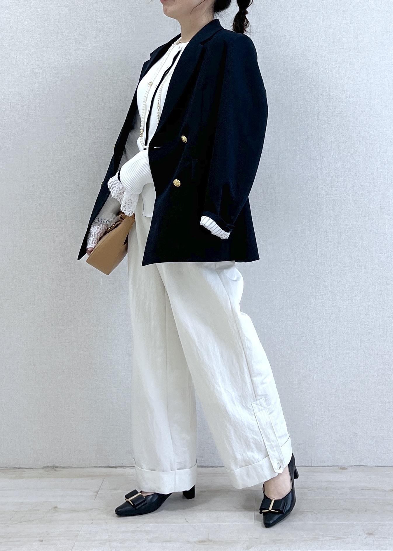 ネイビージャケットで引き締めつつ、