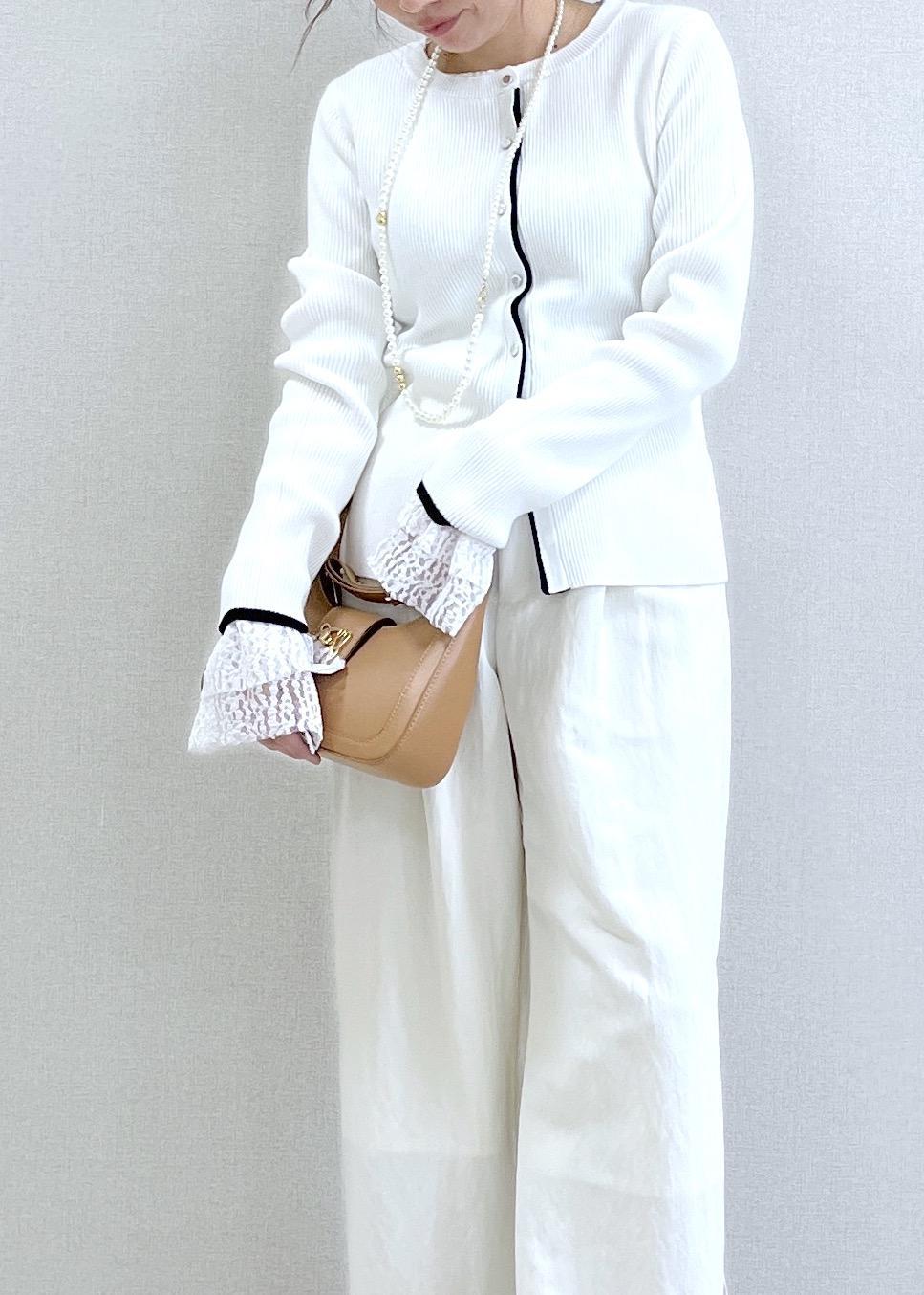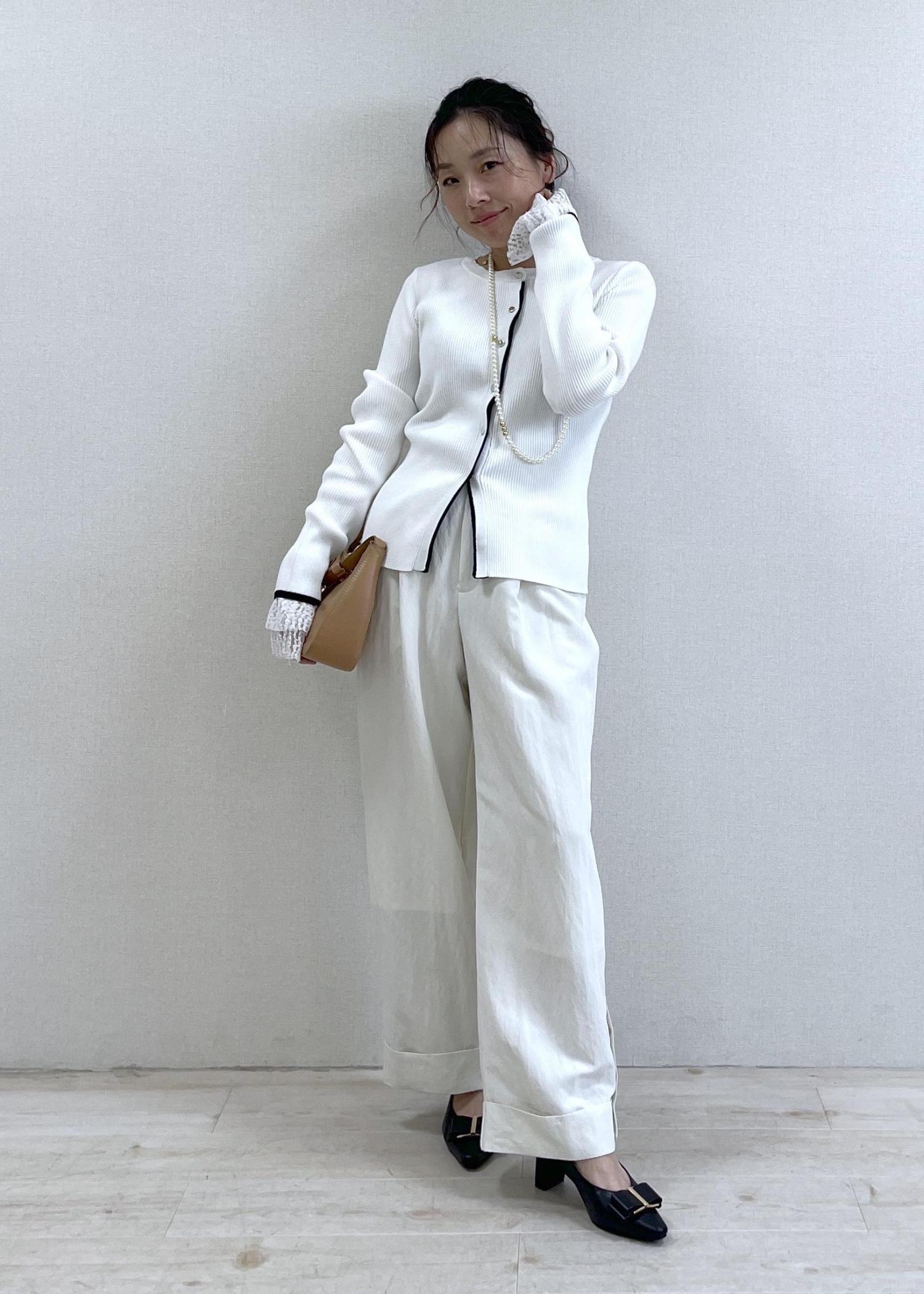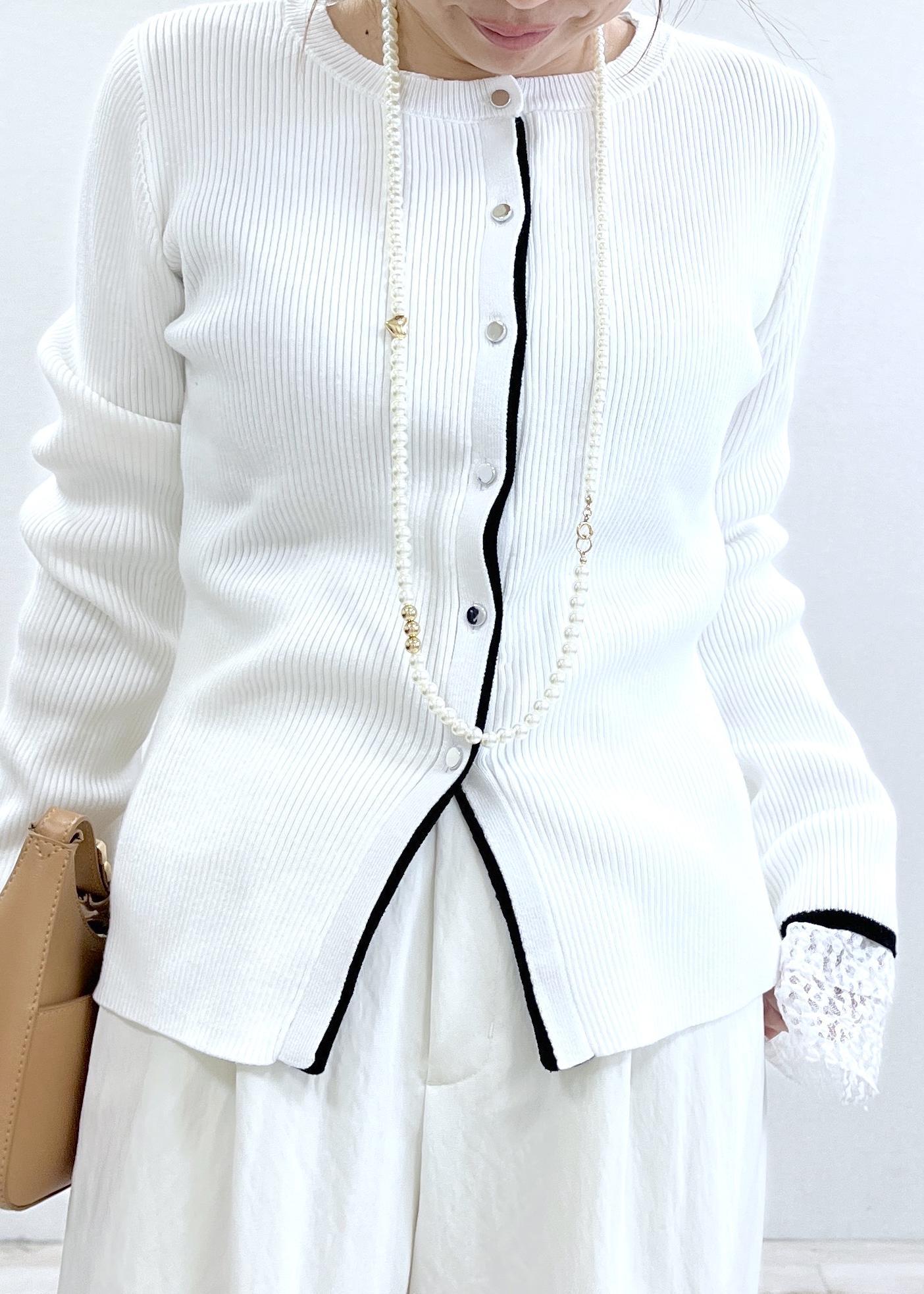 VISバイカラークルーネックカーディガンホワイト系 / F¥5,489レビュー152cmでFサイズ着用し、着丈は腰にかかるくらいの丈。程よく身体にフィットしてくれるすっきりサイズ。収縮性があり、シャリ感のある素材感は春先までお召しいただけます。シンプルながらも、バイカラーになっているのでアクセントにもなり、のっぺりしません!目線が中央に集中するので、細見えさせてくれるカーデです。