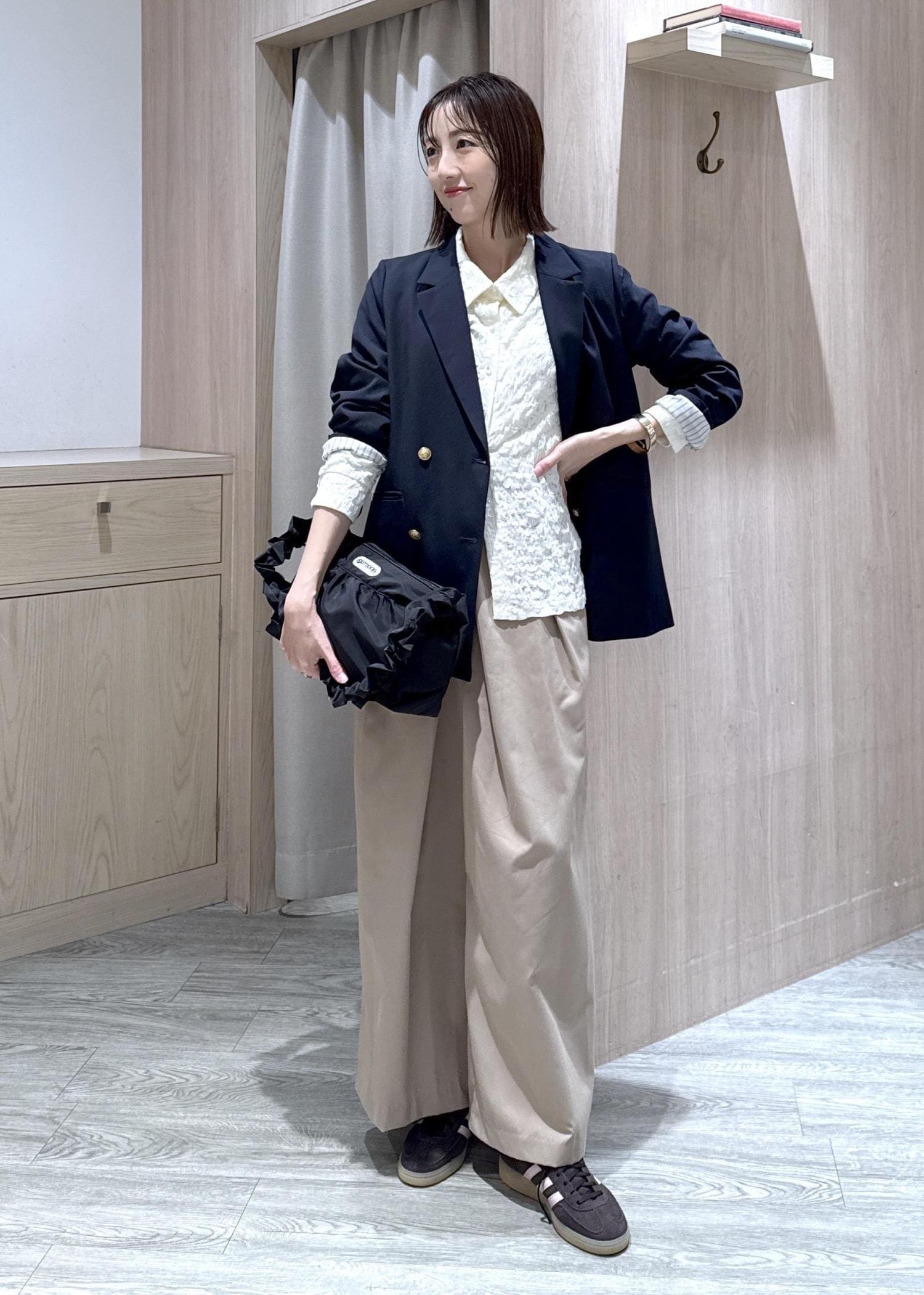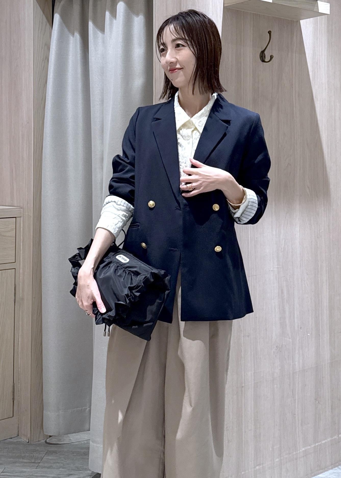 ダブルボタンのジャケットスタイルに小物でカジュアルテイストをプラスして、大人のキレイめカジュアルスタイルです♪