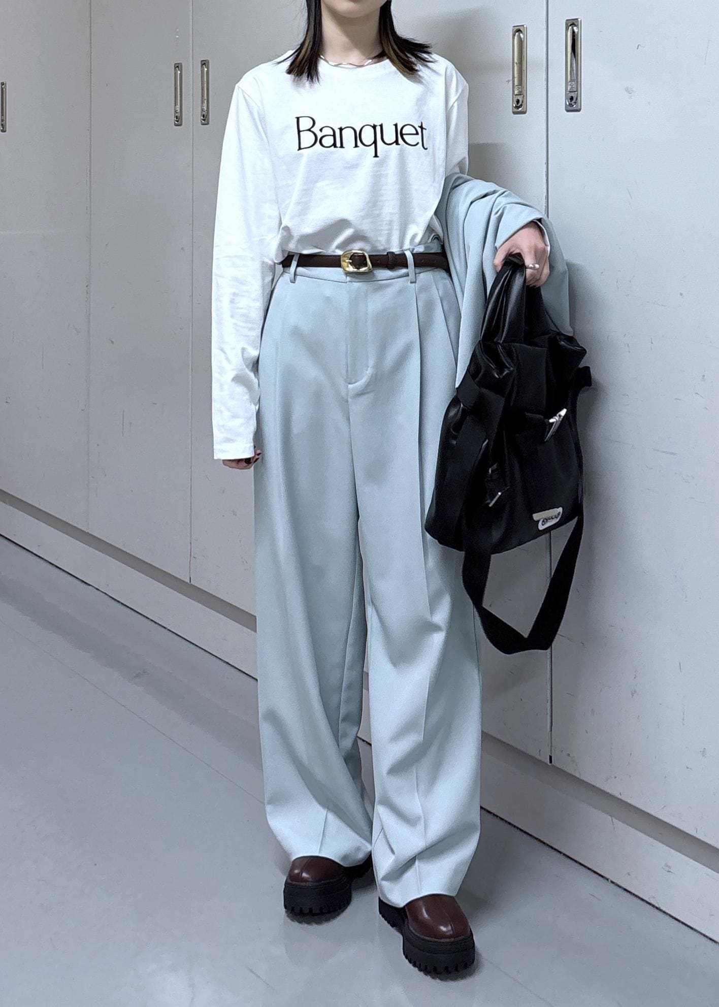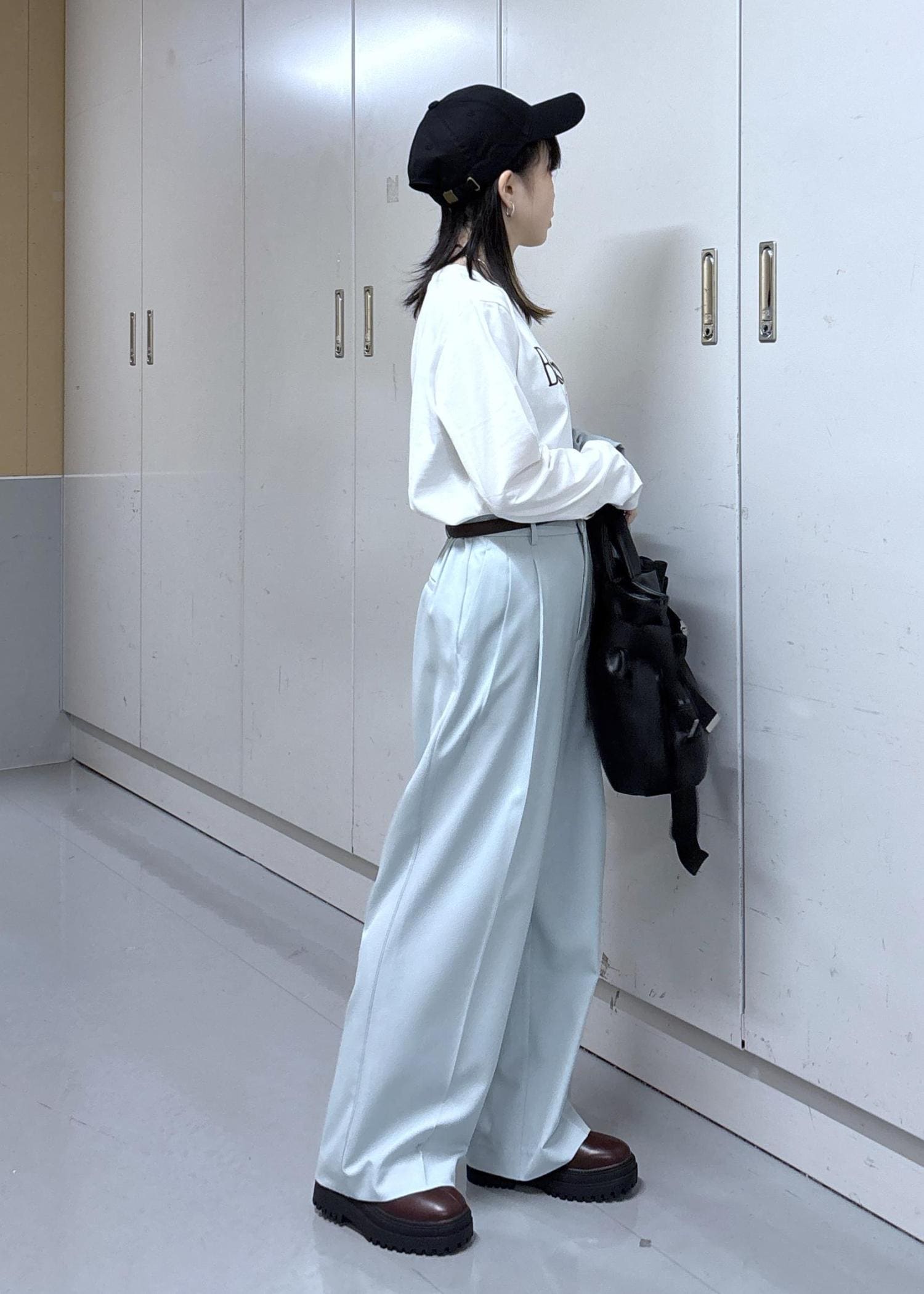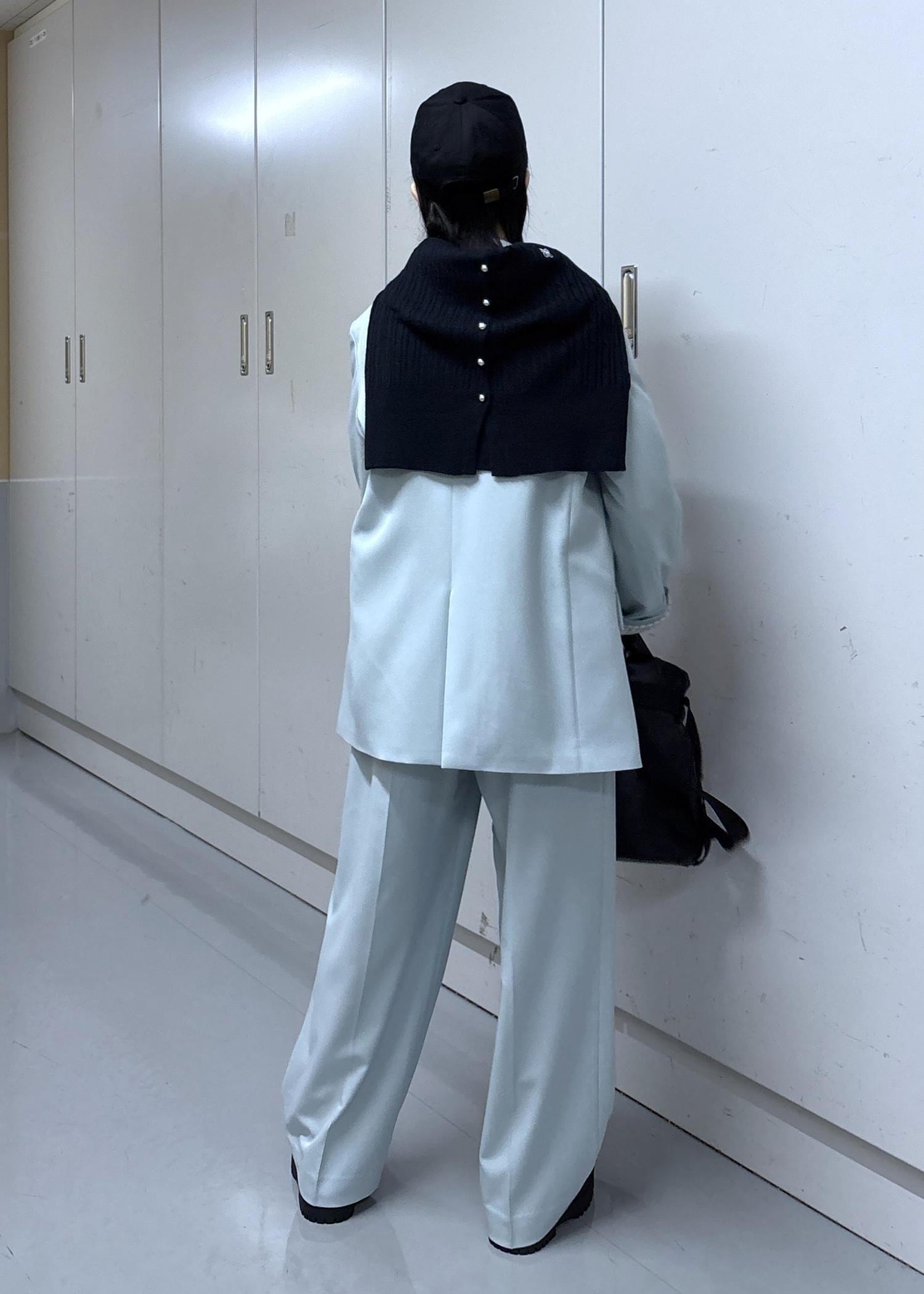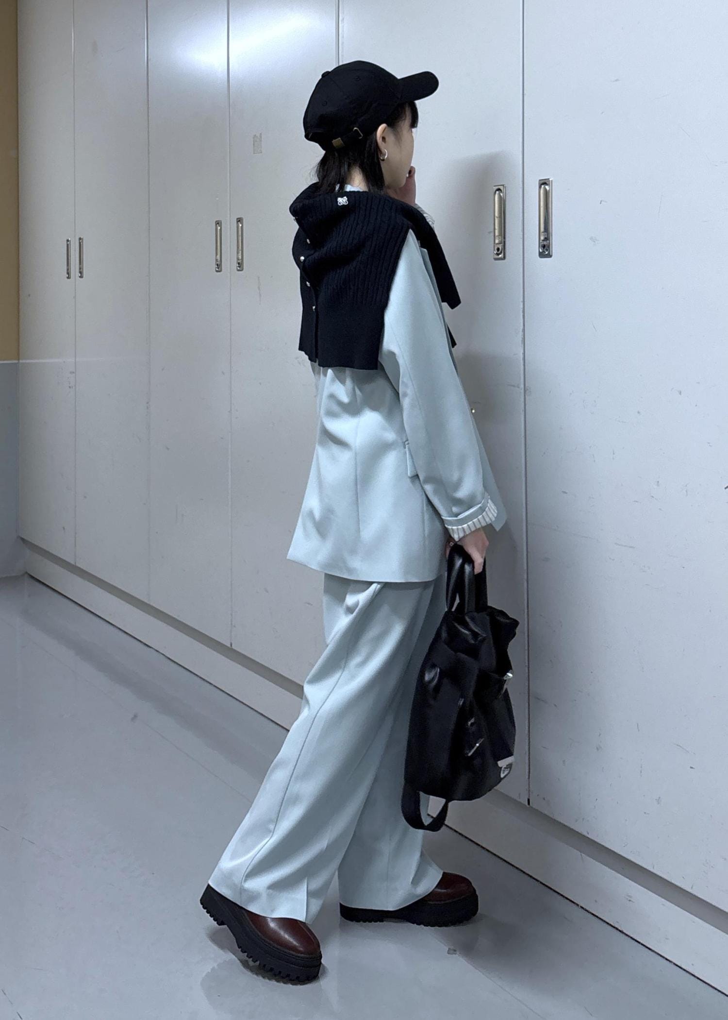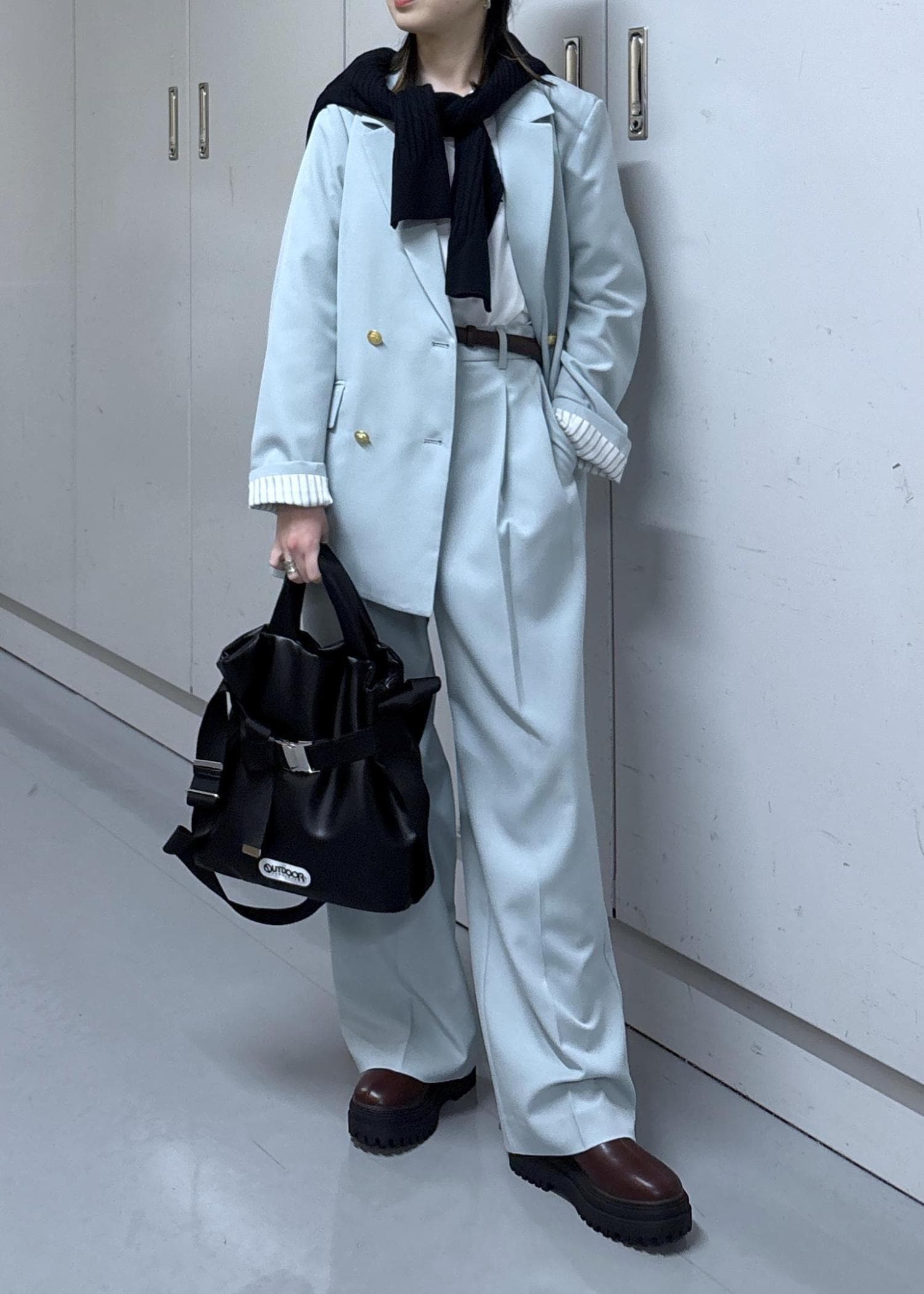 お仕事感を出したくなくて、ジャケットパンツどちらもMサイズを着用してゆったりカジュアルな印象にしました◎