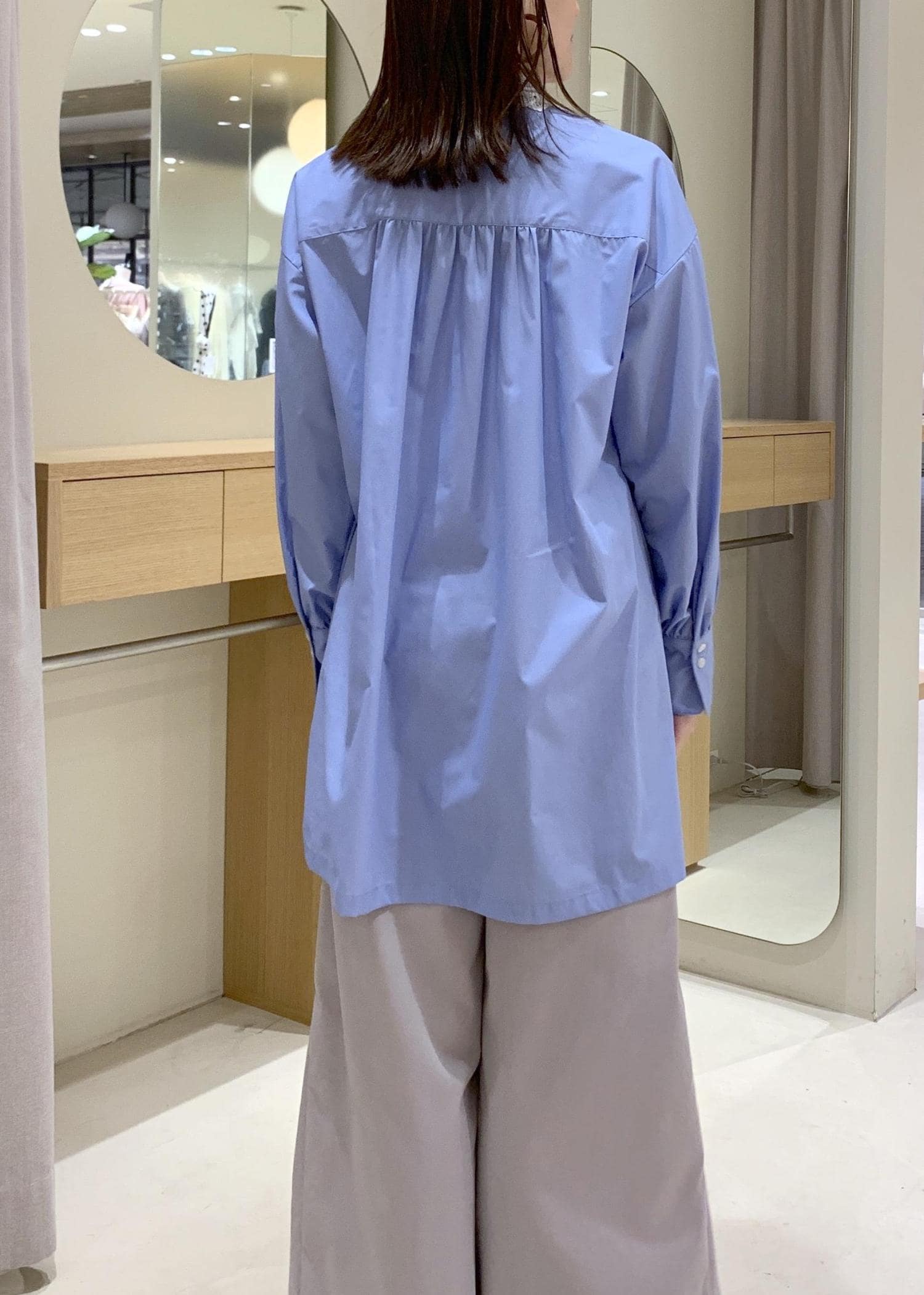 少し後ろに抜いて着用すると、こなれ感と首元の抜け感が出せますよ。 -