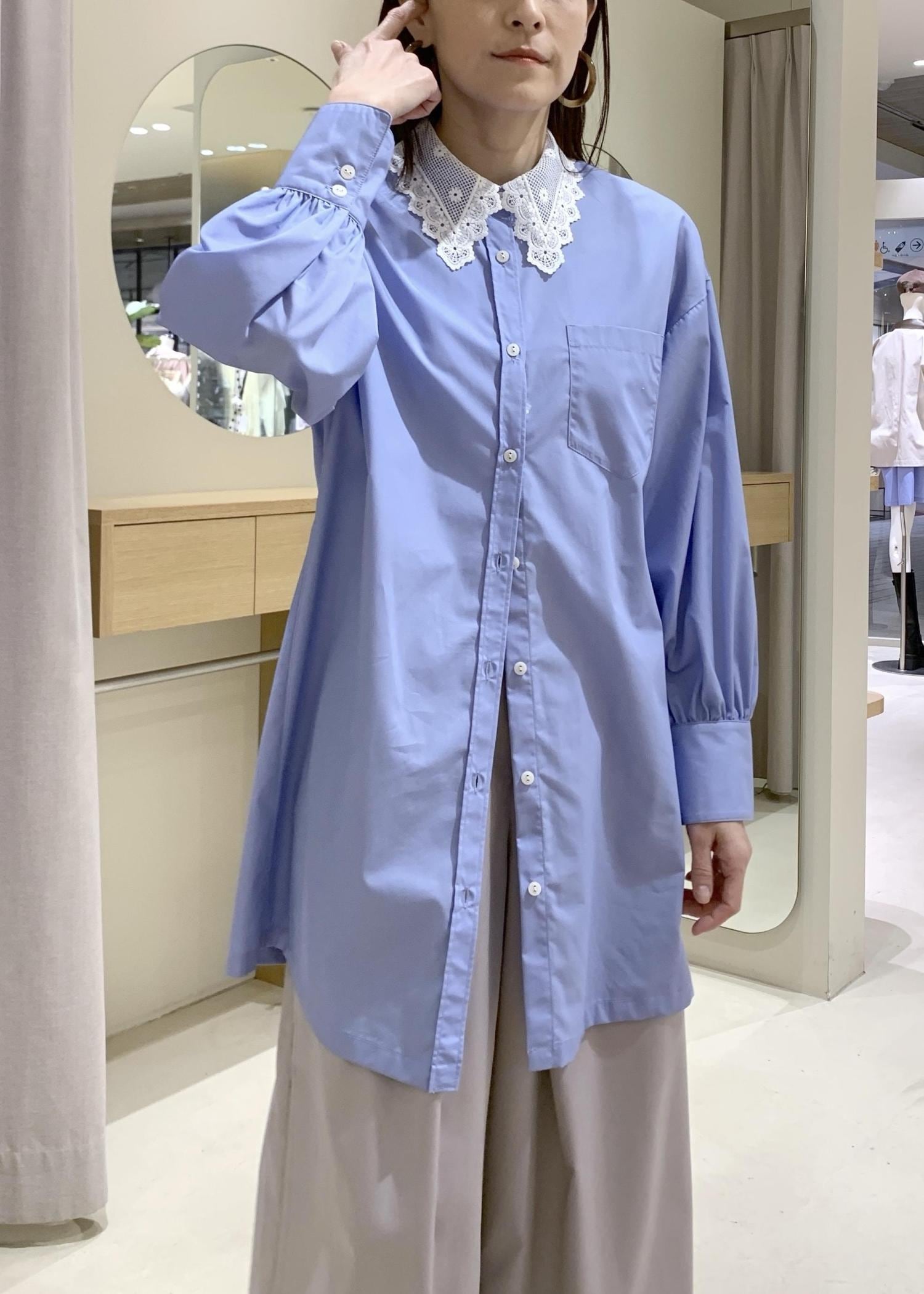 VIS襟レース付きミニ丈シャツワンピサックス / F¥7,689レビュー襟レースがポイントのシャツワンピースです。