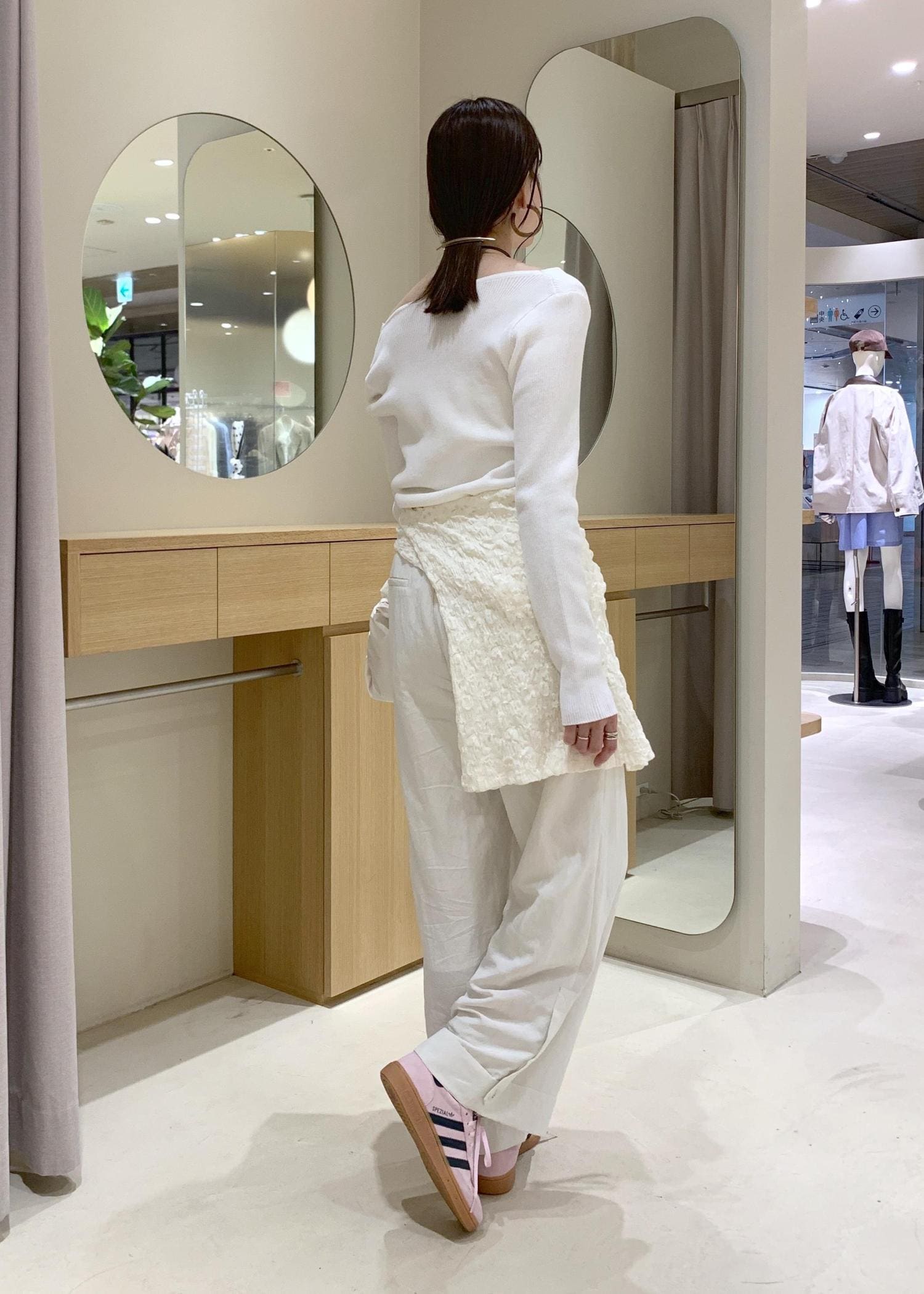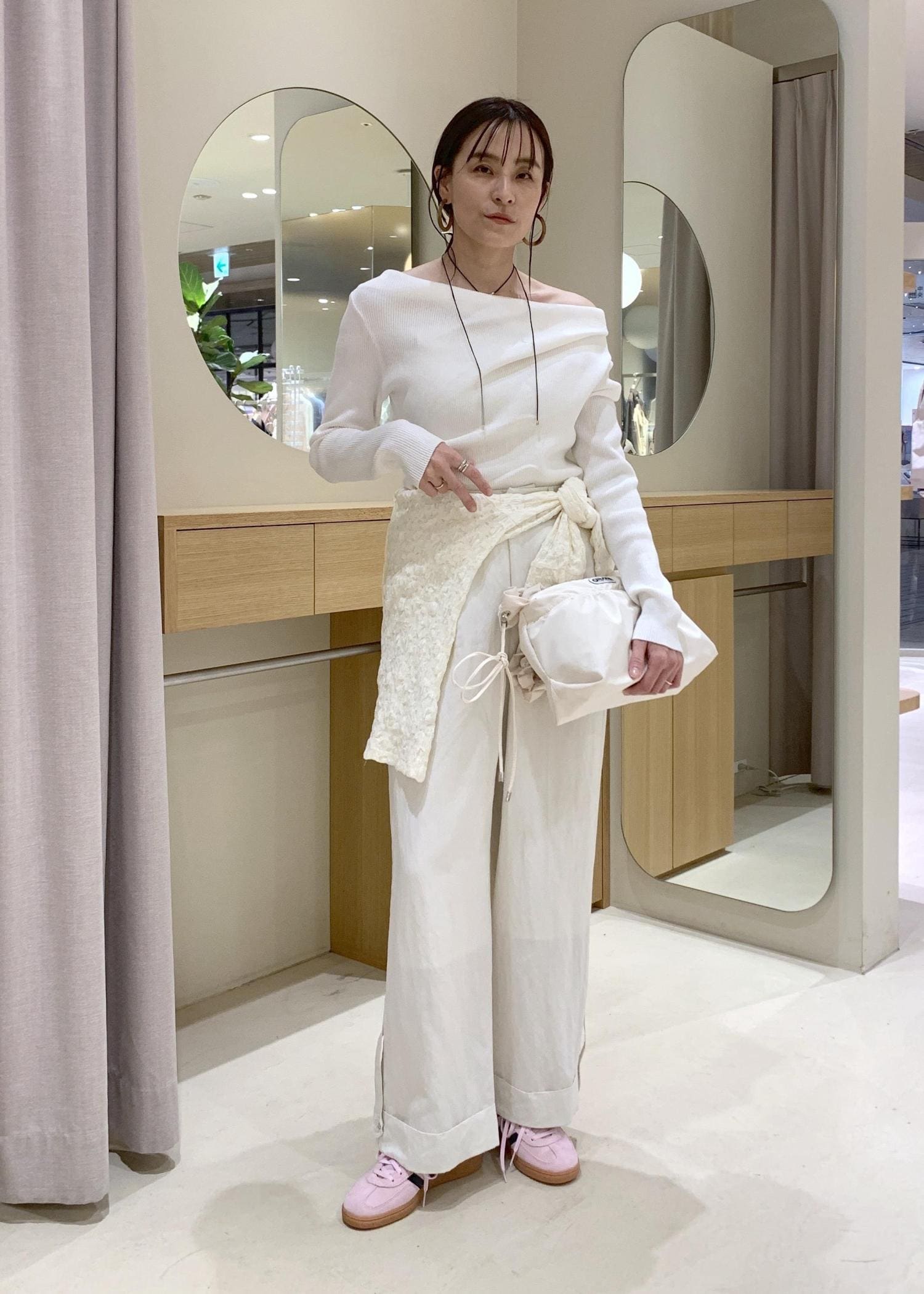 オフショルダー風に肩を落としても着れて、抜け感を出すことができます。