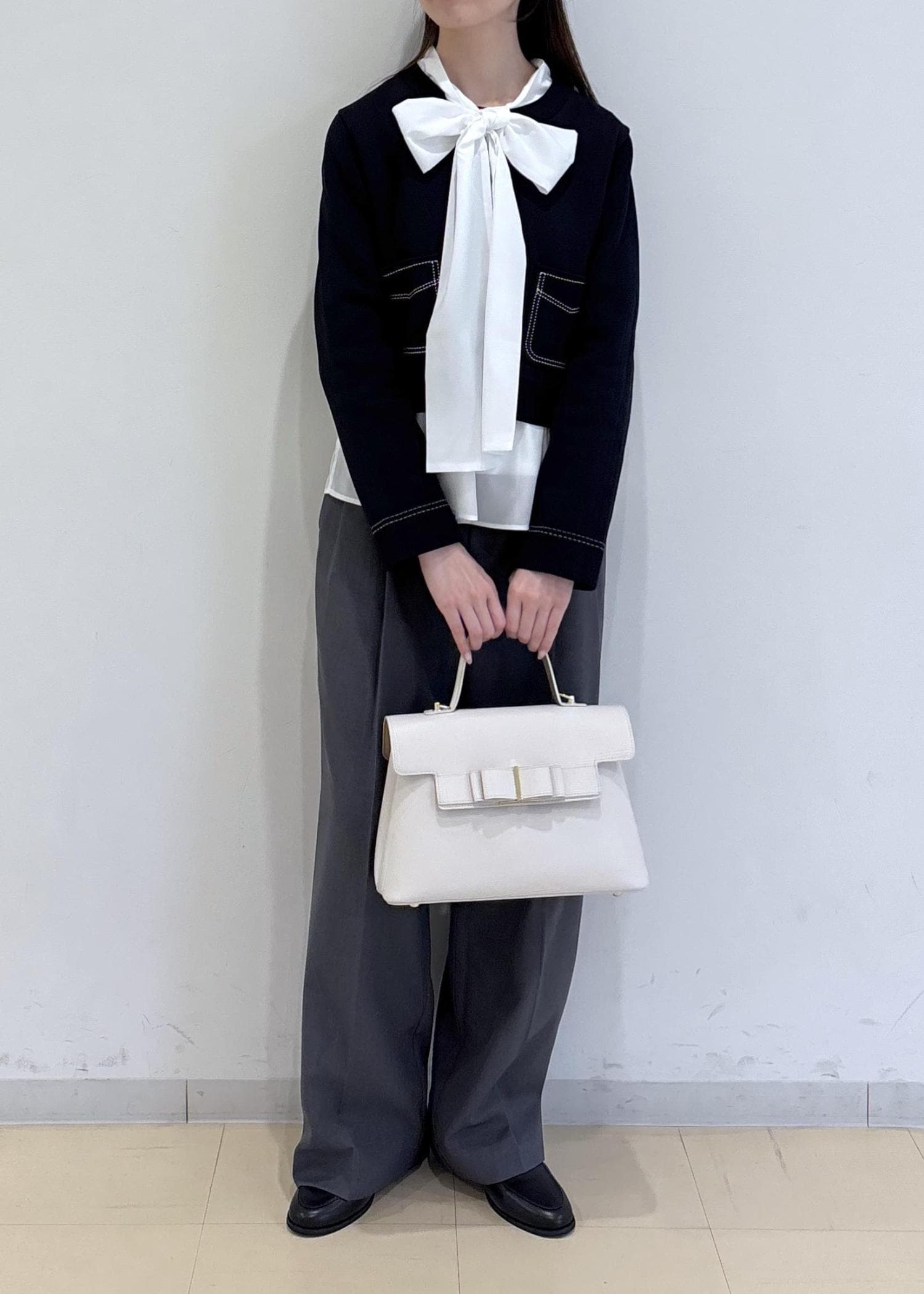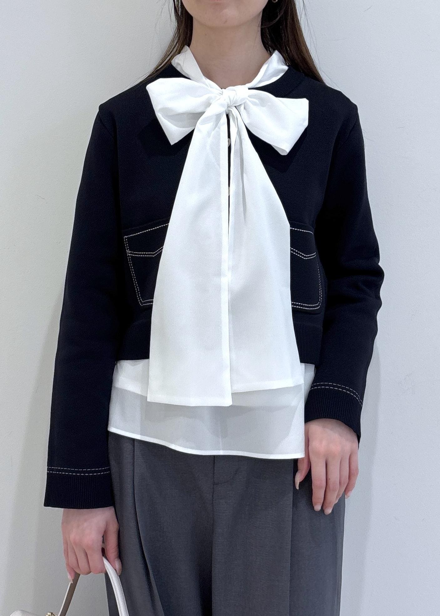 1枚でも可愛いステッチデザインのカーディガンに、ボウタイブラウスを合わせることでシンプルすぎず、より華やかな印象になります。